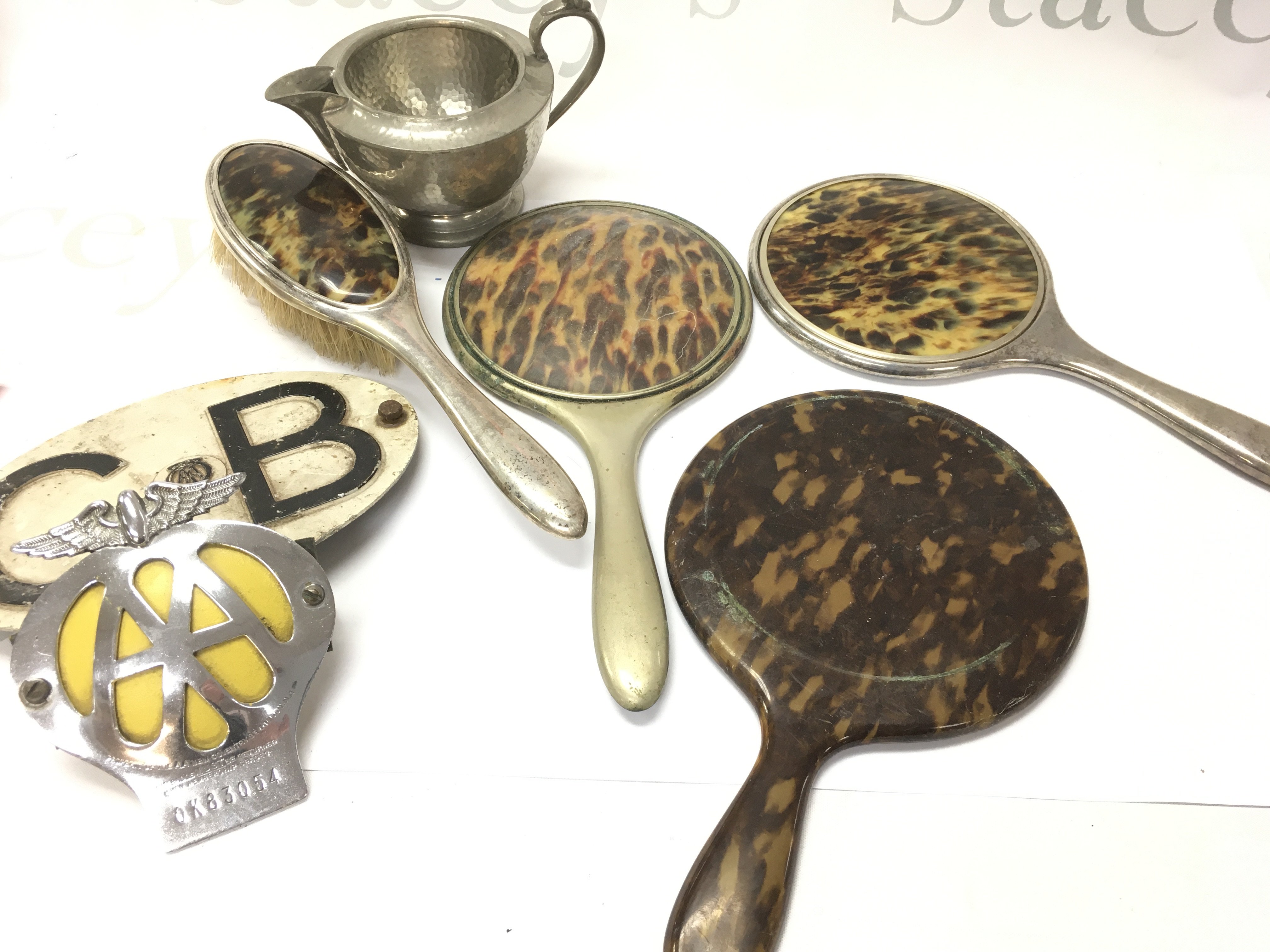 A mixed lot including tortoiseshell mirrors, vintage AA badges,