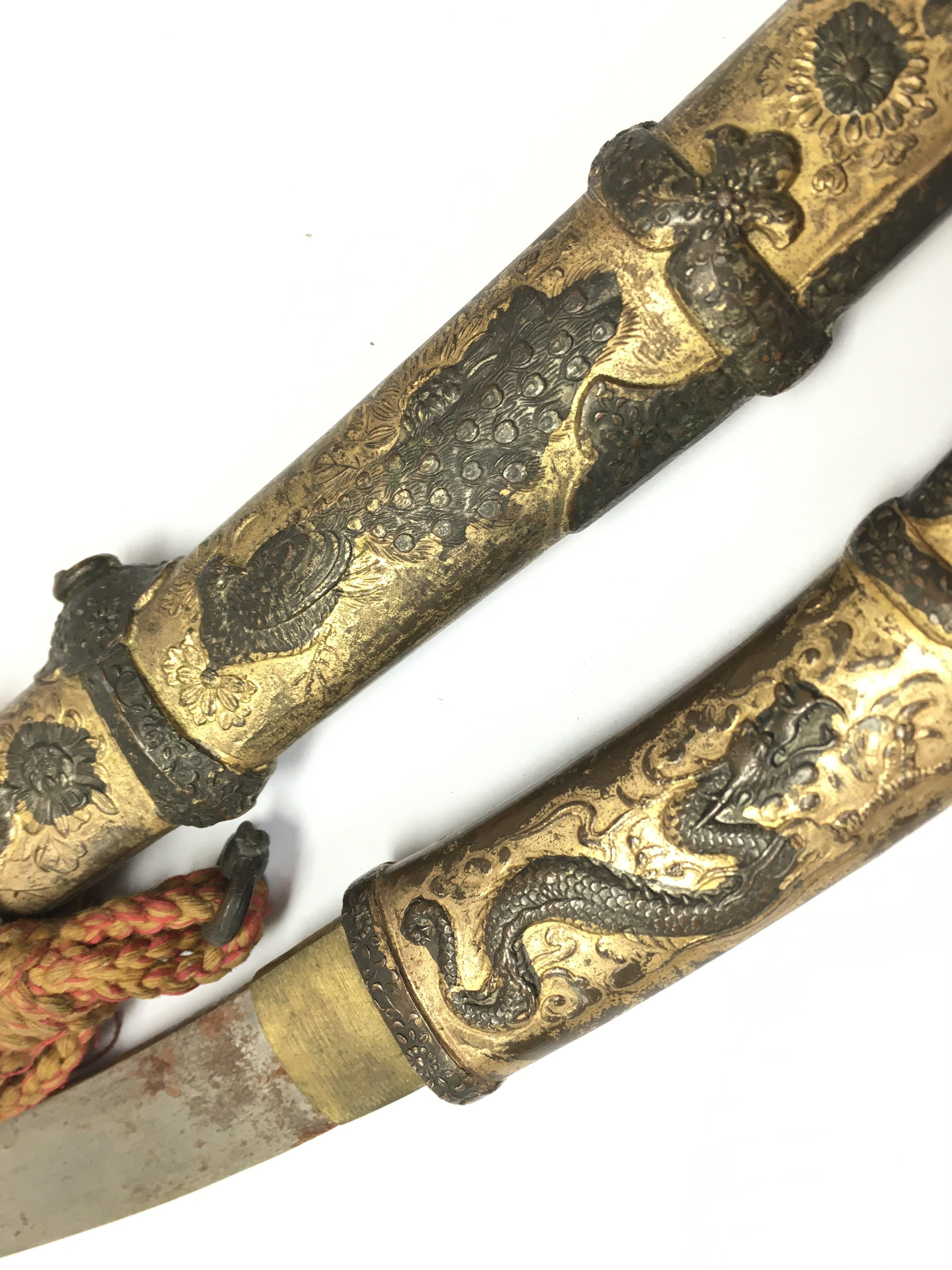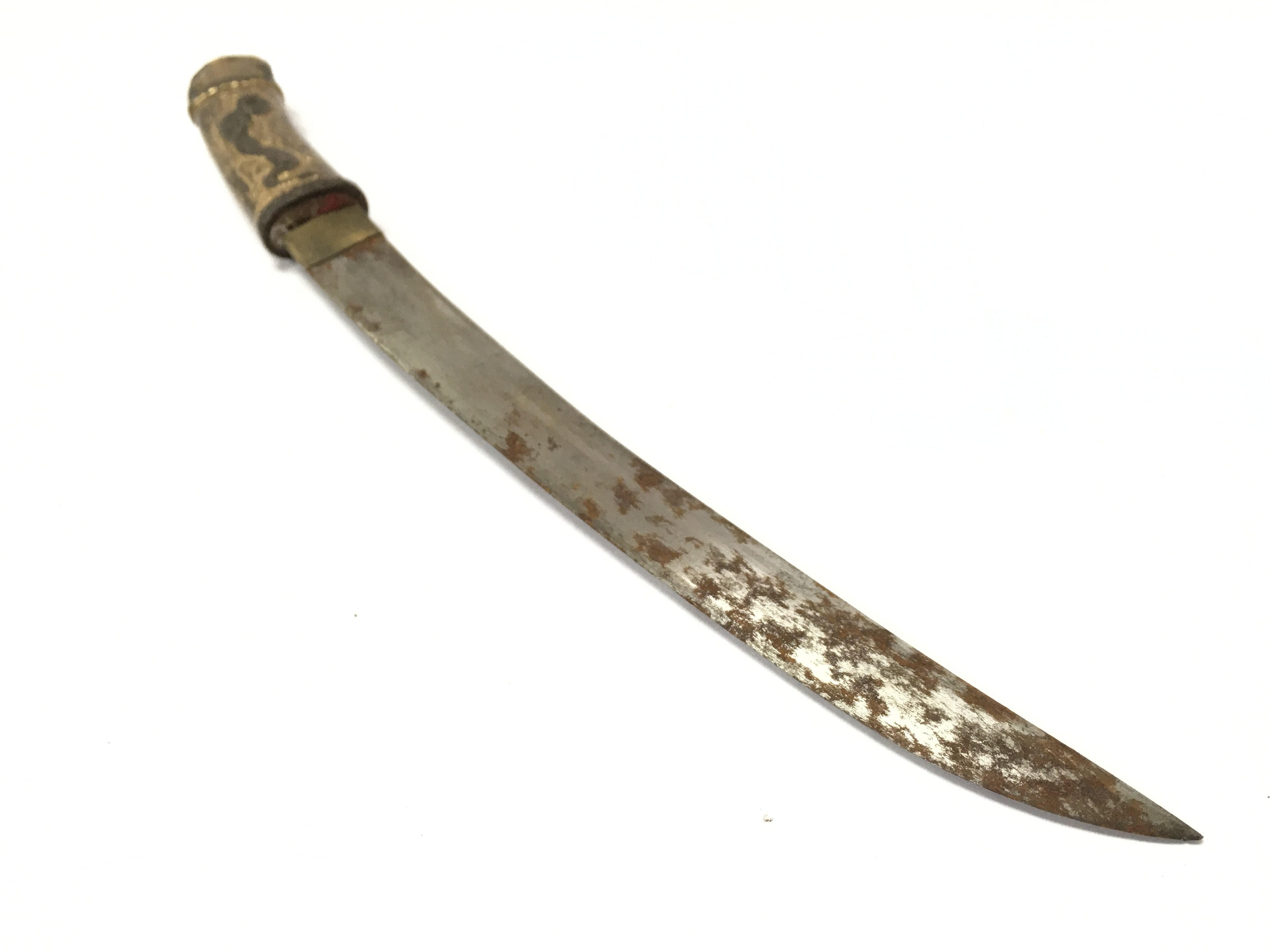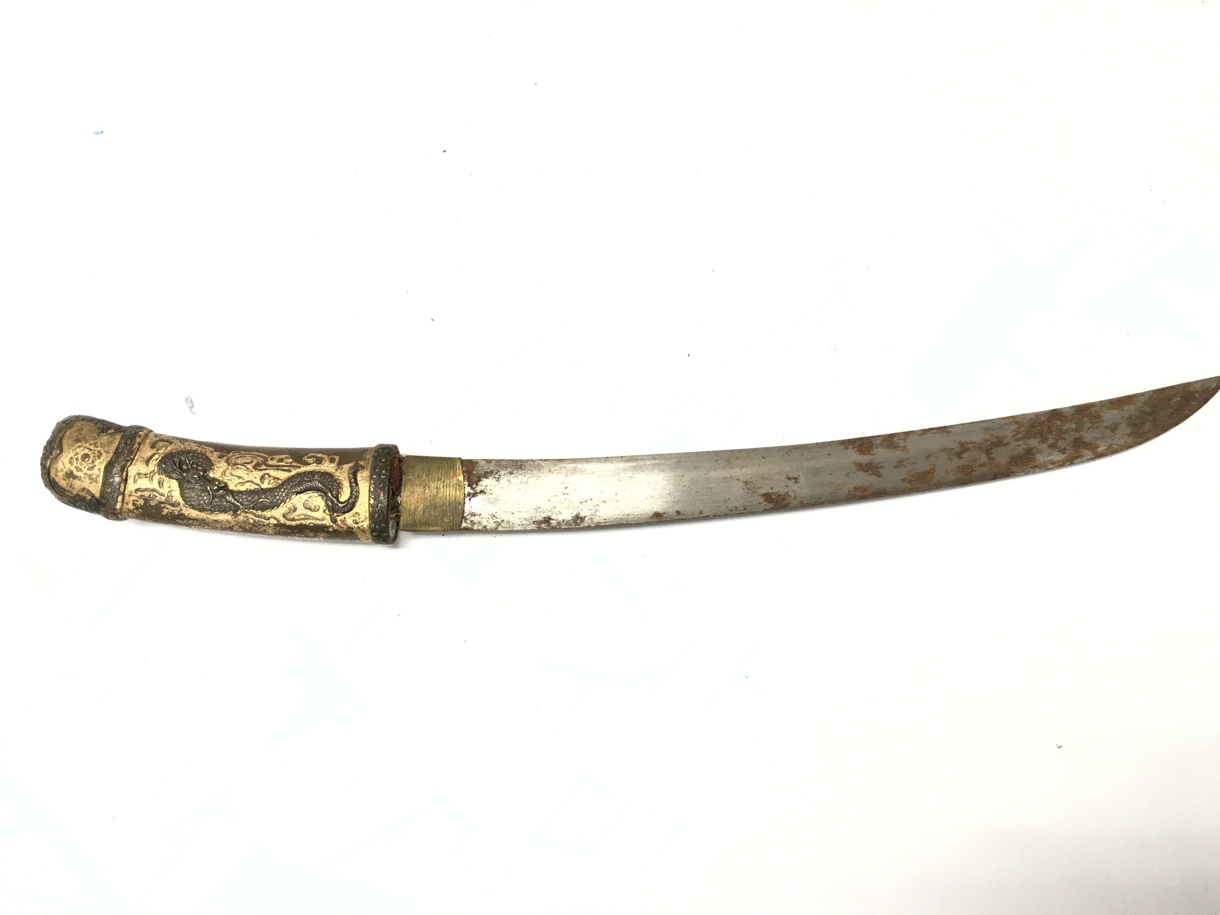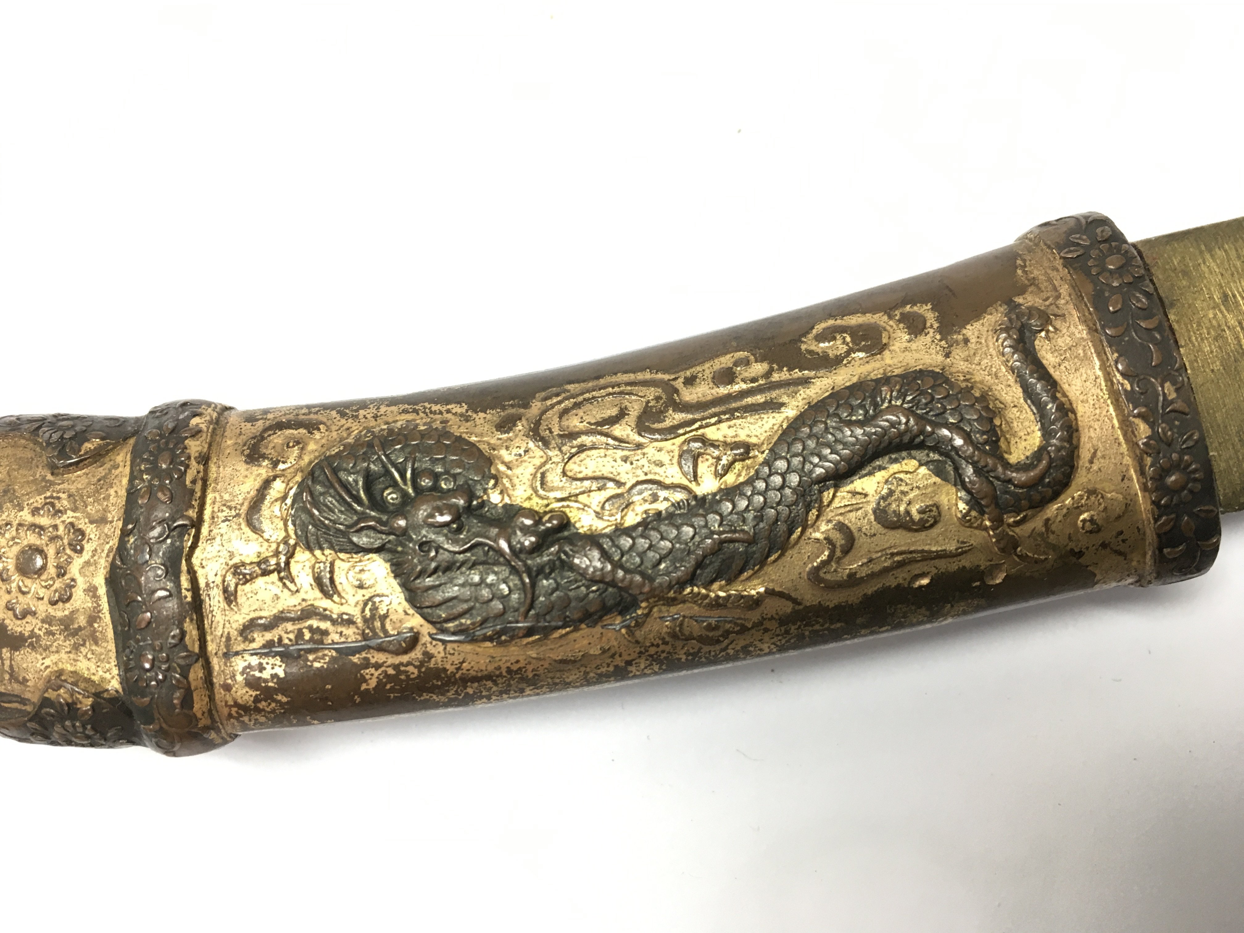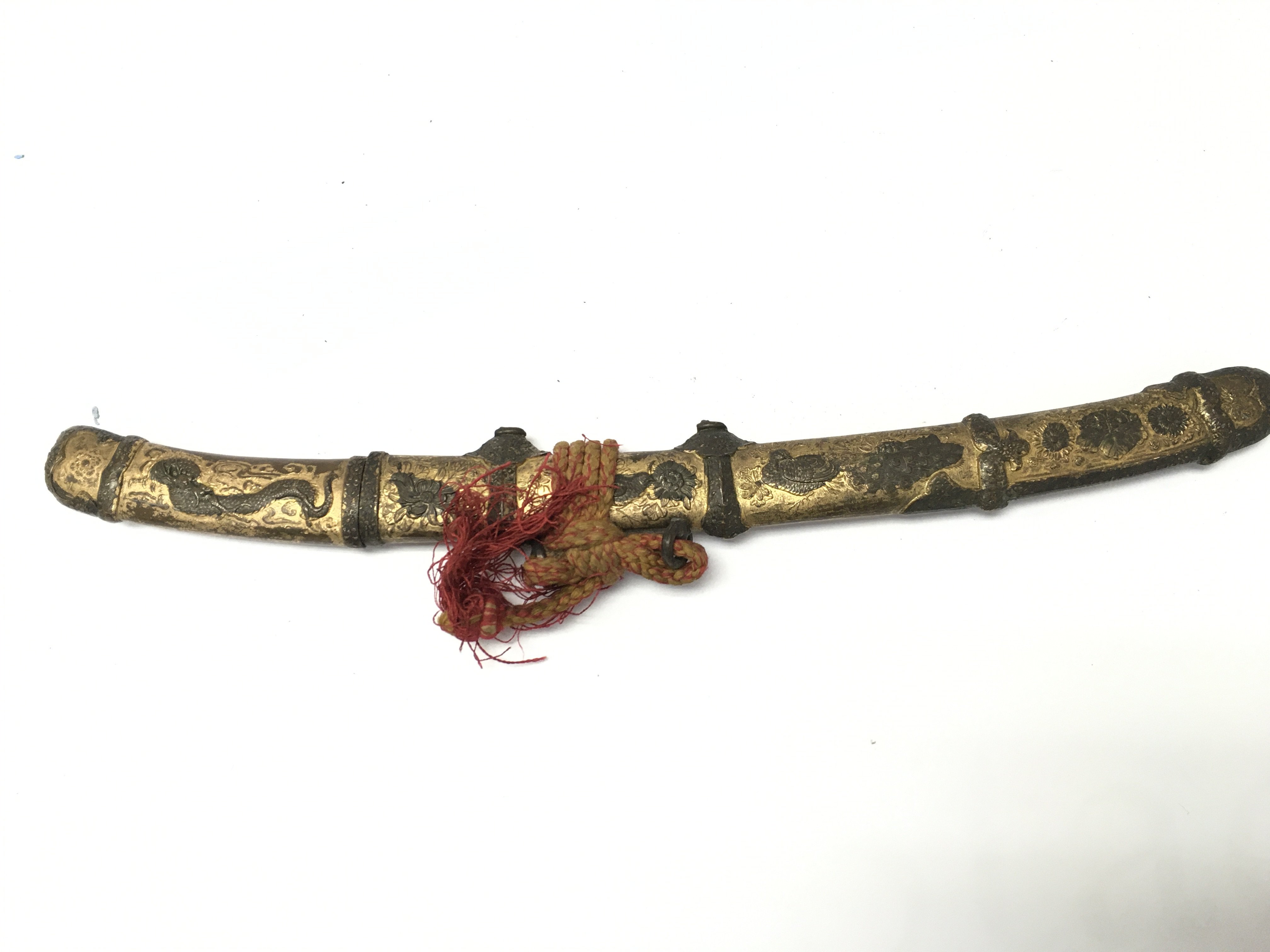 A possibly Chinese dagger with dragon and peacock design applied to the hilt and Scabbard , blade 20cm long , total length 32cm long.