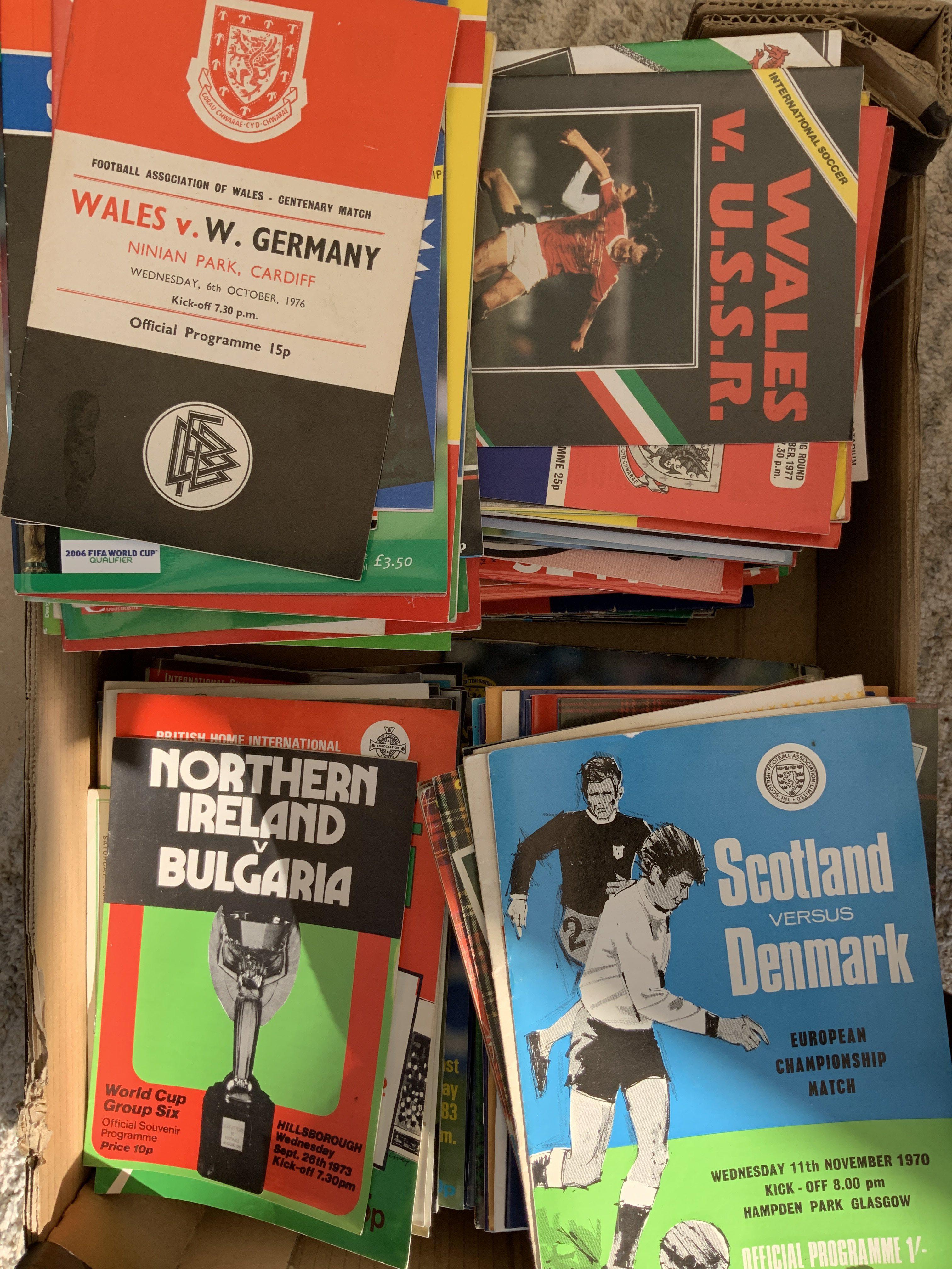 International Football Programmes: Homes from the 70s onwards of England x 80, Scotland x 86, Wales x 99, Northern Ireland x 39. Mainly excellent with a couple of duplicates. 2 boxes. (304)