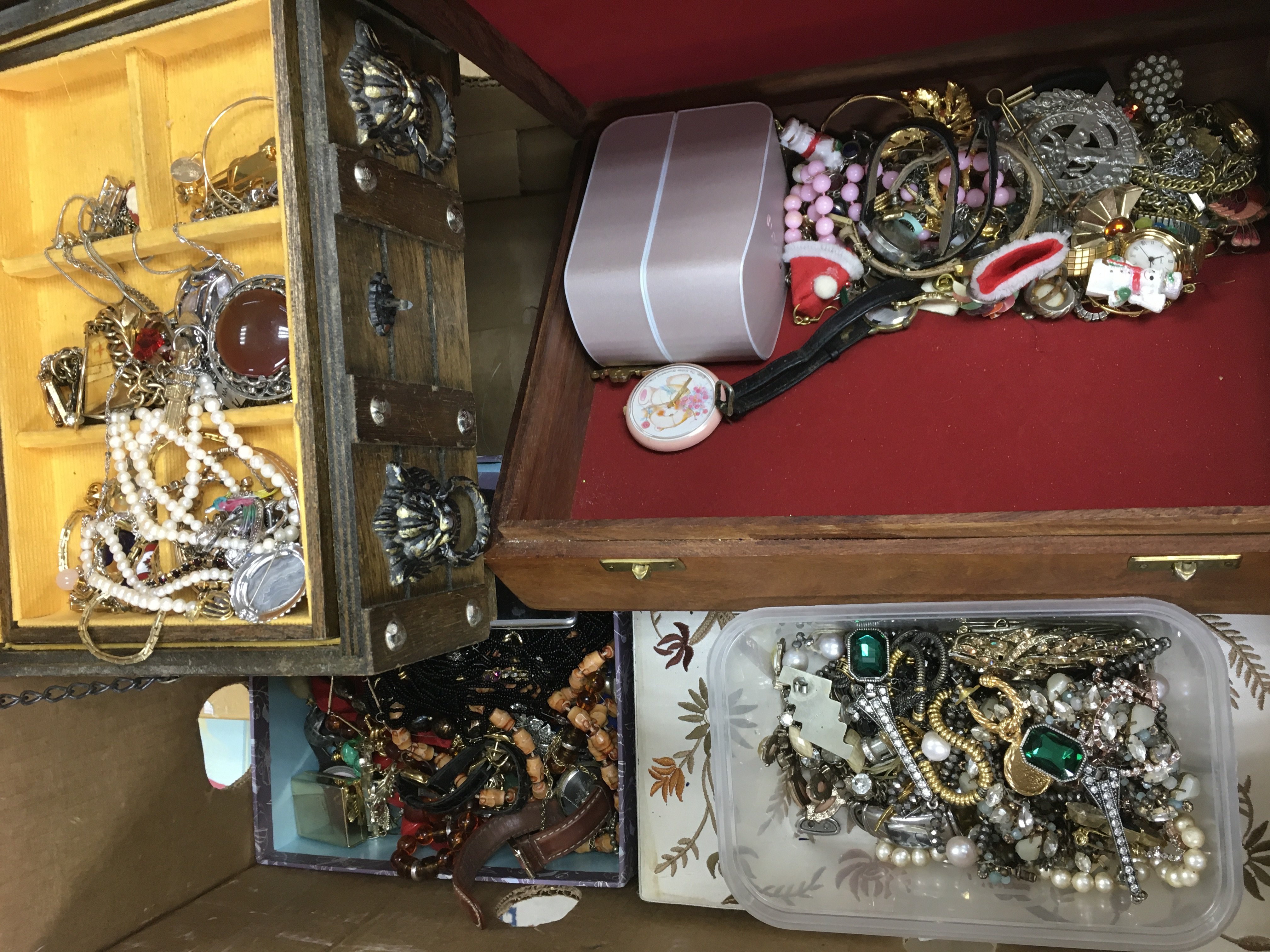 A large box of costume jewellery including necklaces, brooches, watches etc. postage cat C