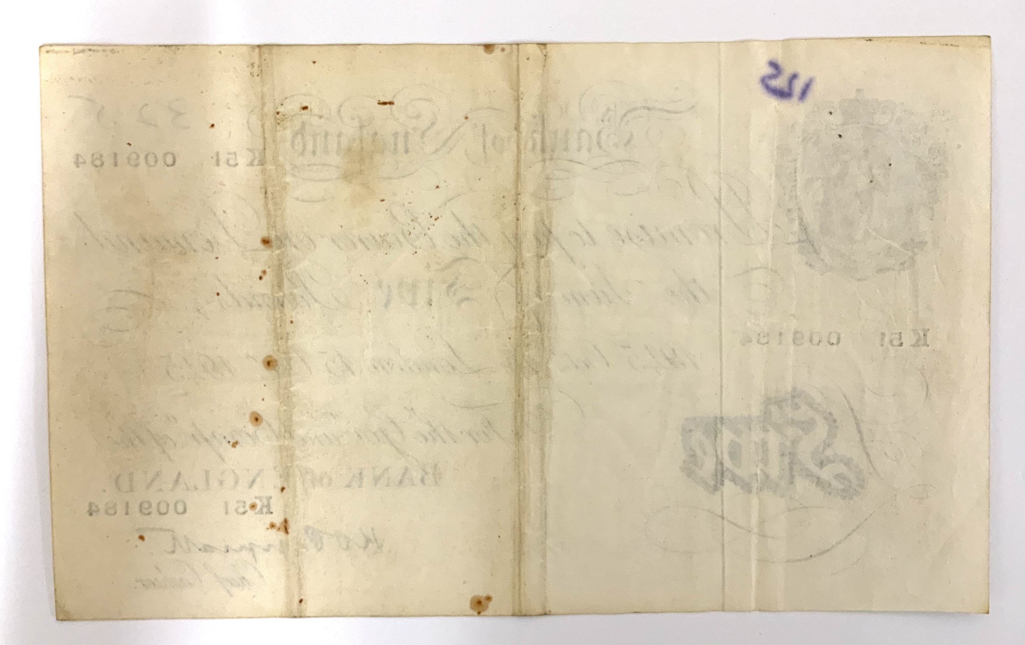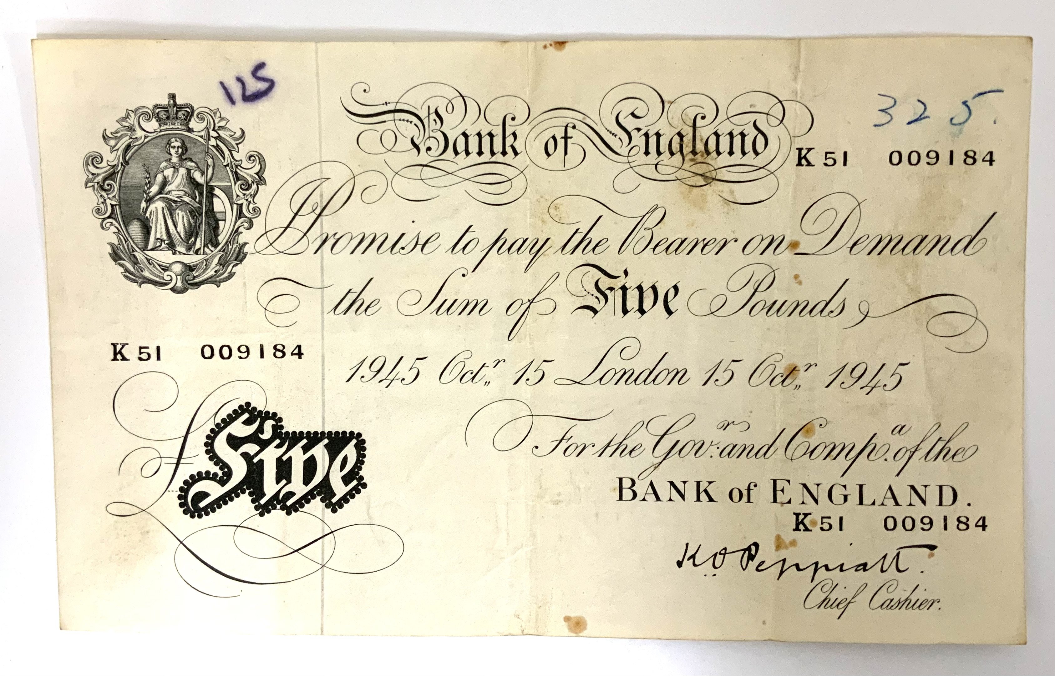 Bank of England White 5 note, Cheif Cashier K.O Peppiatt, 15th Oct 1945, K51 009184. pen marks, stains. NO RESERVE