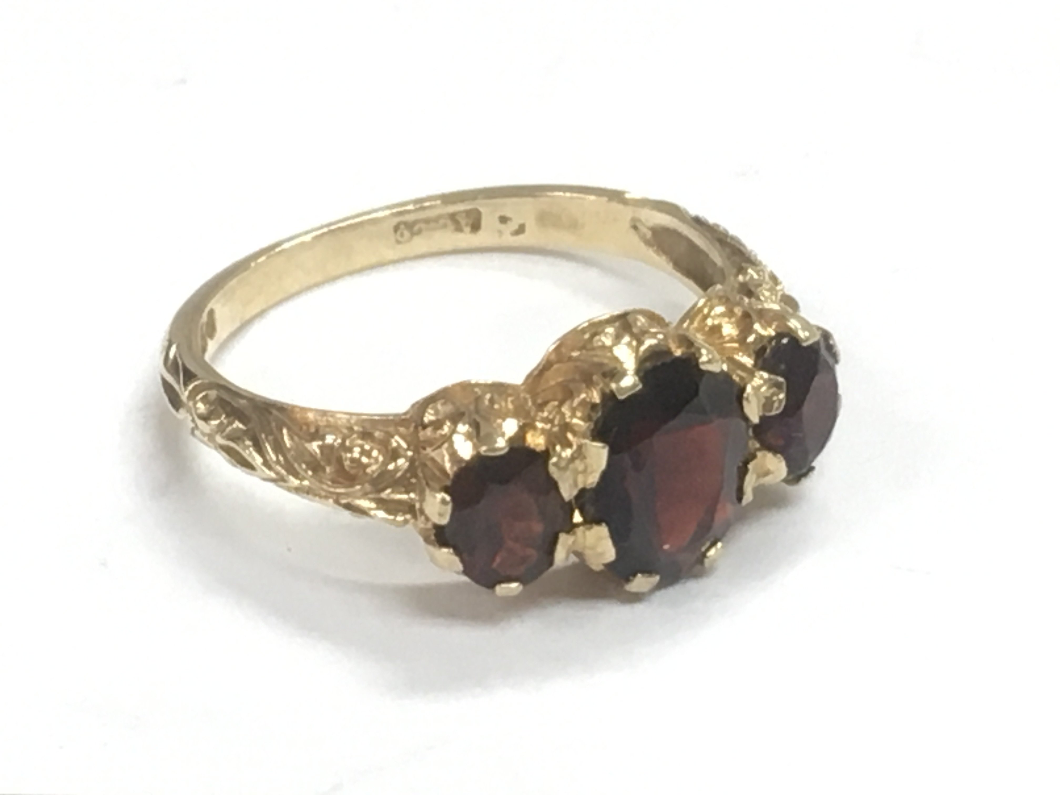 A 9 carat gold Edwardian three stone garnet ring, 3g. Size N Postage category A