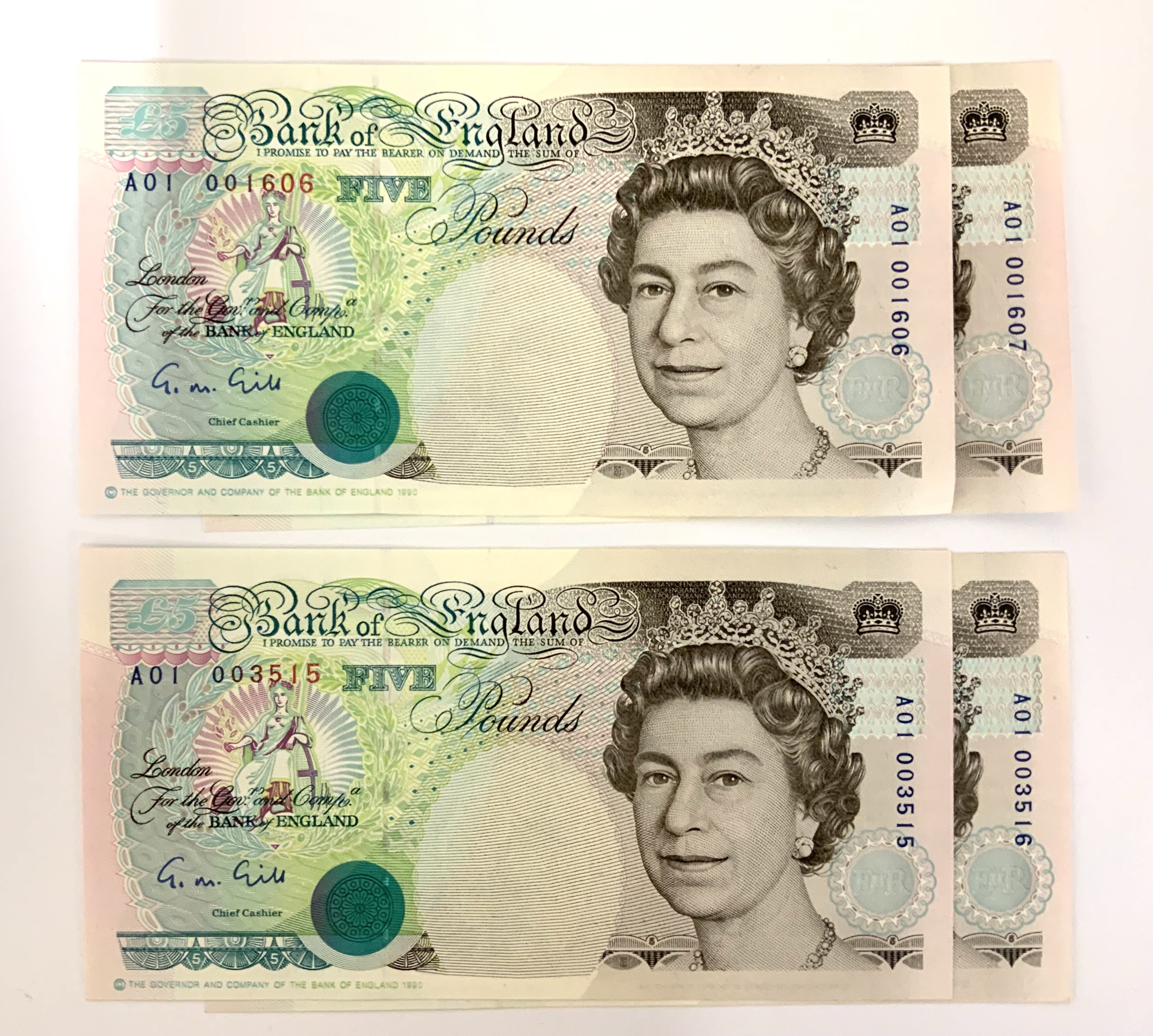 1990 G.M Gill, Consective pairs A01 001606-07, A01 003515-16, Mint. NO RESERVE