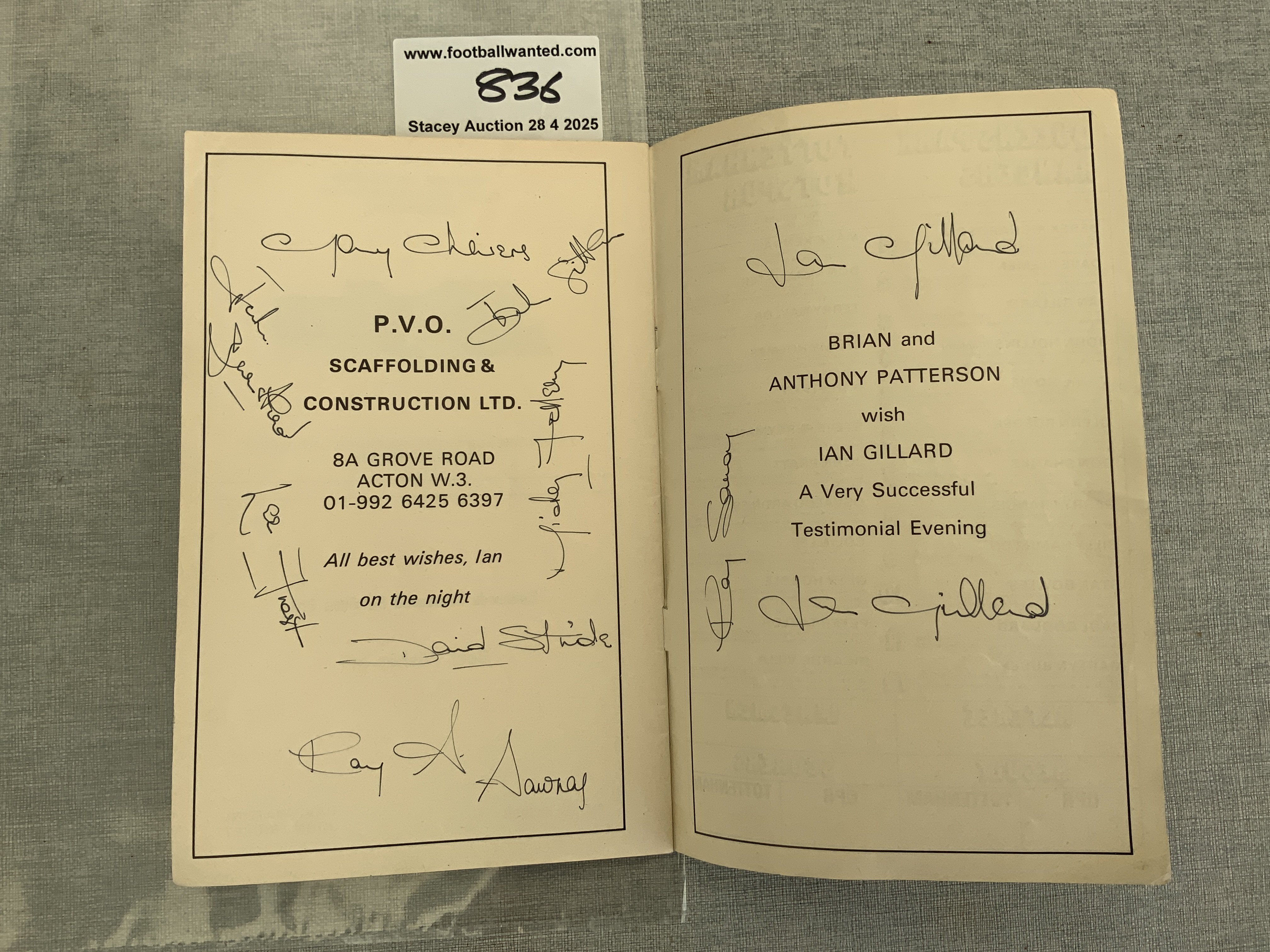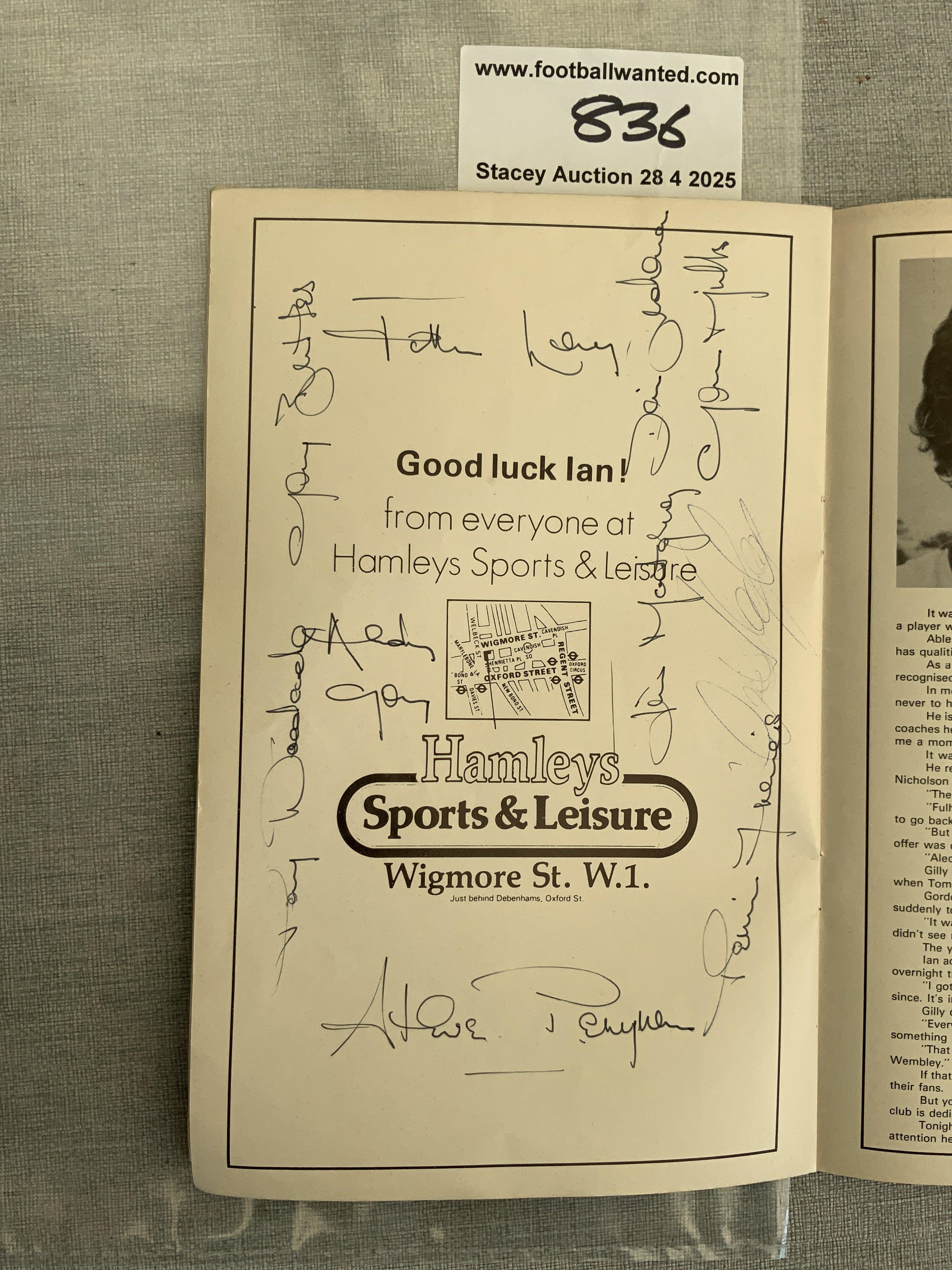 Signed Football Programmes: Les Allen testimonial programme signed to rear team page by many players including Bobby Moore and Dave Mackay who were playing for the London X1. C/W an Ian Gillard testimonial signed by many Tottenham players and others and a 1980 signed West Ham programme. (3)