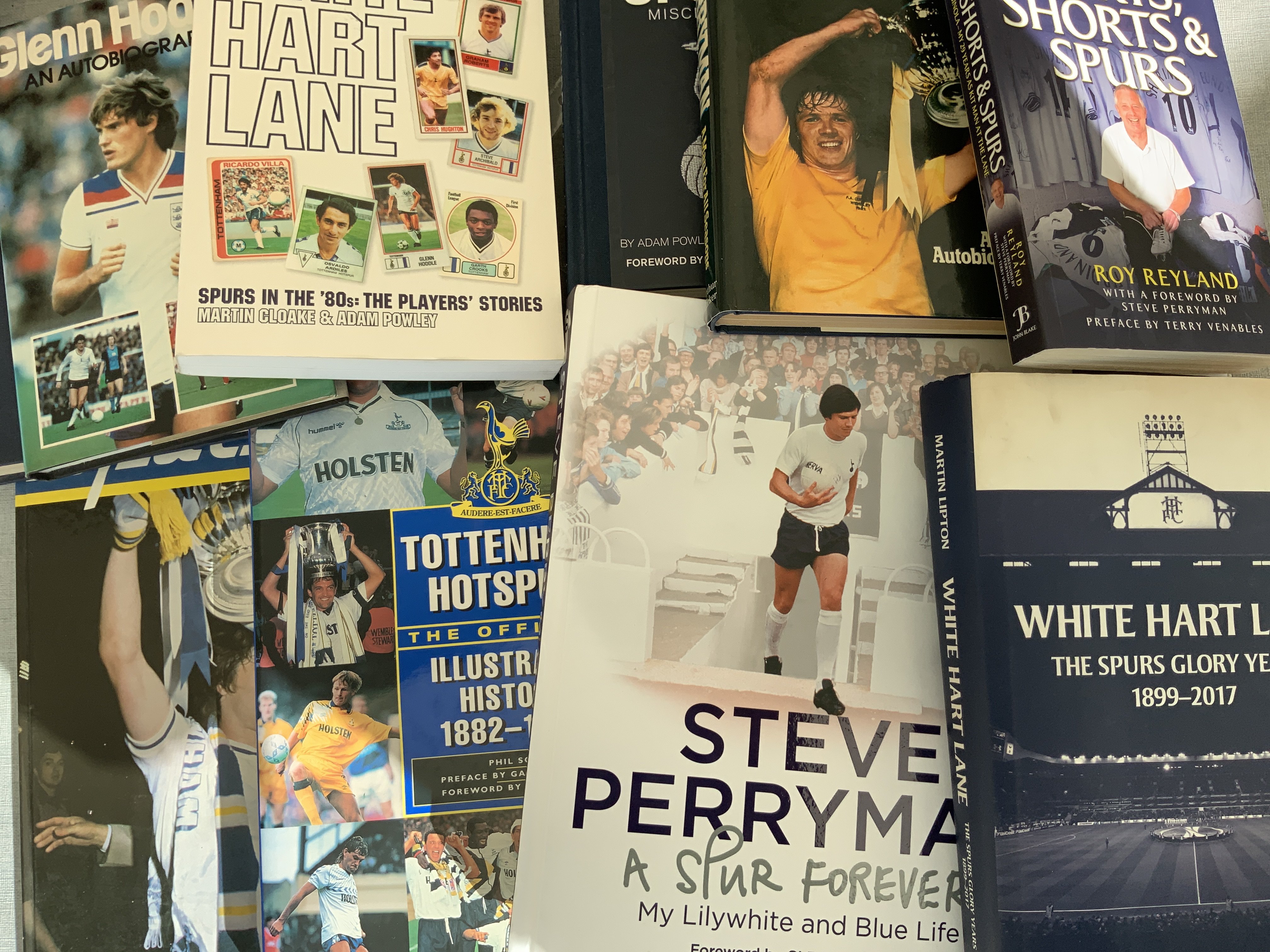 Tottenham Football Autograph + Book Collection: Very nicely hand drawn head and shoulders pictures of 14 1970s Spurs players all hand signed without dedication. Signatures include Chivers Coates Osgood Knowles McAllister and Duncan. C/W an album nice selection of Spurs books.