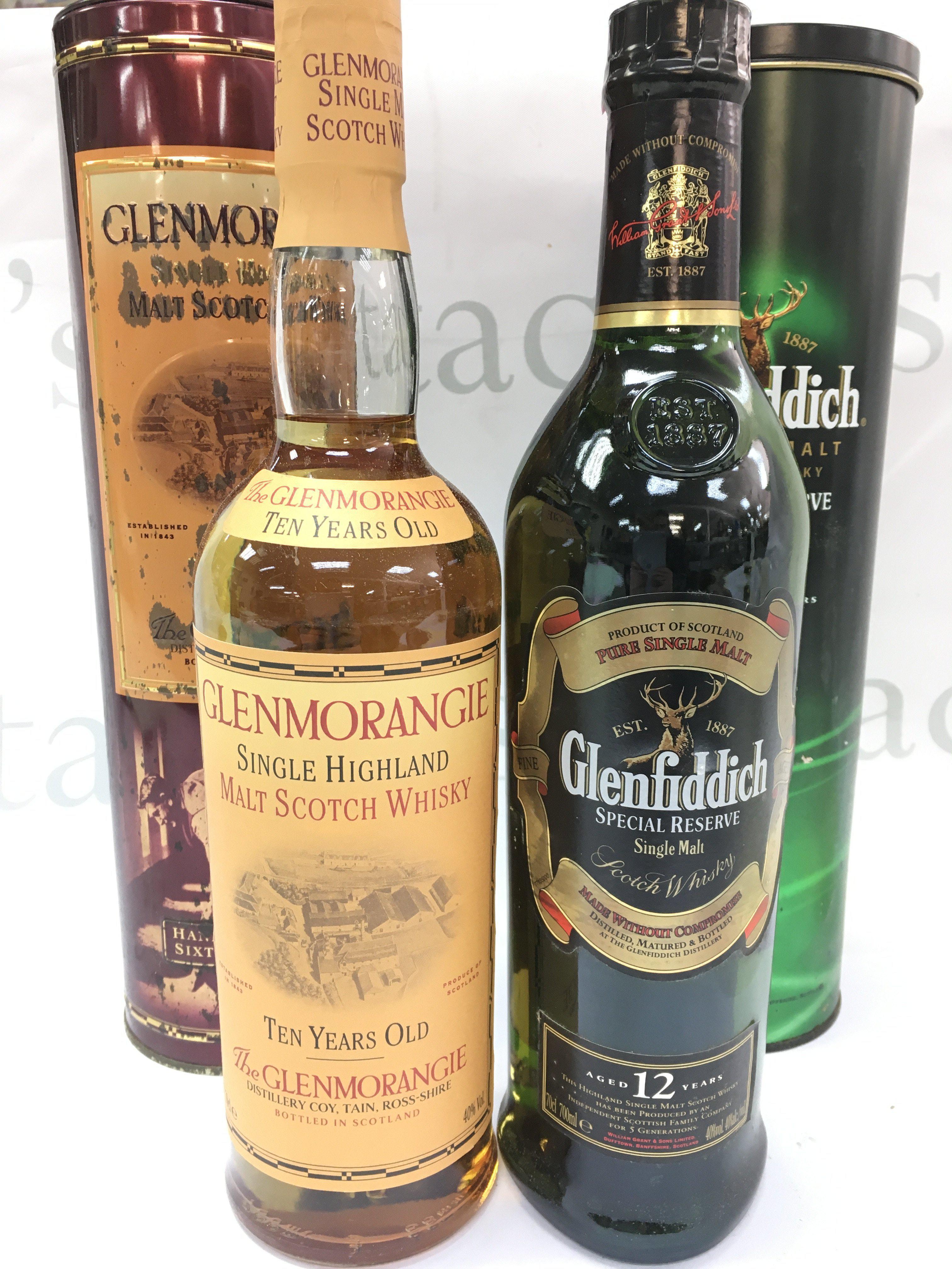 Glenmorangie Single Highland malt scotch whisky and a bottle of Glenfiddich special reserve single malt scotch whiskey