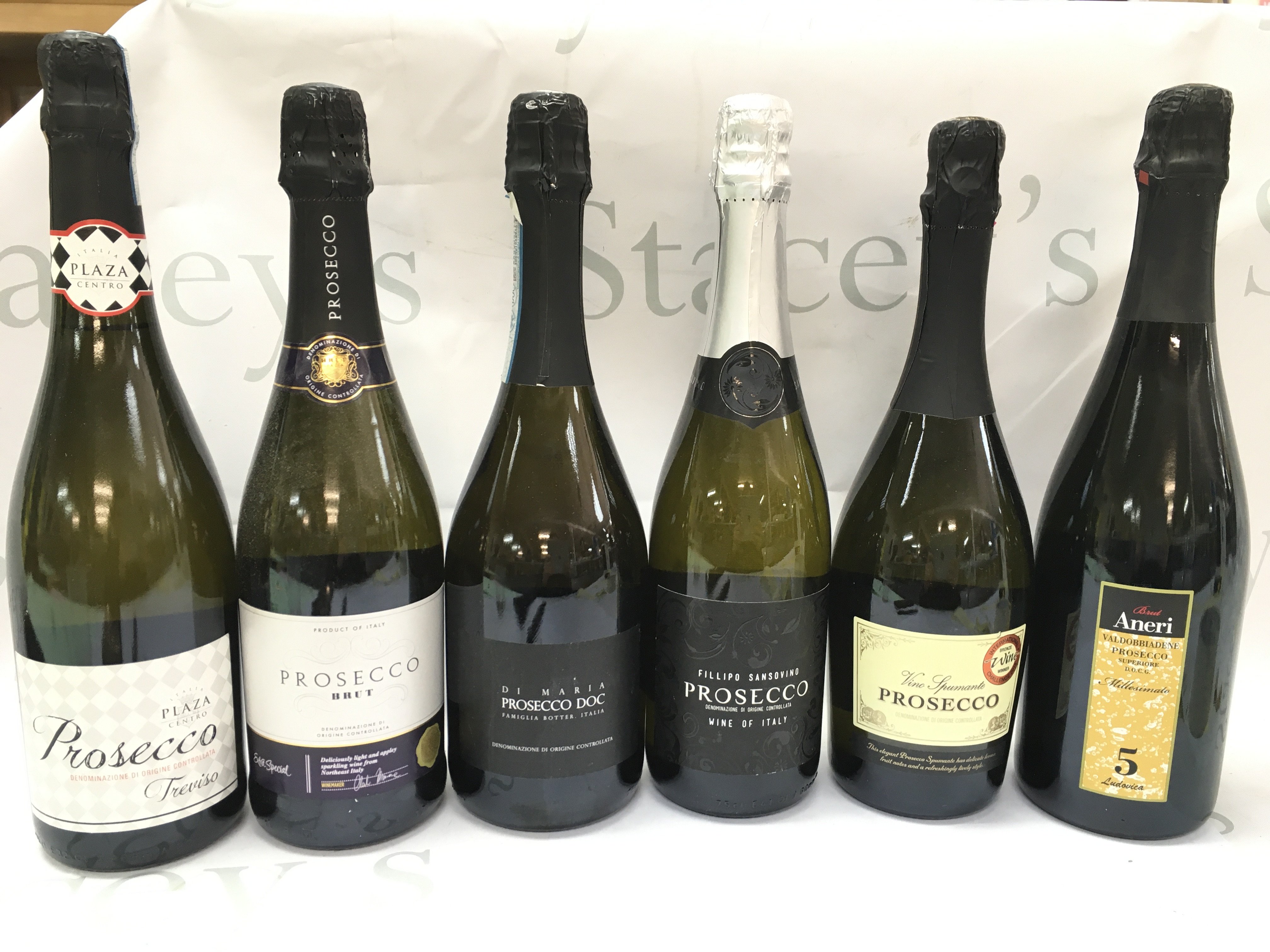 Six various bottles of Prosecco including Di Maria, Vino Spumante, Filllipo Sansovino. This lot cannot be posted