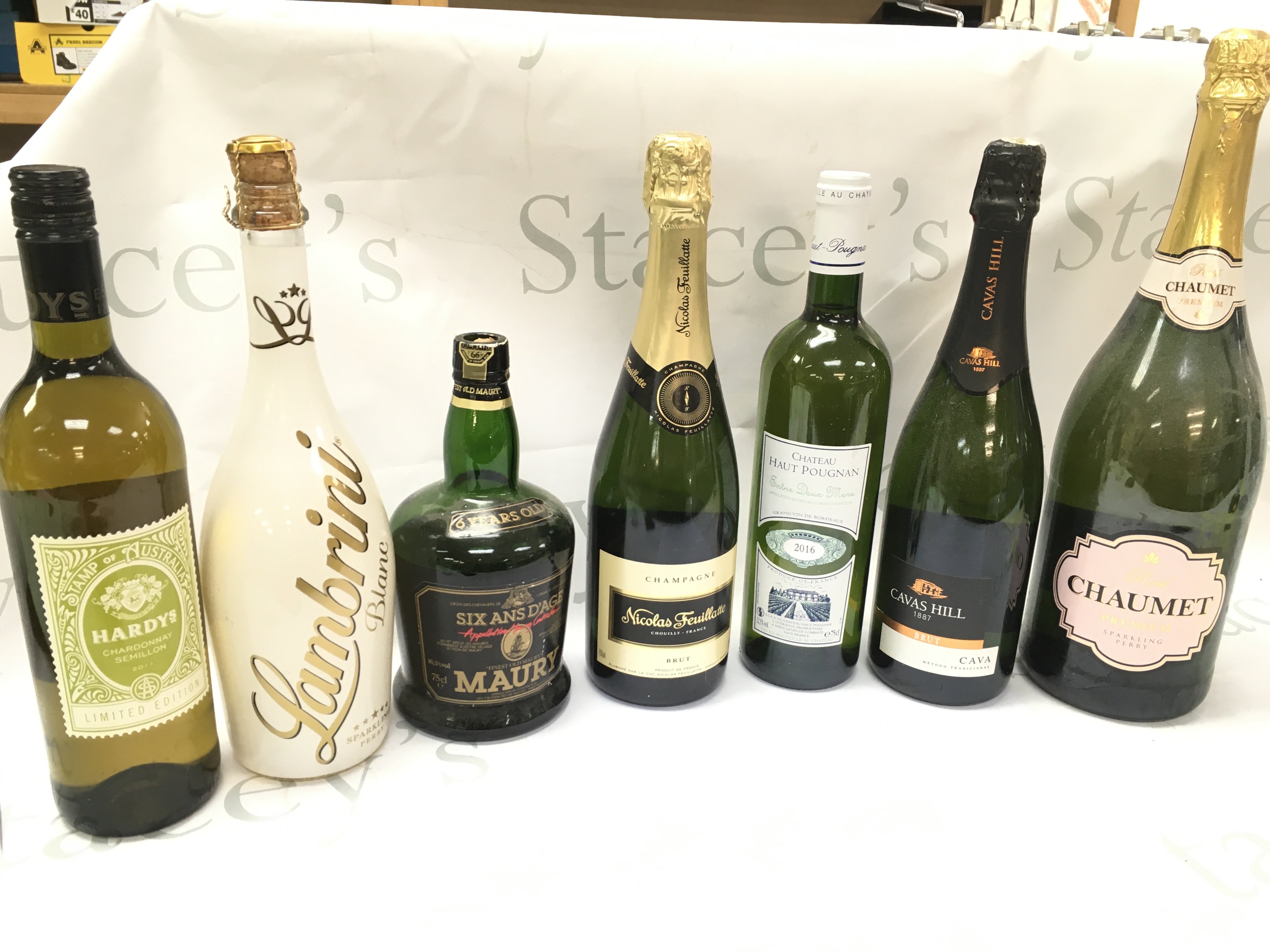 A collection of various bottles including Nicholas Feuillate champagne, Chateau Haut Pougnan Entre Deux Mers, Cavas Hull Cava etc