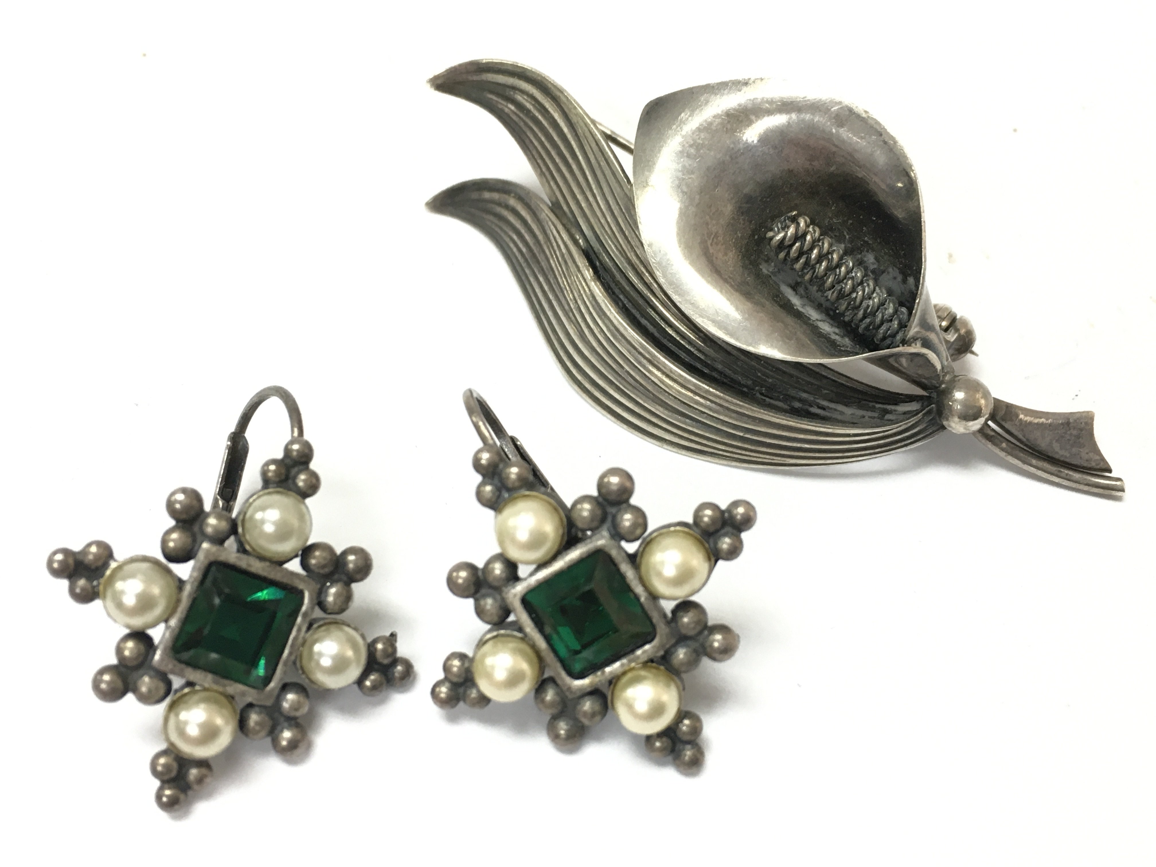 A silver brooch made in Denmark and a pair of earrings , postage category A