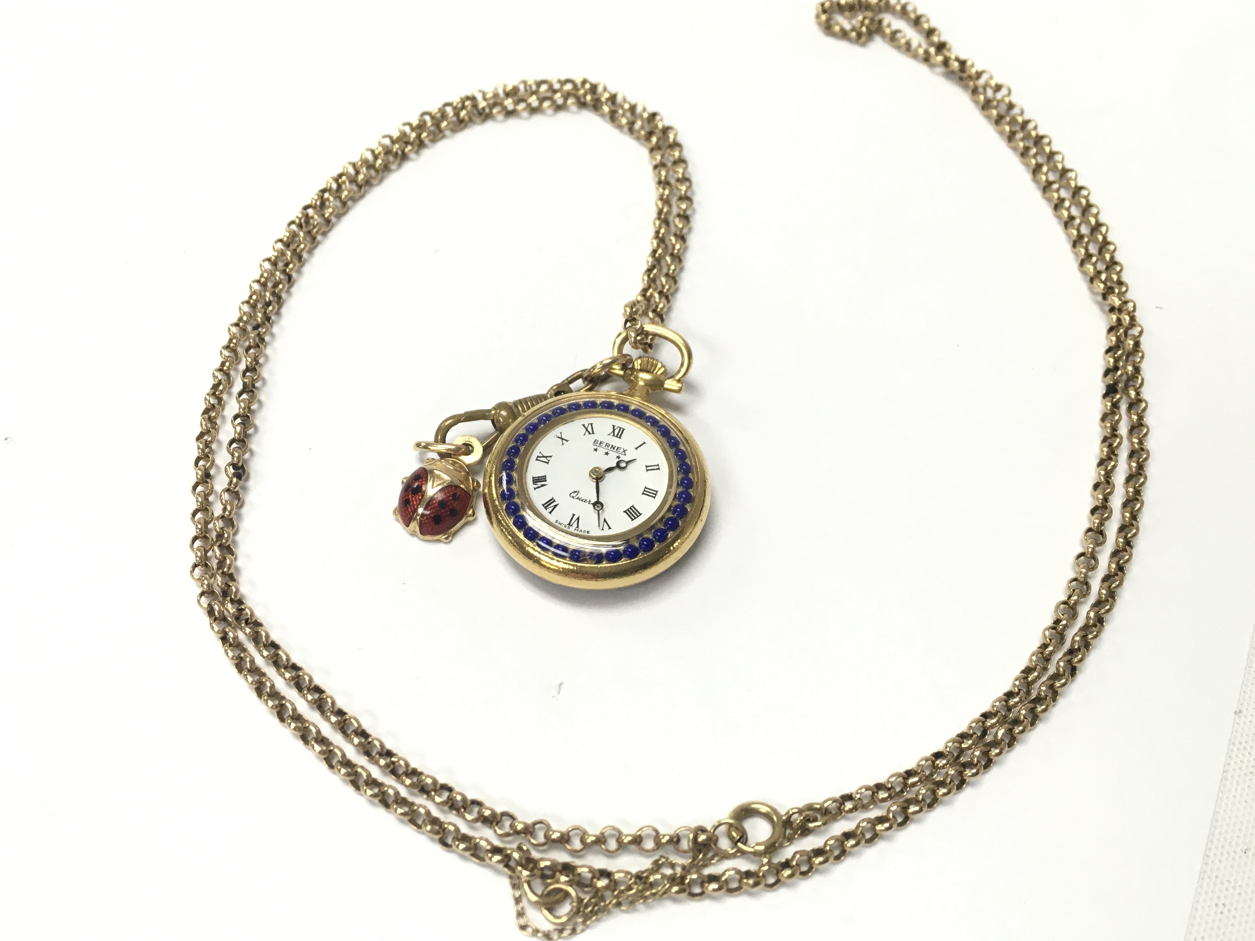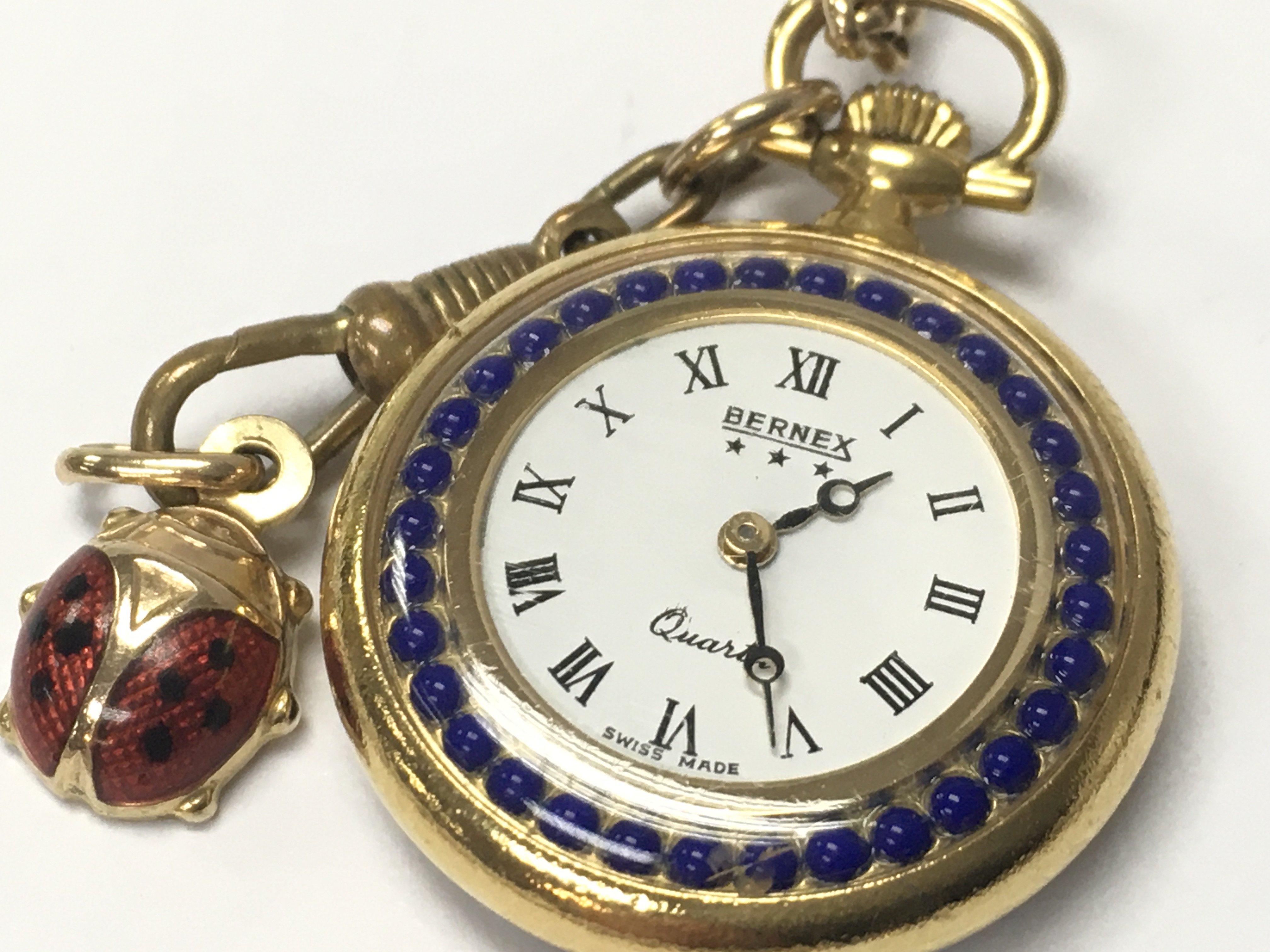9ct chain fob with Bernex watch and lady bird pendant. Chain weight approximately 13g. Postage category A