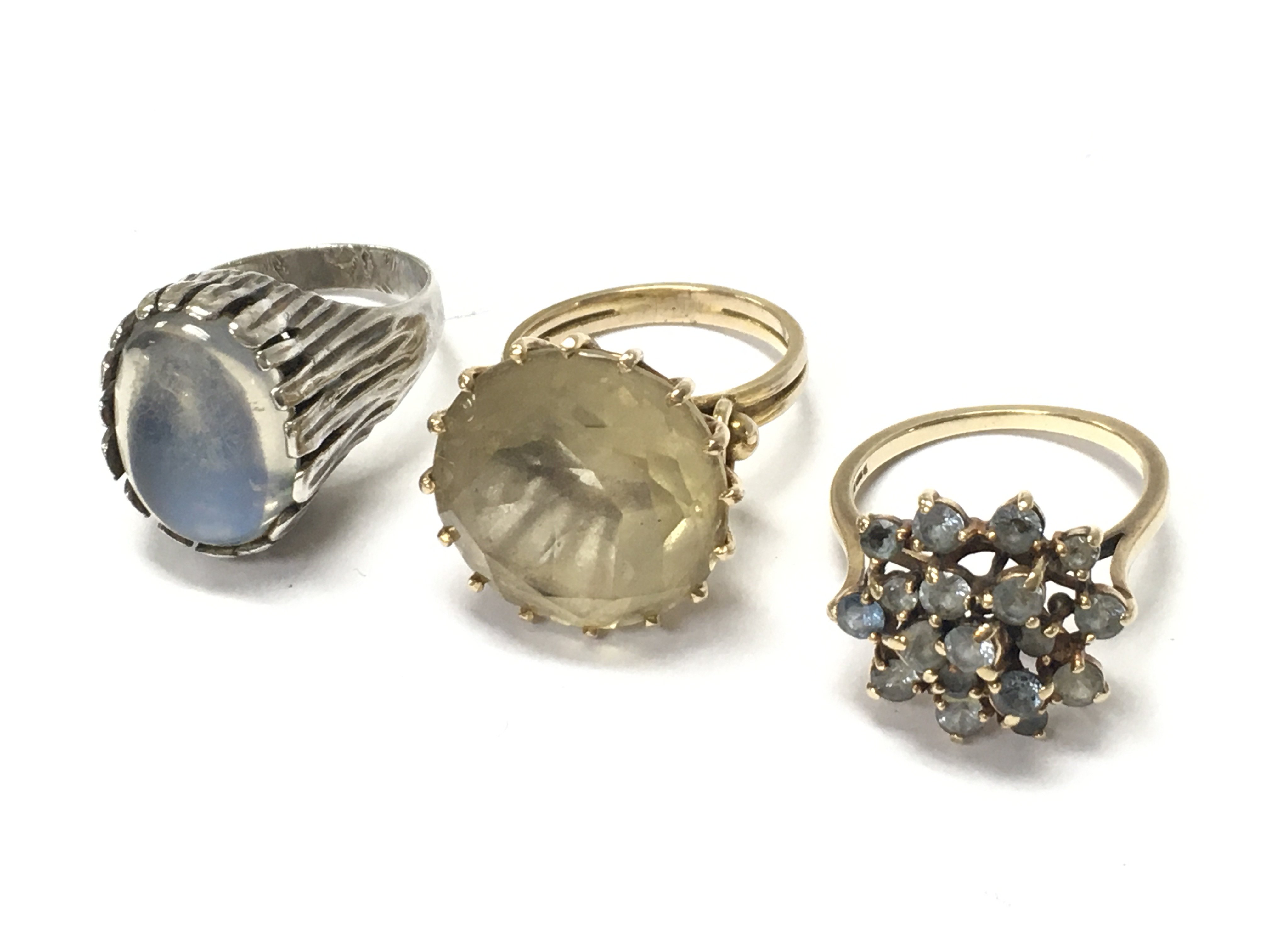 Two 9ct gold dress rings (size O & P) and a silver moonstone ring (size O). Postage category A