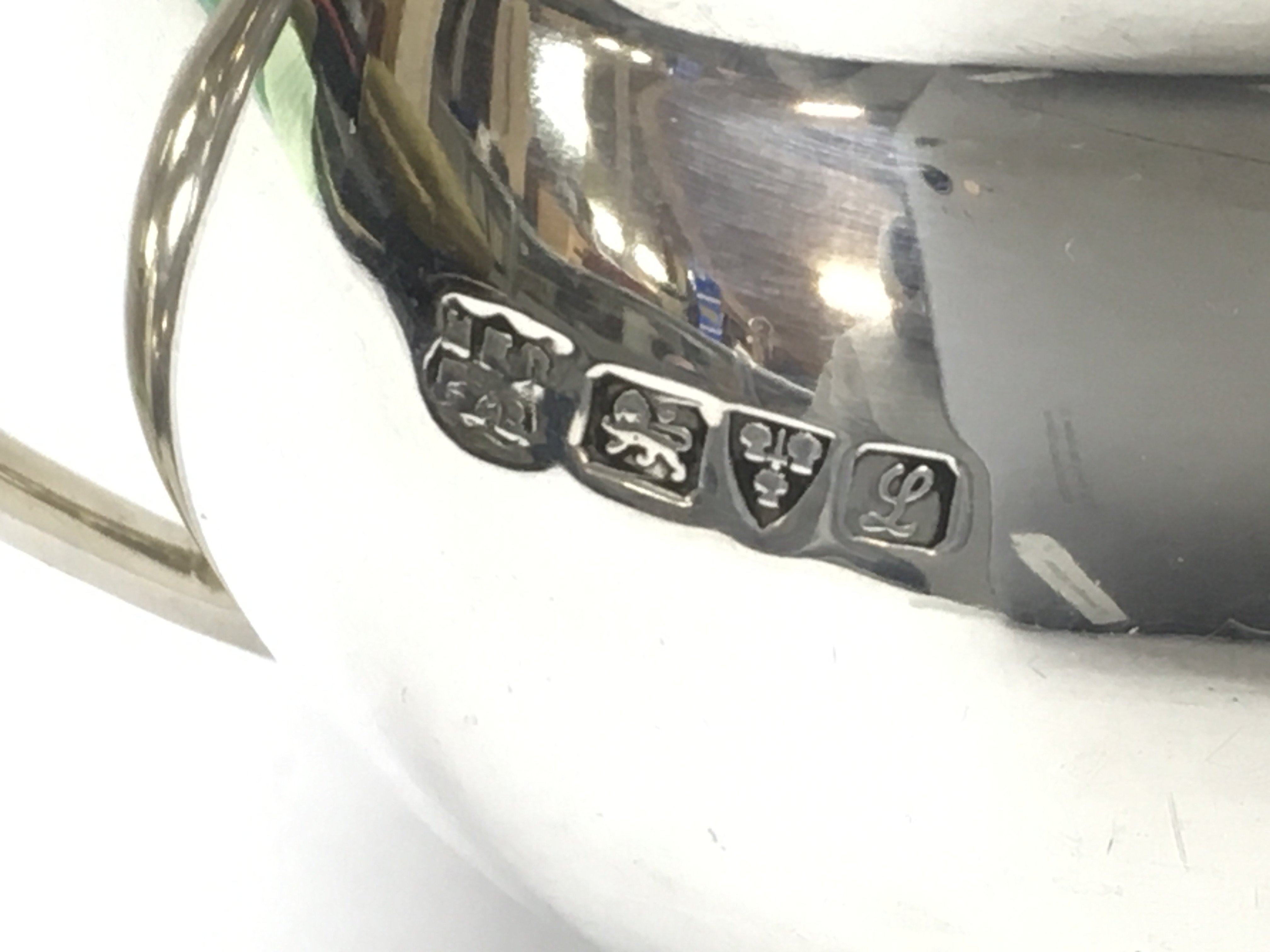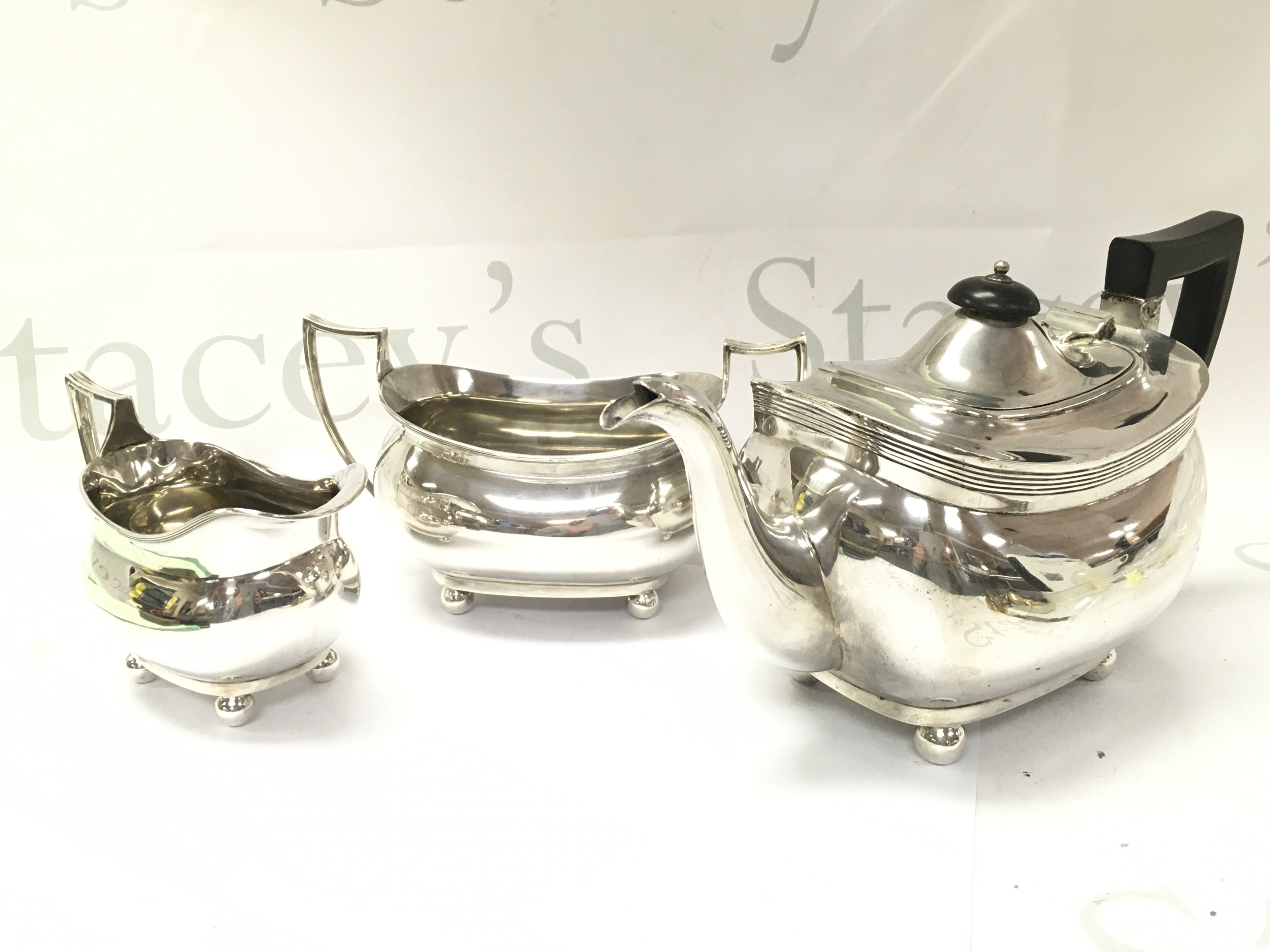 Three piece silver tea set including a teapot, milk jug and sugar bowl. Postage category C
