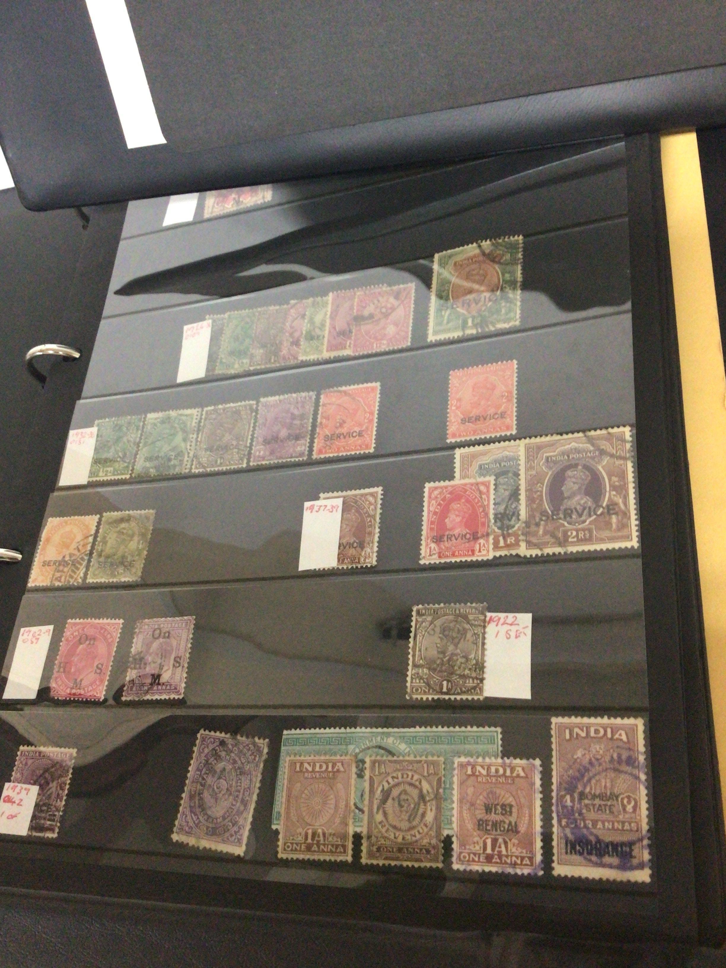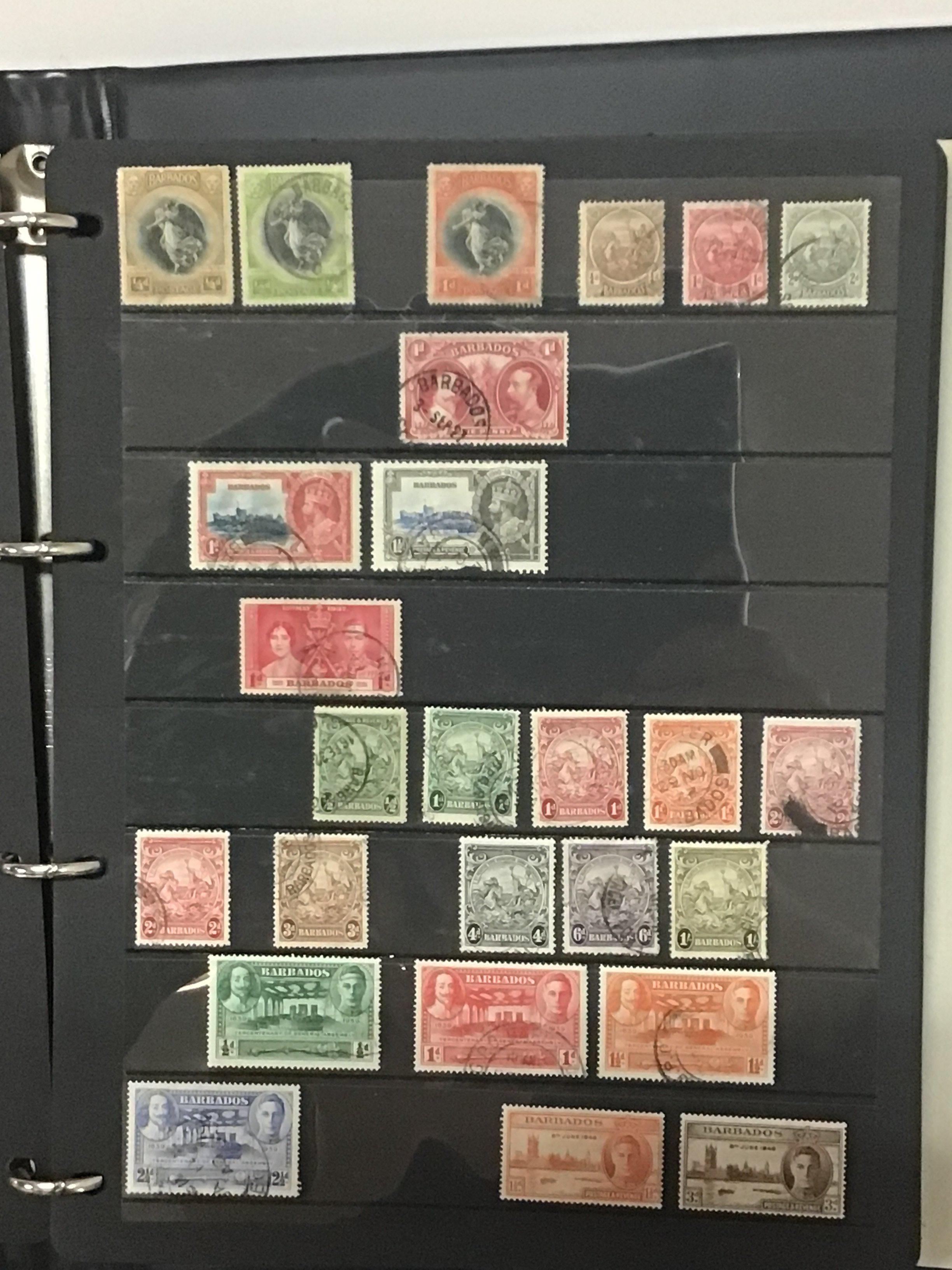 Five blue Alpha Stamp Albums containing British colonial and Empire stamps from Queen Victoria to Elizabeth II mainly used stamps well presented in sleeves an album of New Zealand stamps India Australia Barbados and more (5). NO RESERVE