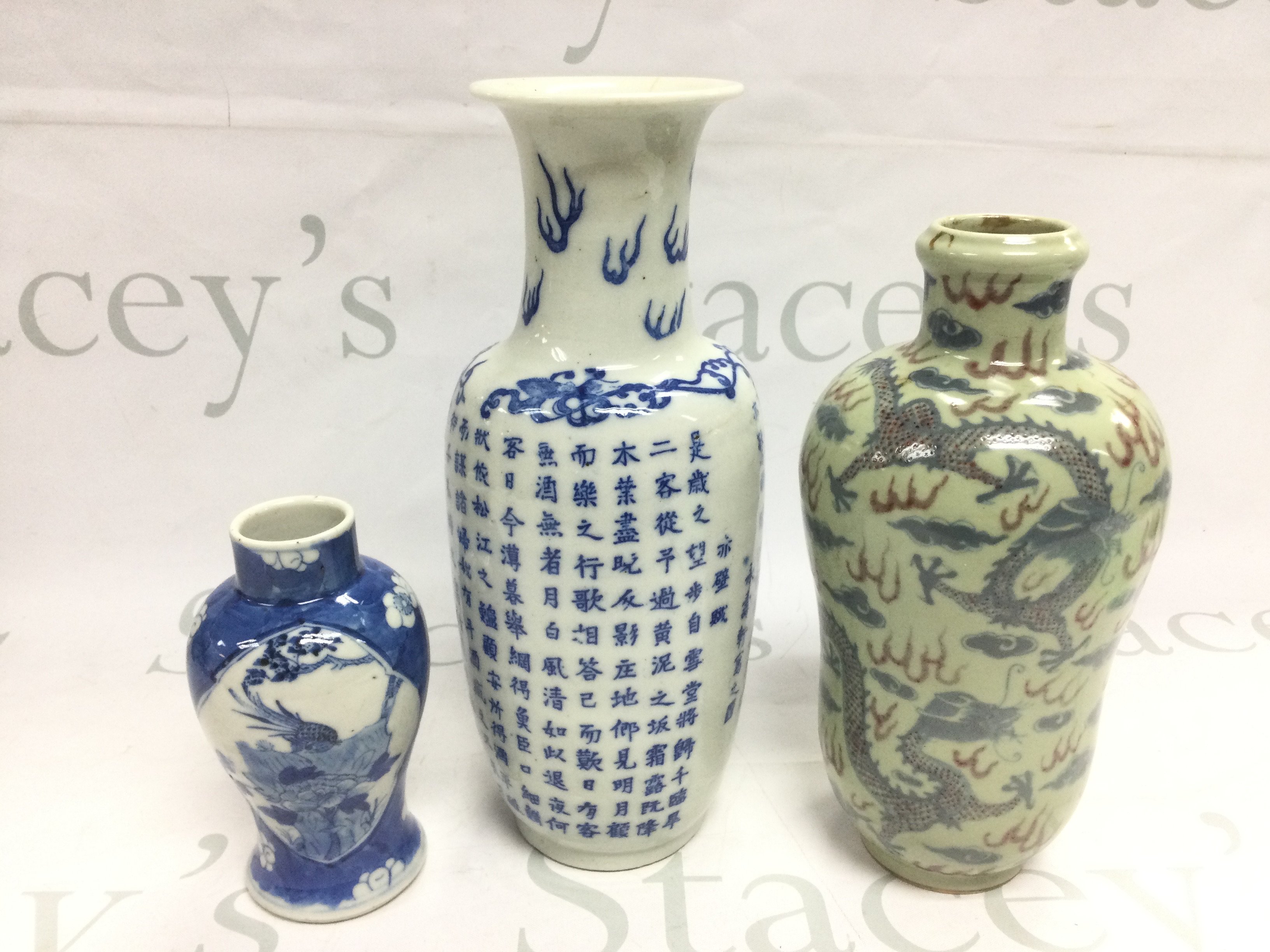 Three Oriental vases comprising a blue and white example decorated with various characters and script plus two others, tallest approx 25cm.