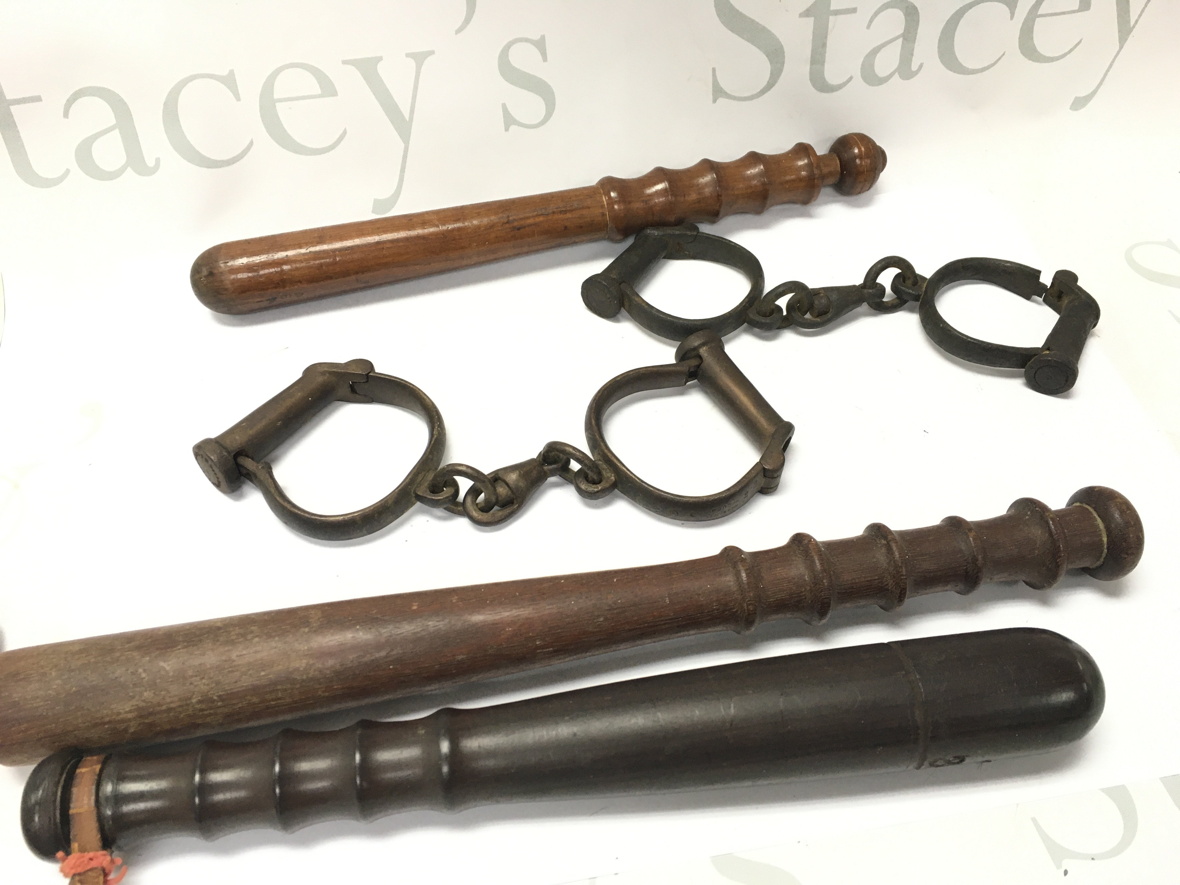 Three truncheons and two pairs of handcuffs. Postage cat b