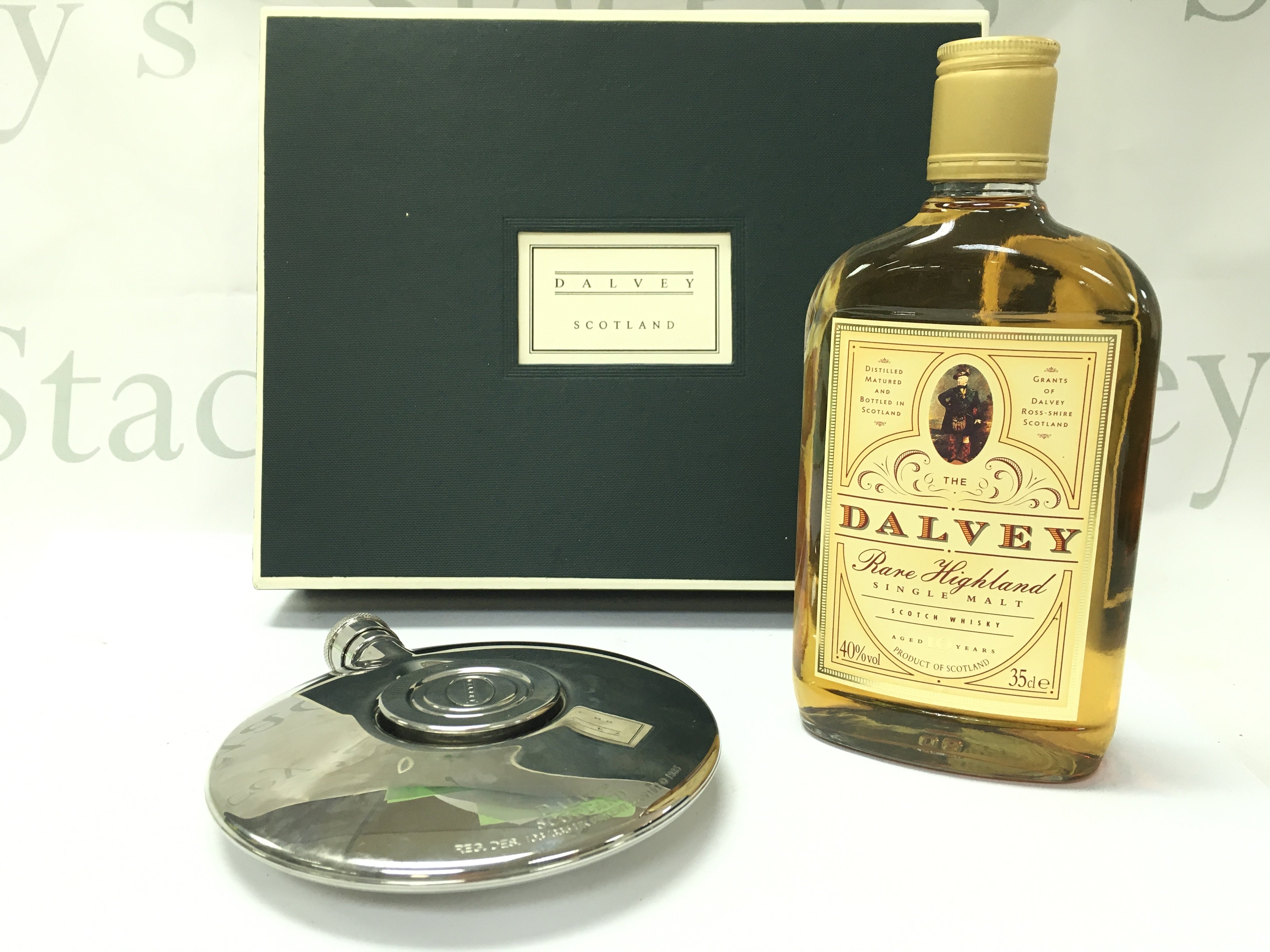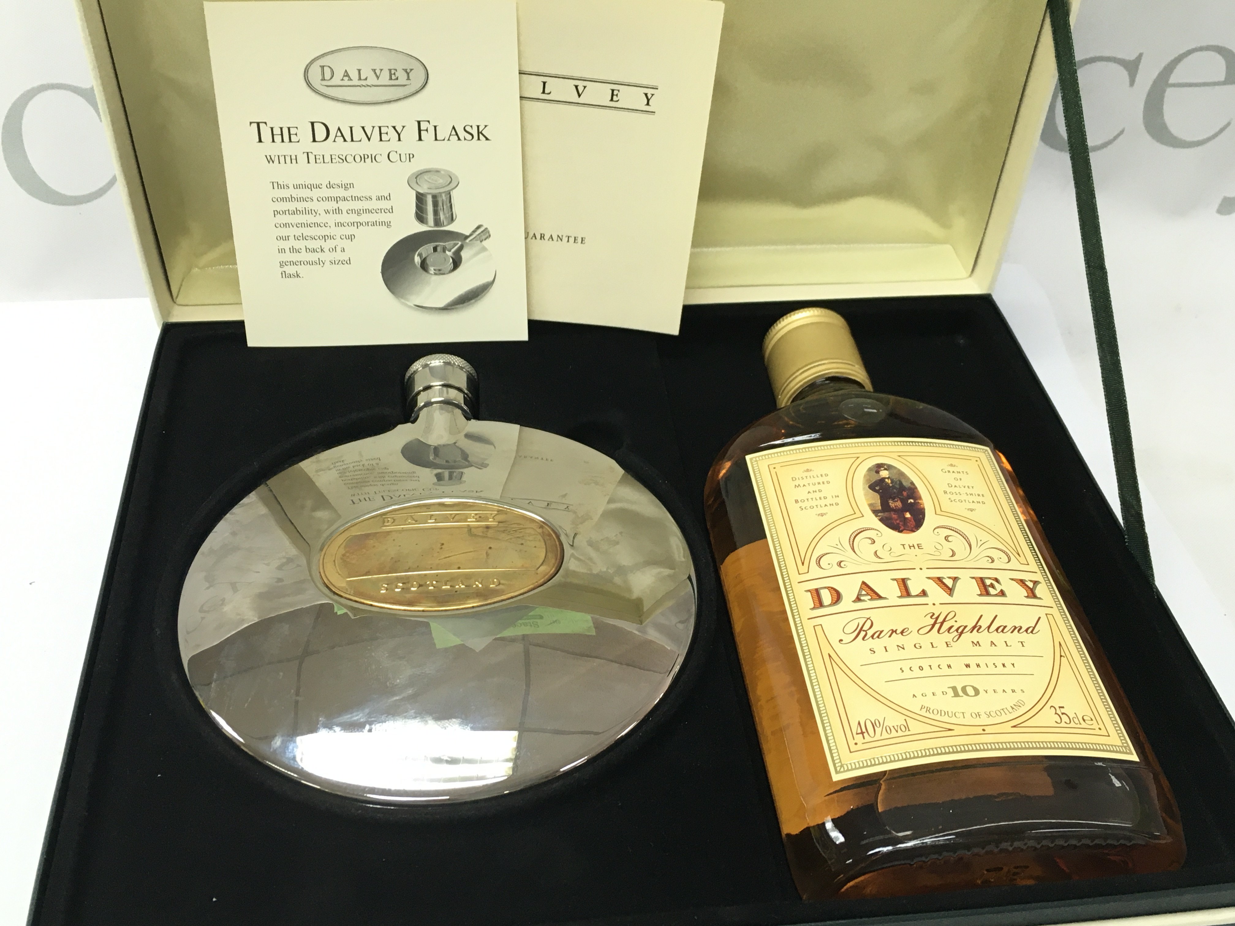 Boxed Dalvey presentation whisky set with Dalvey Single Malt scotch whisky aged 10 years 35cl bottle and flask. This lot cannot be posted