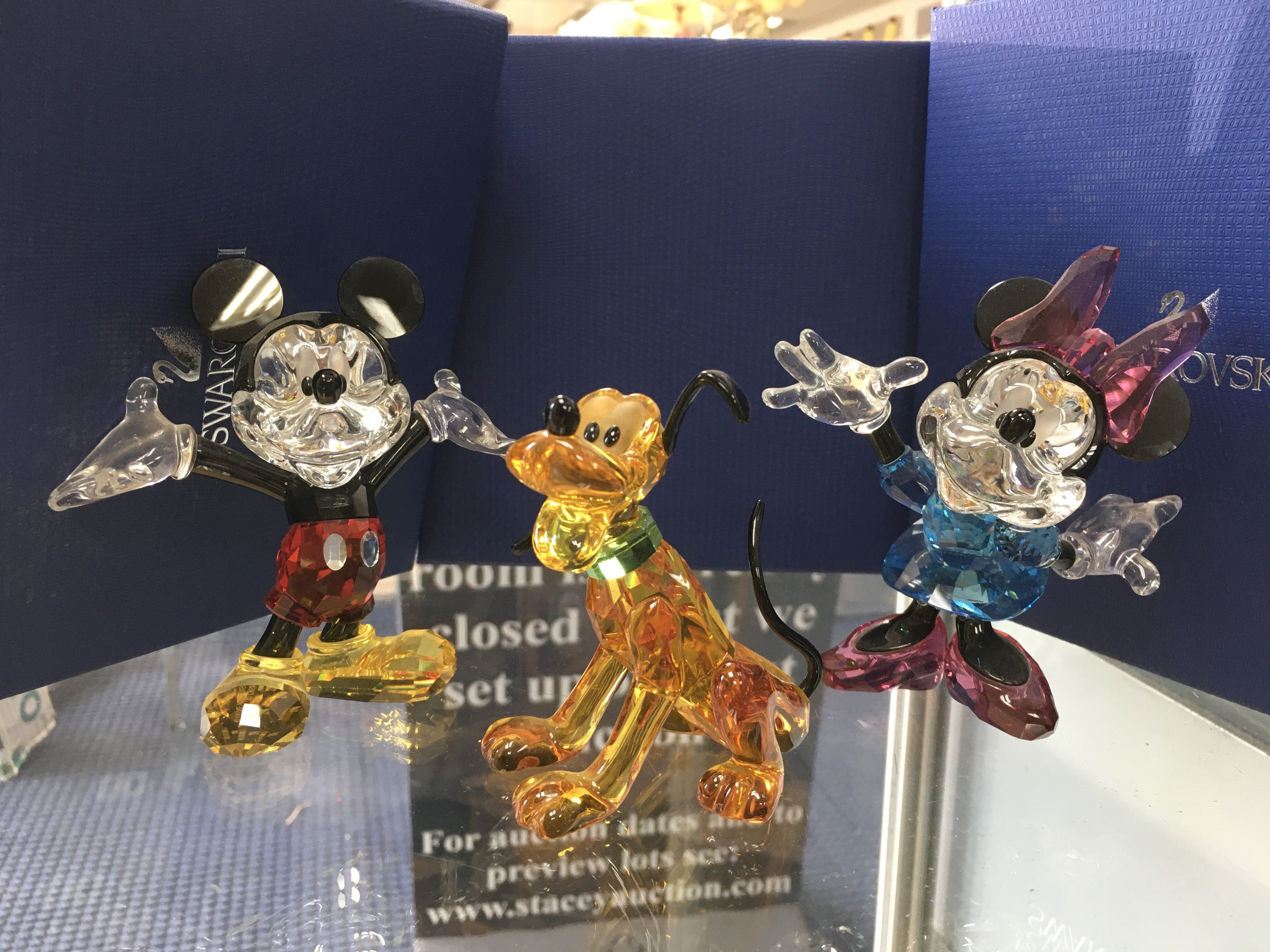 Three boxed Swarovski Disney figures including Mickey, Minnie and Pluto. No obvious damage or restoration. With certificate of authenticity