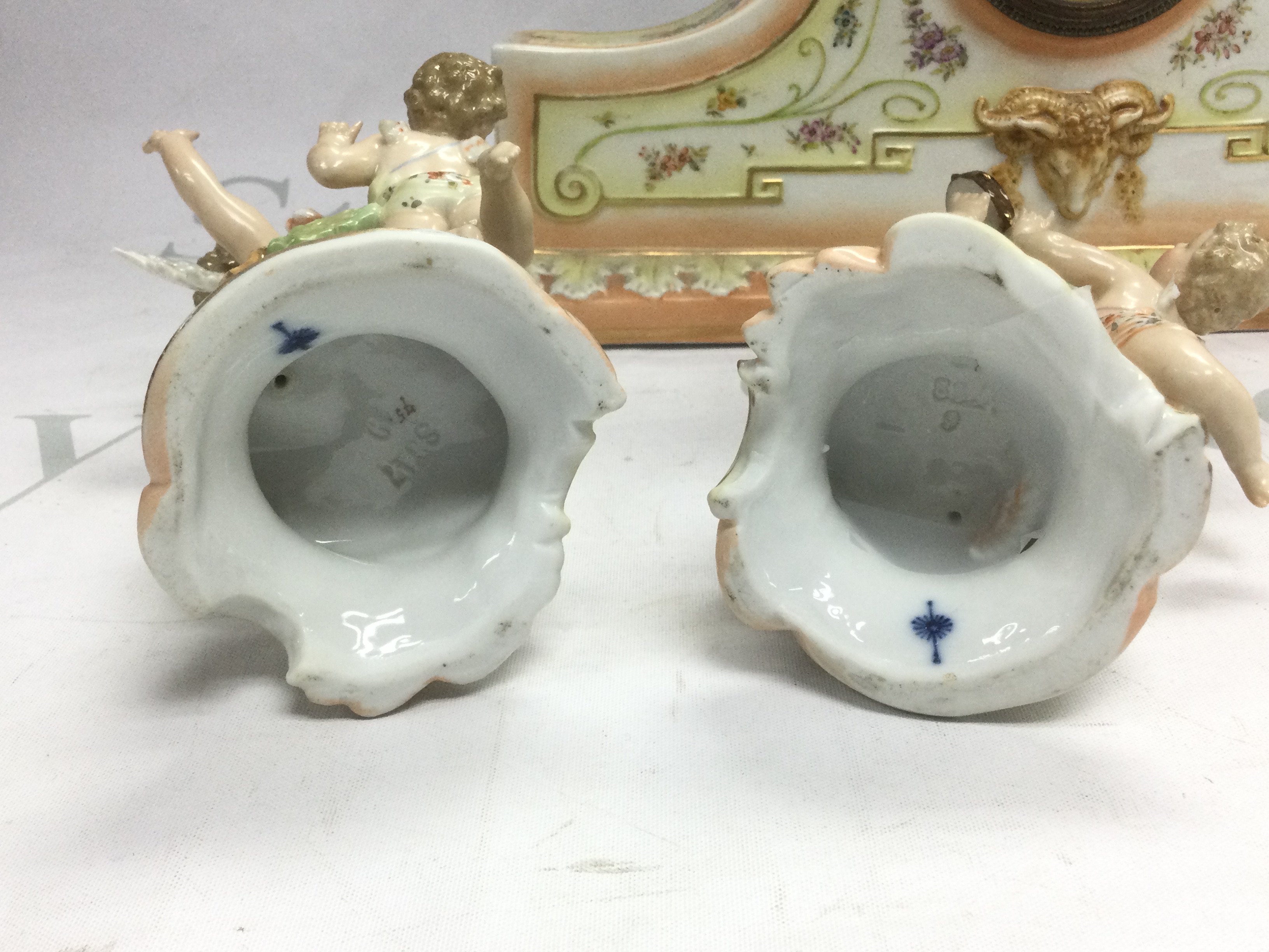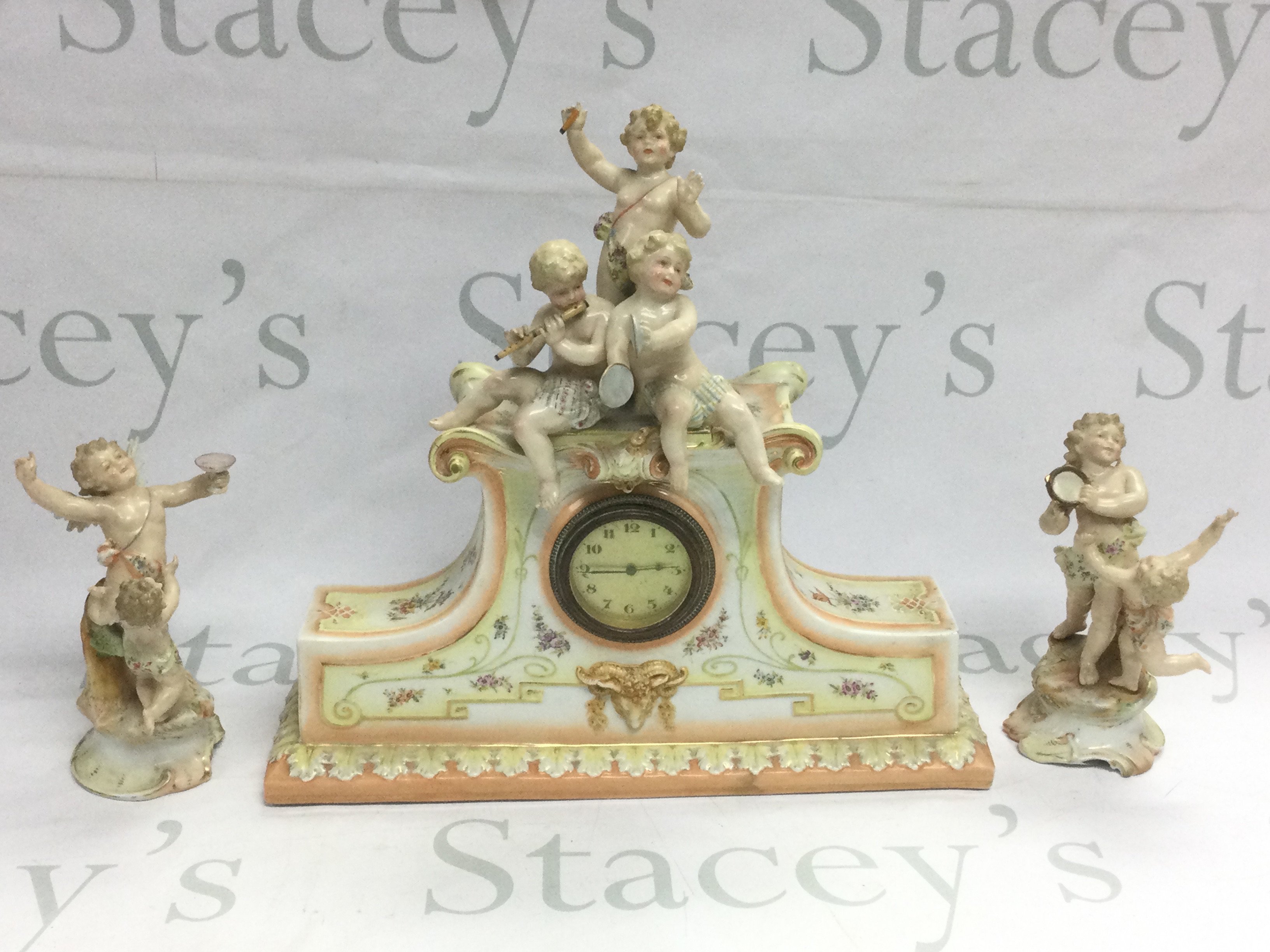 A Continental porcelain mantle clock surmounted with three cherubs and a pair of cherub clock garnitures (3). Shipping category D.