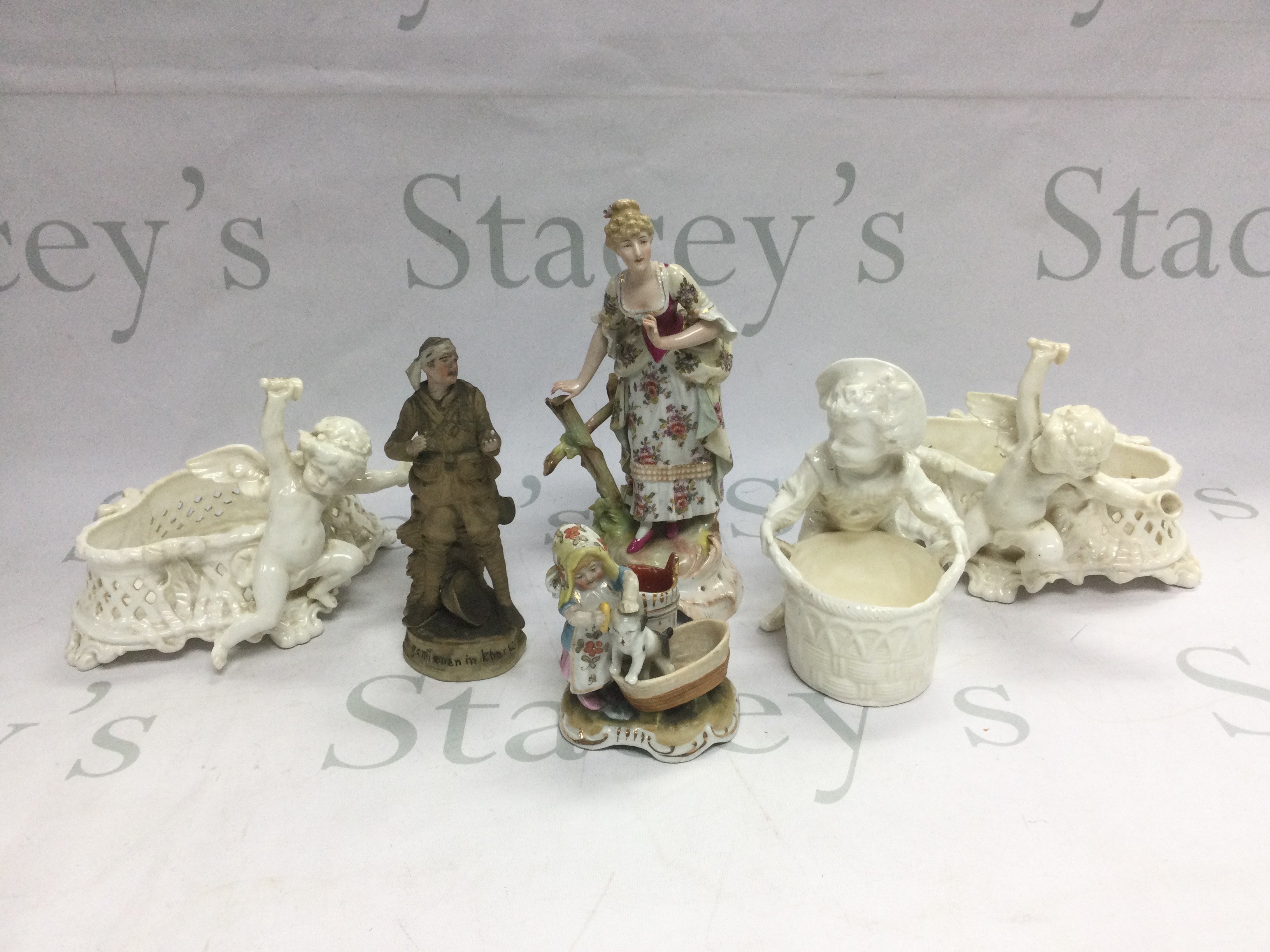 A pair of Copeland blanc de chine posies, a Victorian figural match holder and striker etc. Shipping category D. NO RESERVE