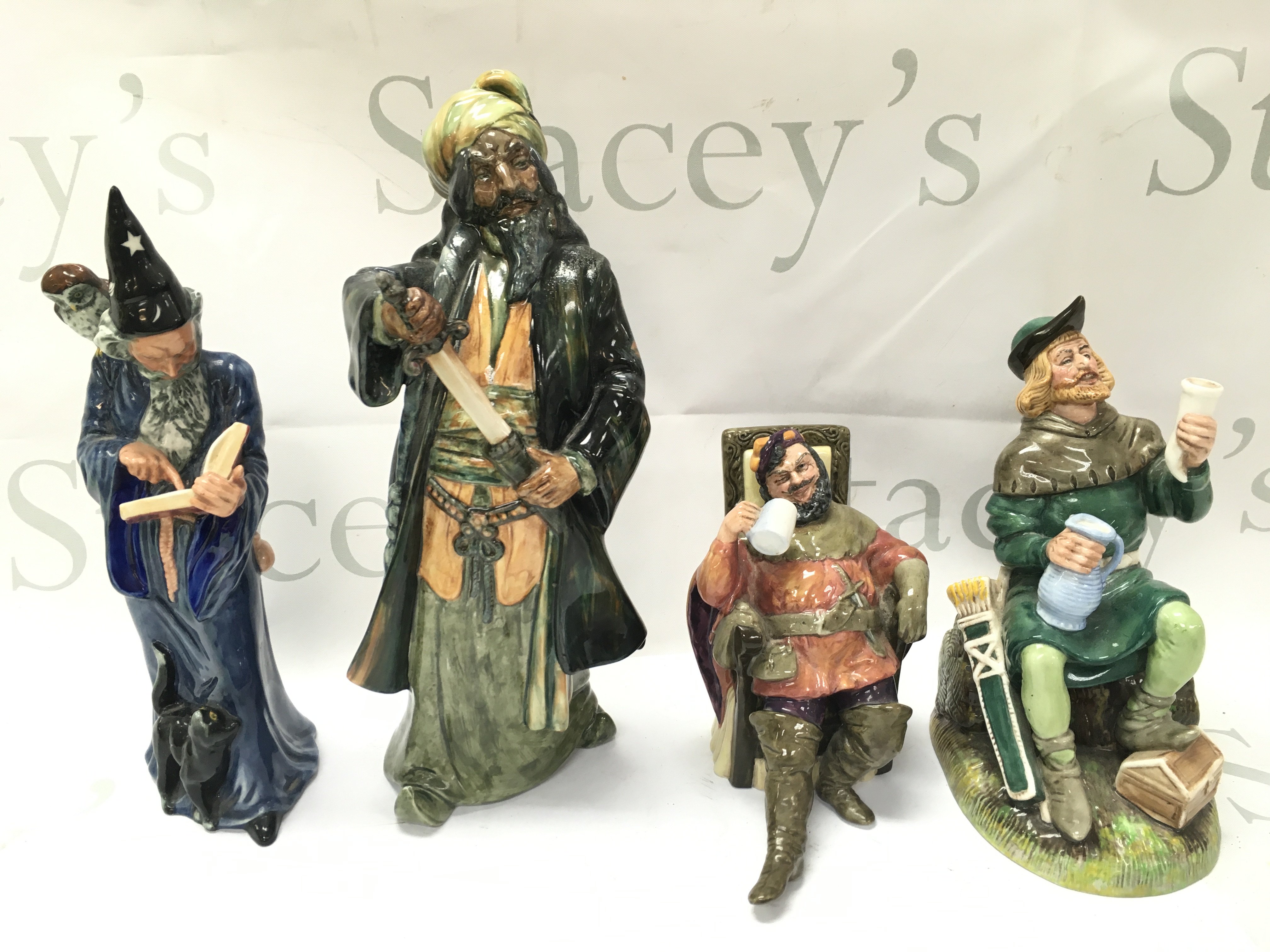 Four Royal Doulton porcelain figures including Robin Hood, The Foaming Quart, Blue Beard, The Wizard. No obvious damage or restoration