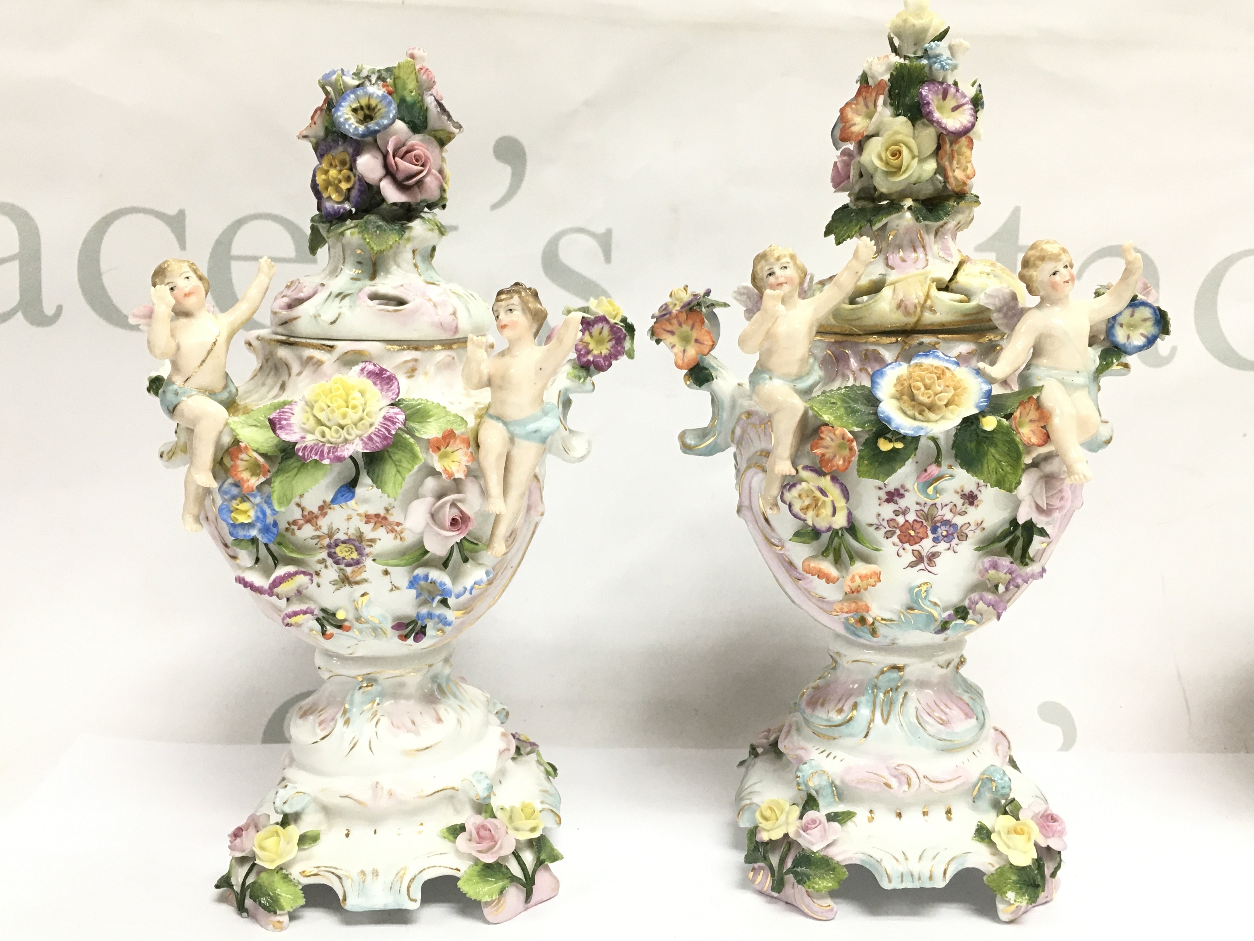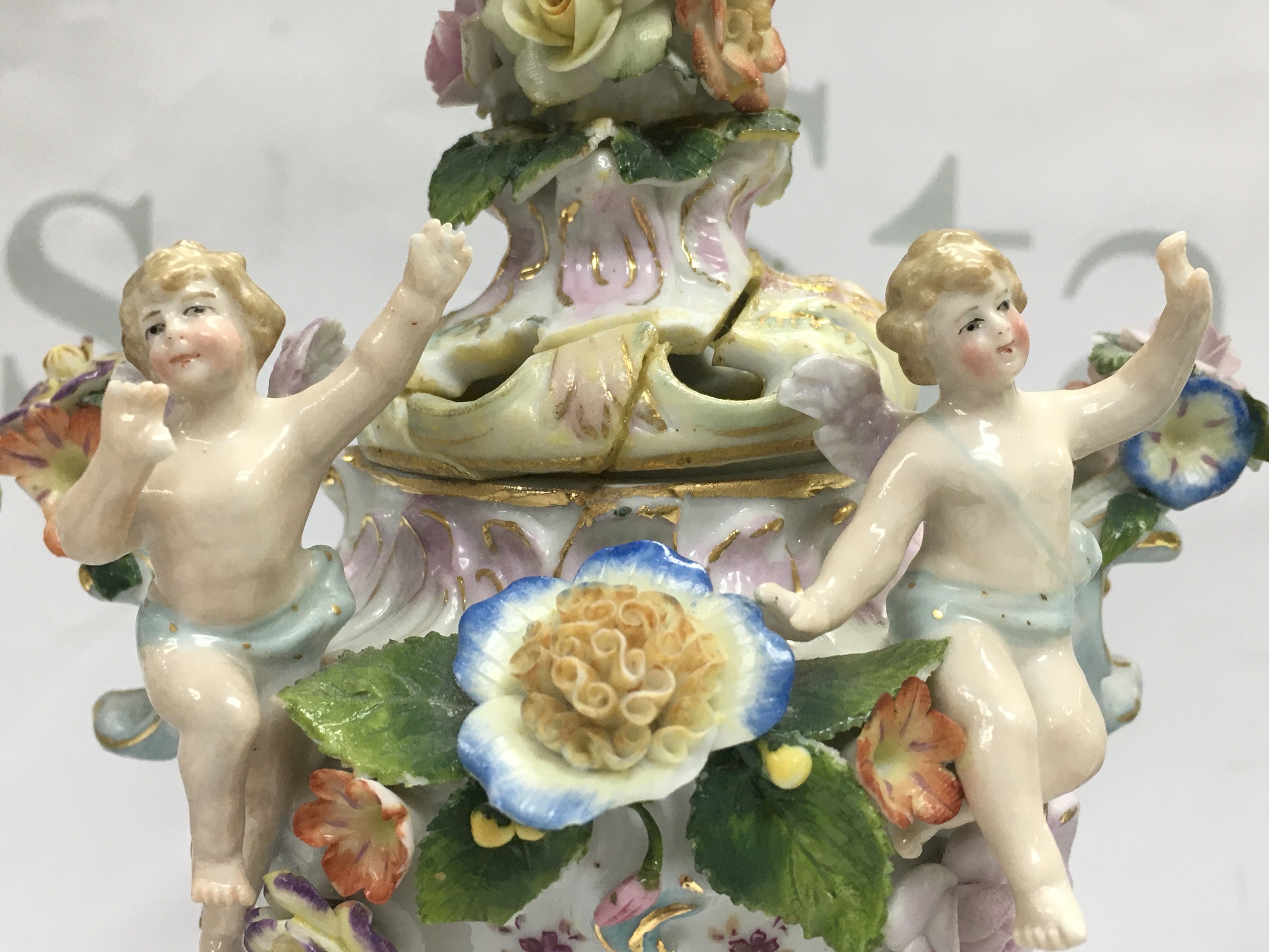 Withdrawn - A pair of Chelsea porcelain Potpourri vases , some damage . 21cm tall approximately. This lot cannot be posted
