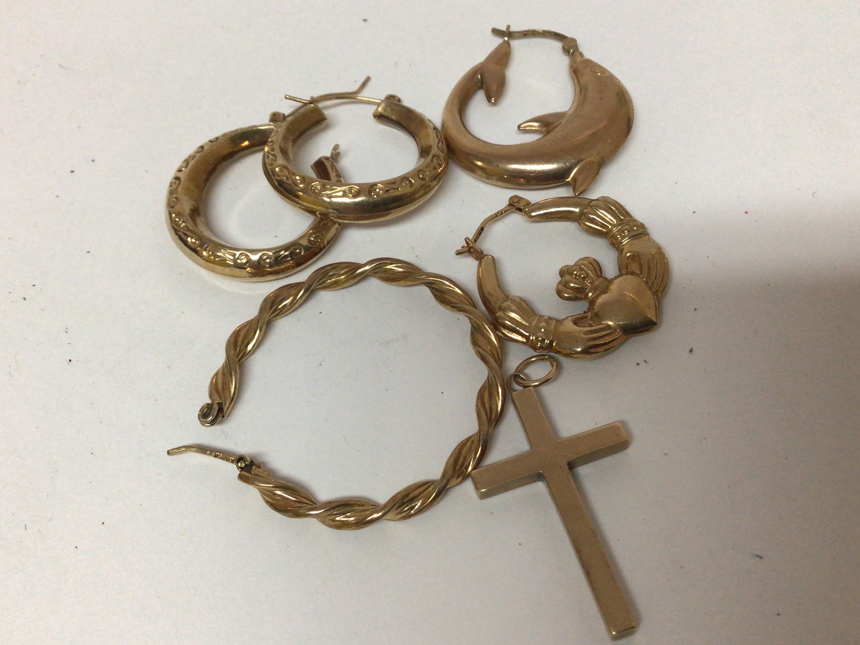 A collection of gold earrings one pair unmarked and a 9carat gold cross. Weight 10g