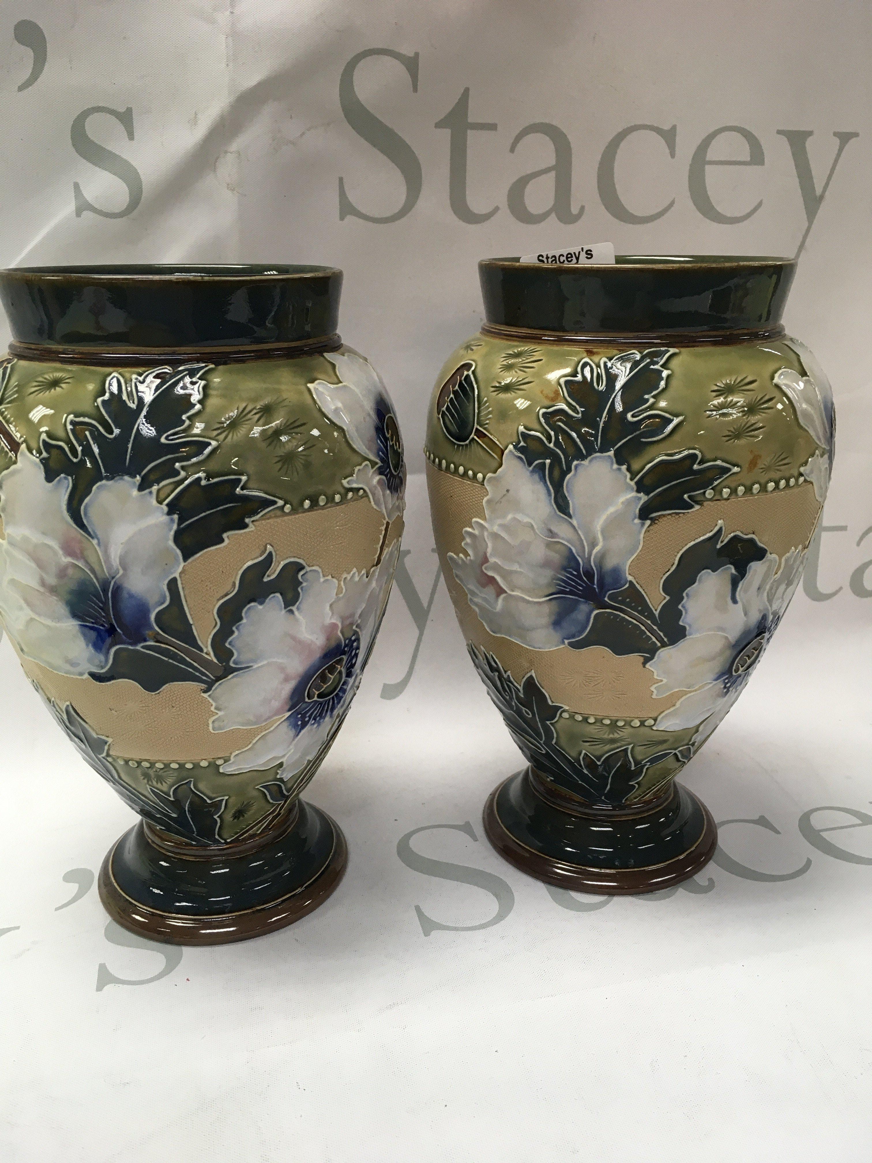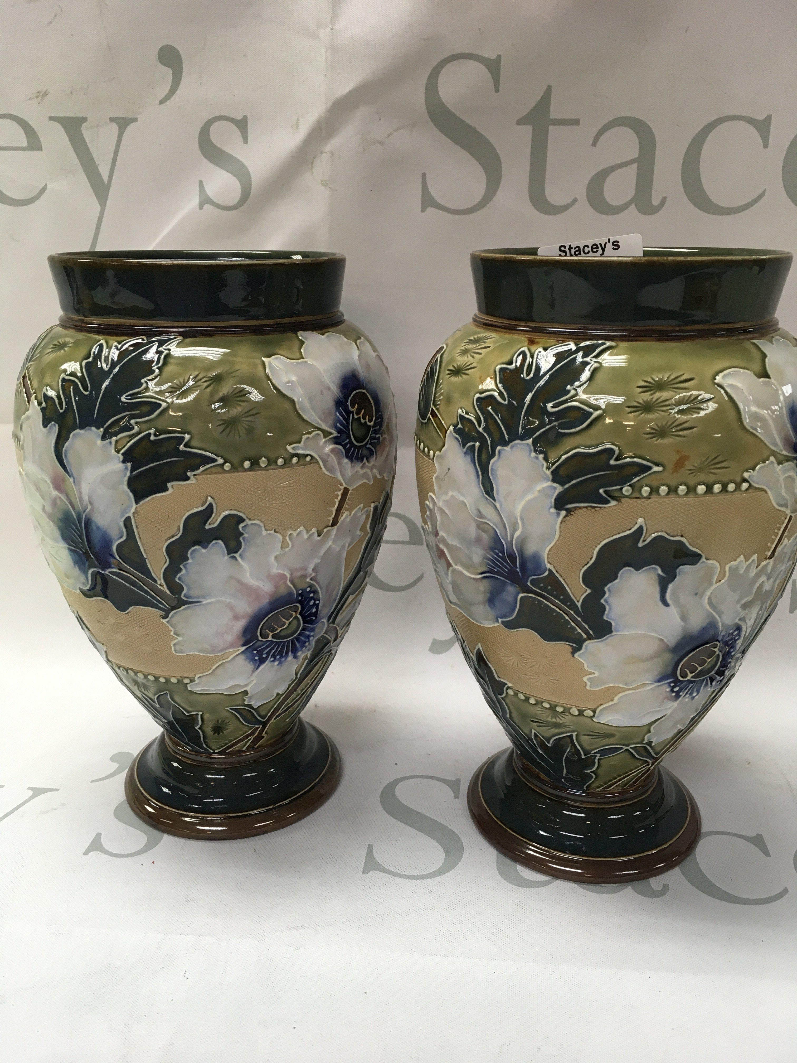 A pair of Doulton vases decorated with flowers and foliage. 20 cm no damage or restoration .