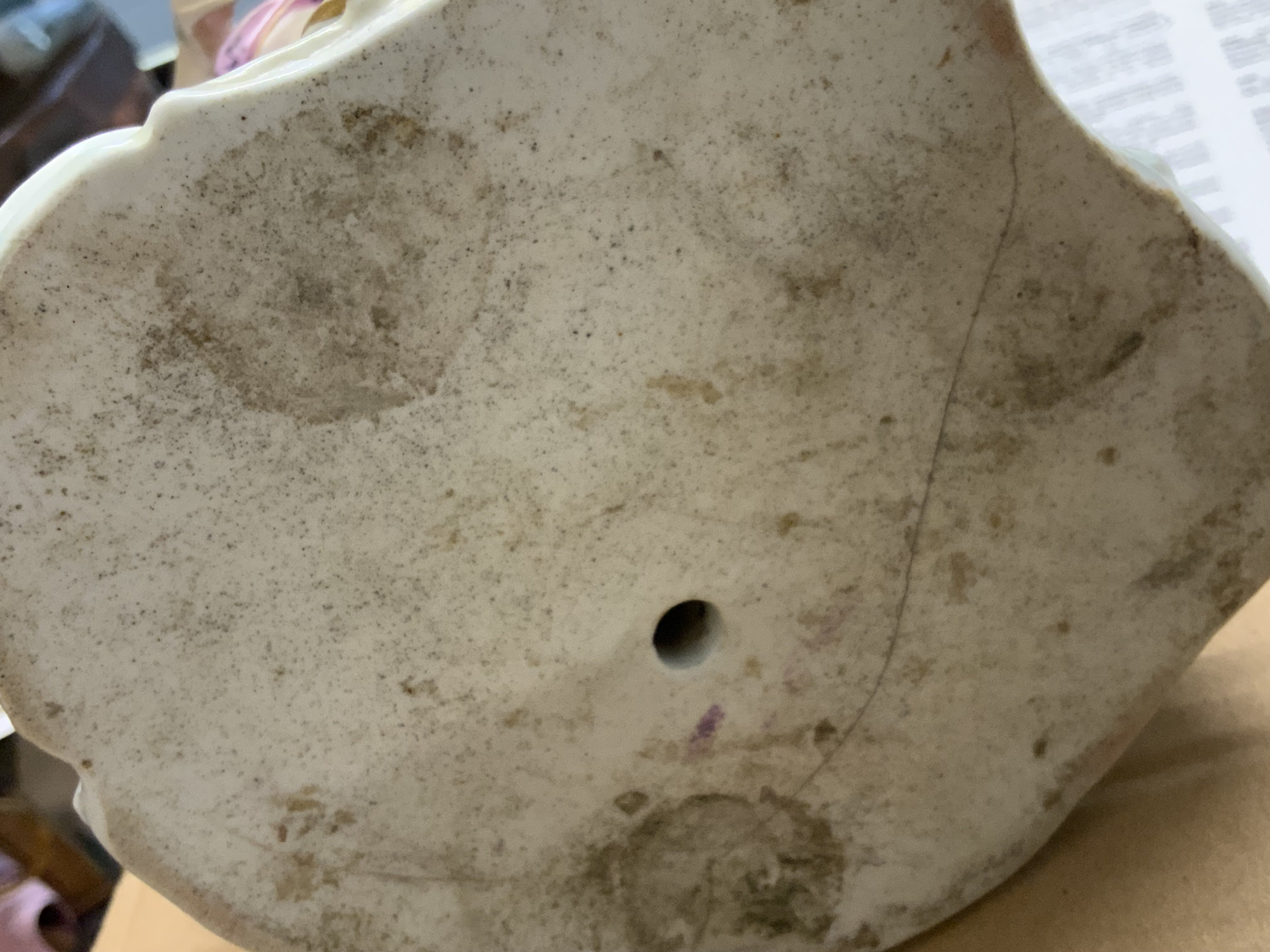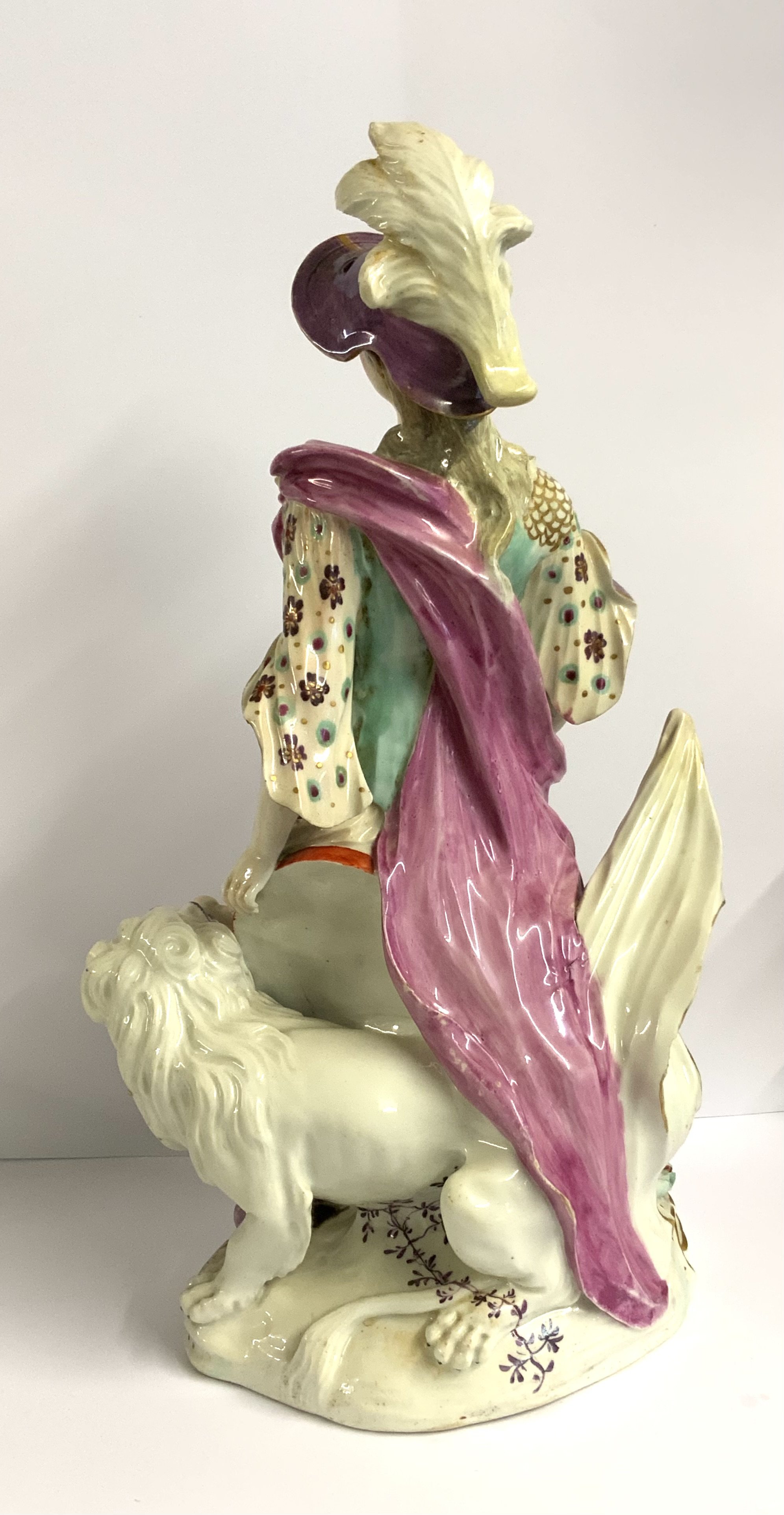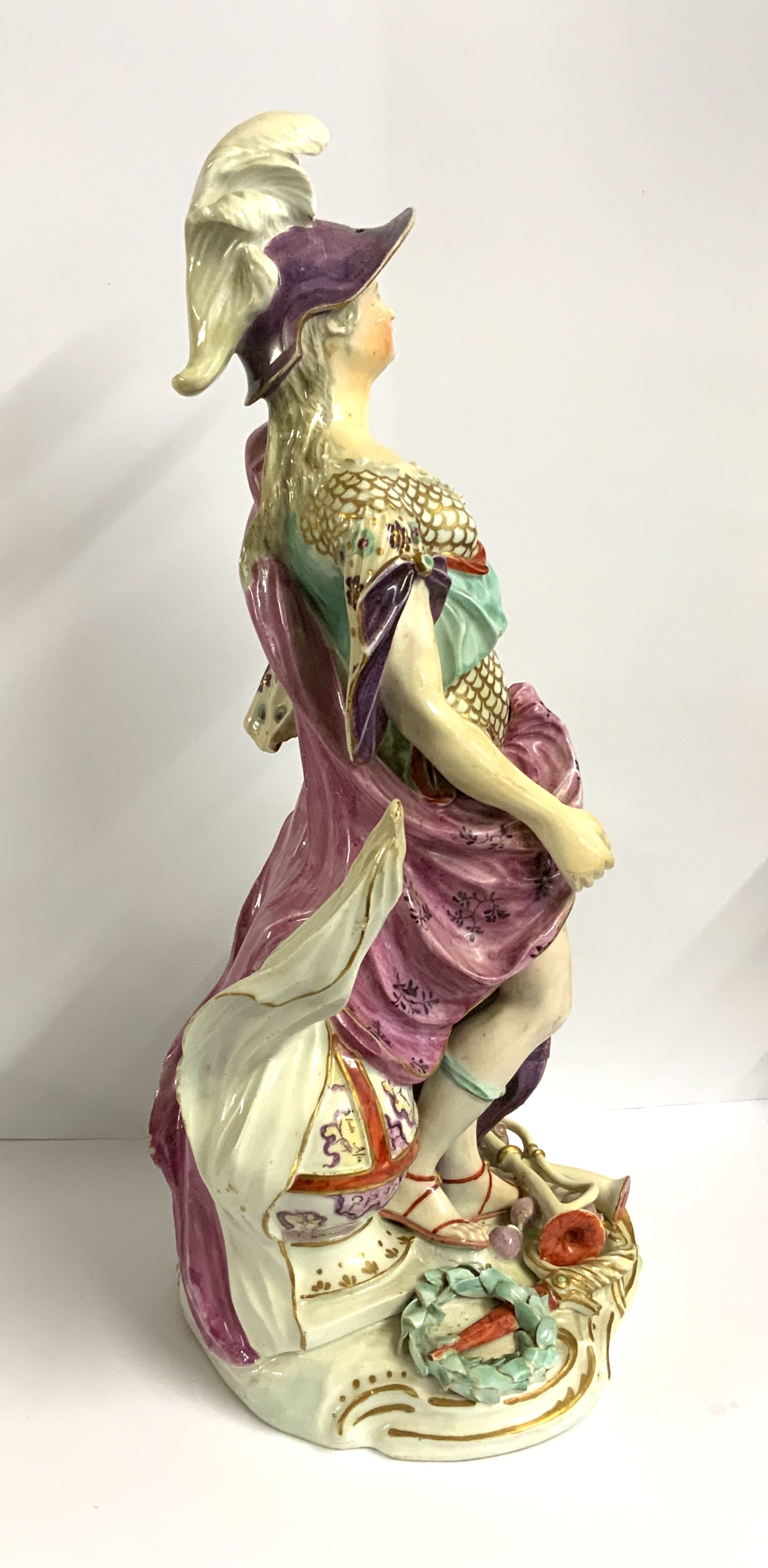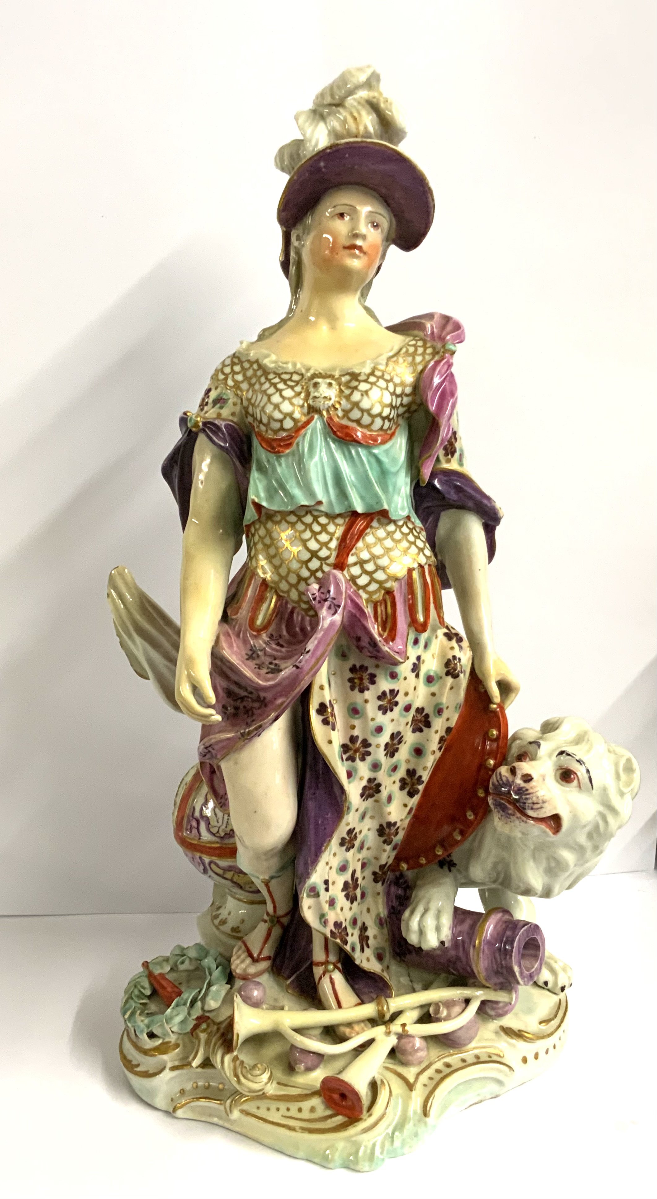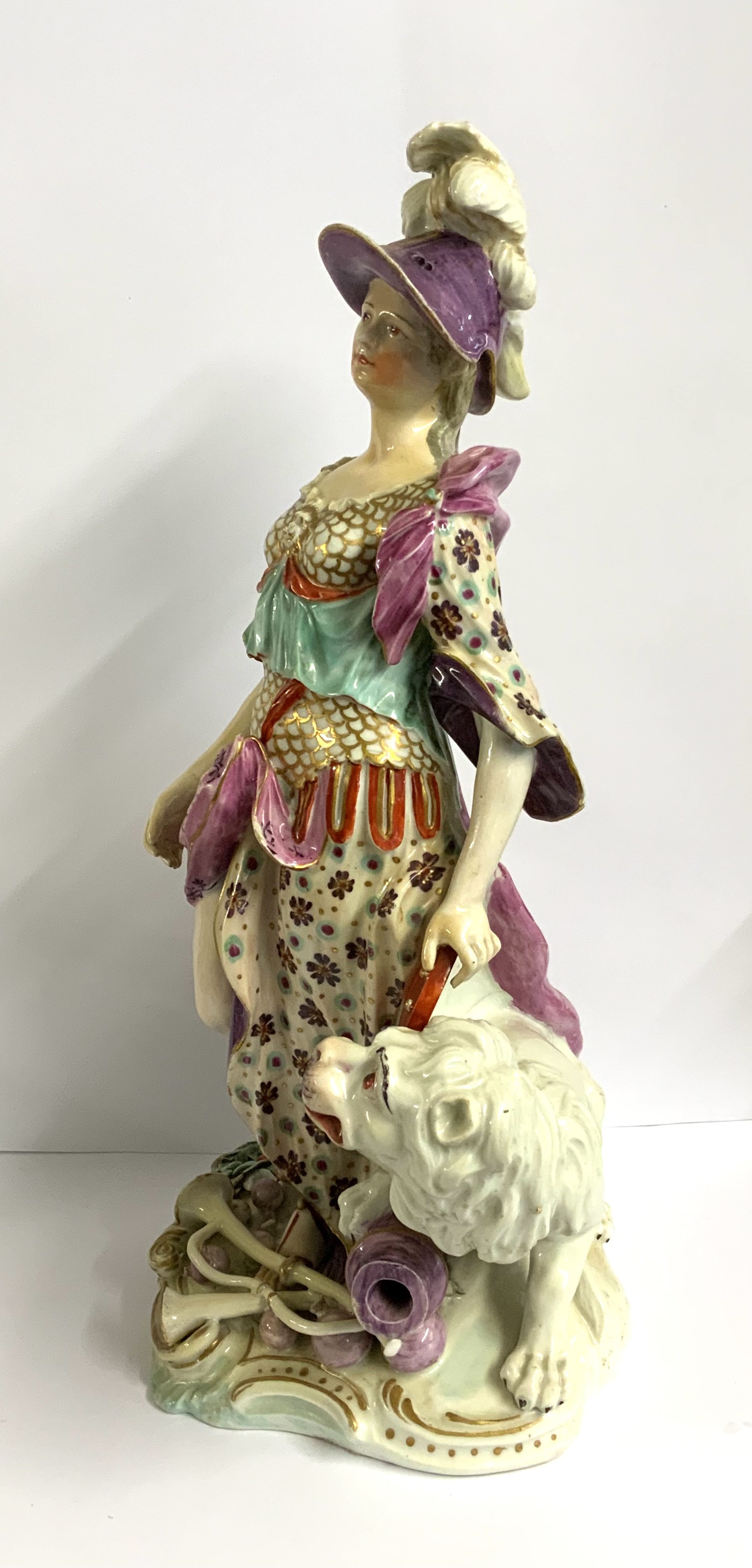 A large Derby porcelain figure, Britannia, circa.1765, standing beside a lion, and with trophies at her feet, patch marks, some possible restoration, 32cm. (D)
