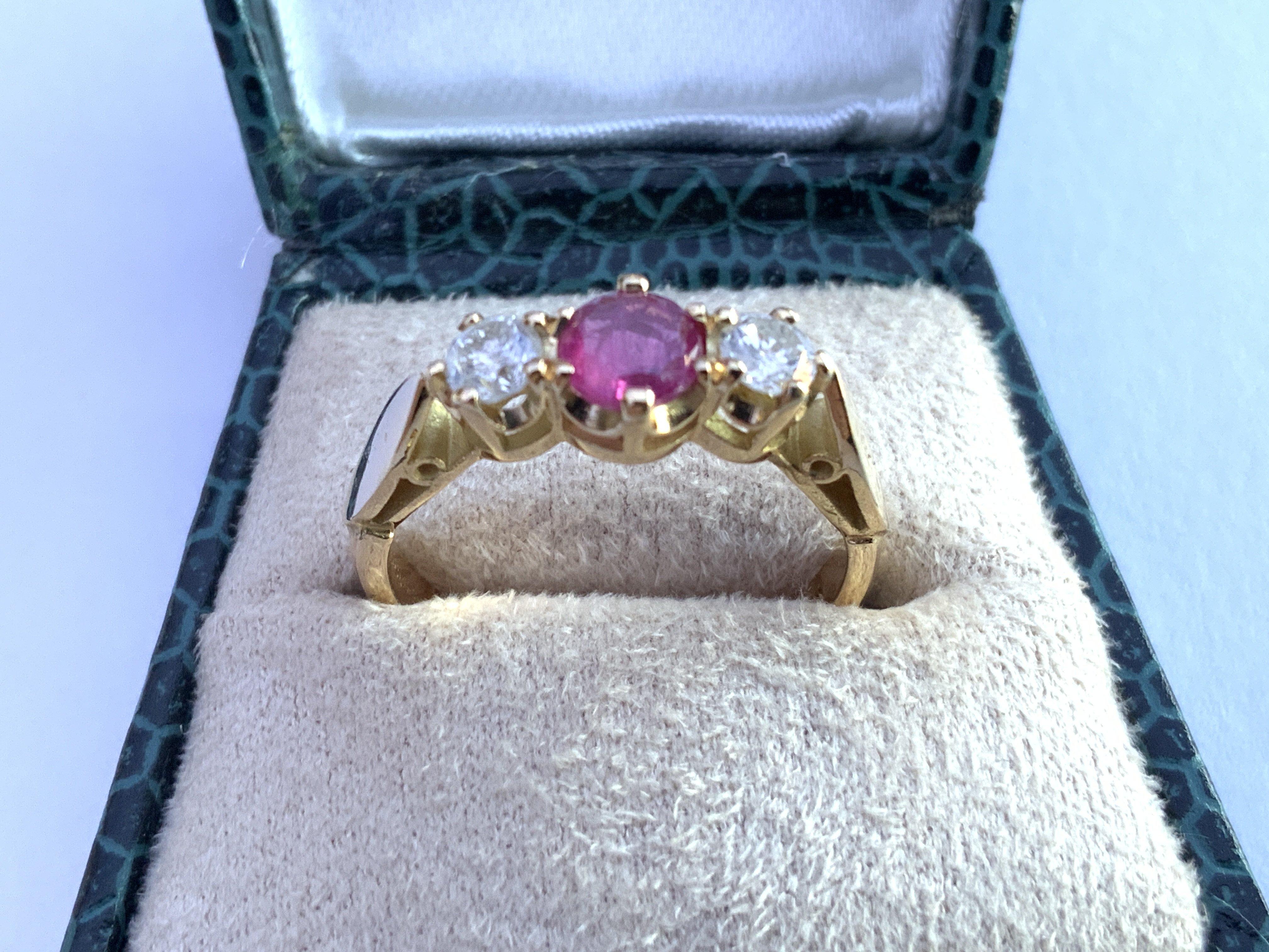 Vintage 18ct yellow gold 3 stone ruby and diamond ring with stylish box. RBC diamonds 0.34ct. R/C ruby 0.58ct. Postage category A.