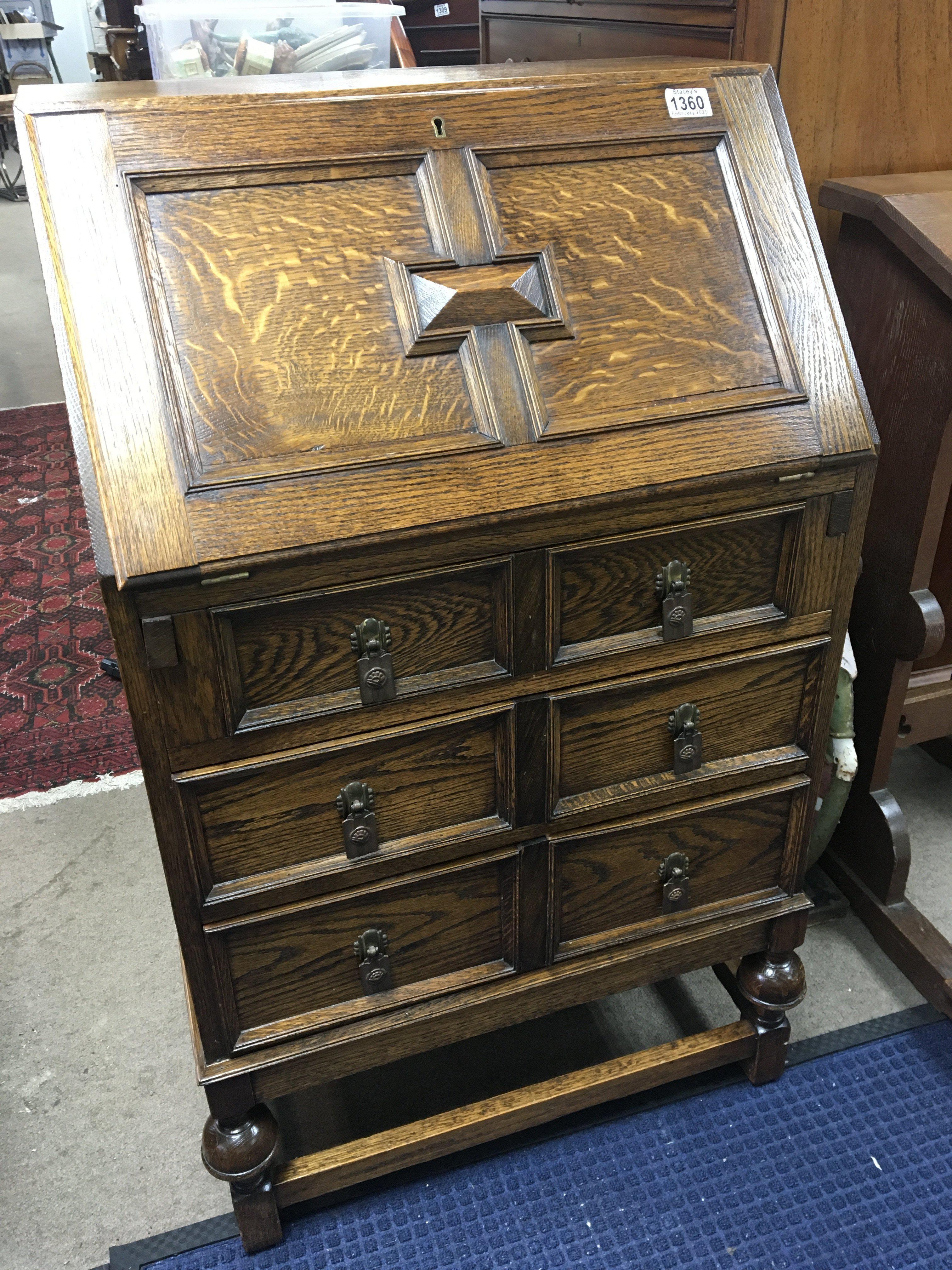 An oak bureau with a rectangular fall front with a fitted interior above three drawers. Width 61cm. NO RESERVE