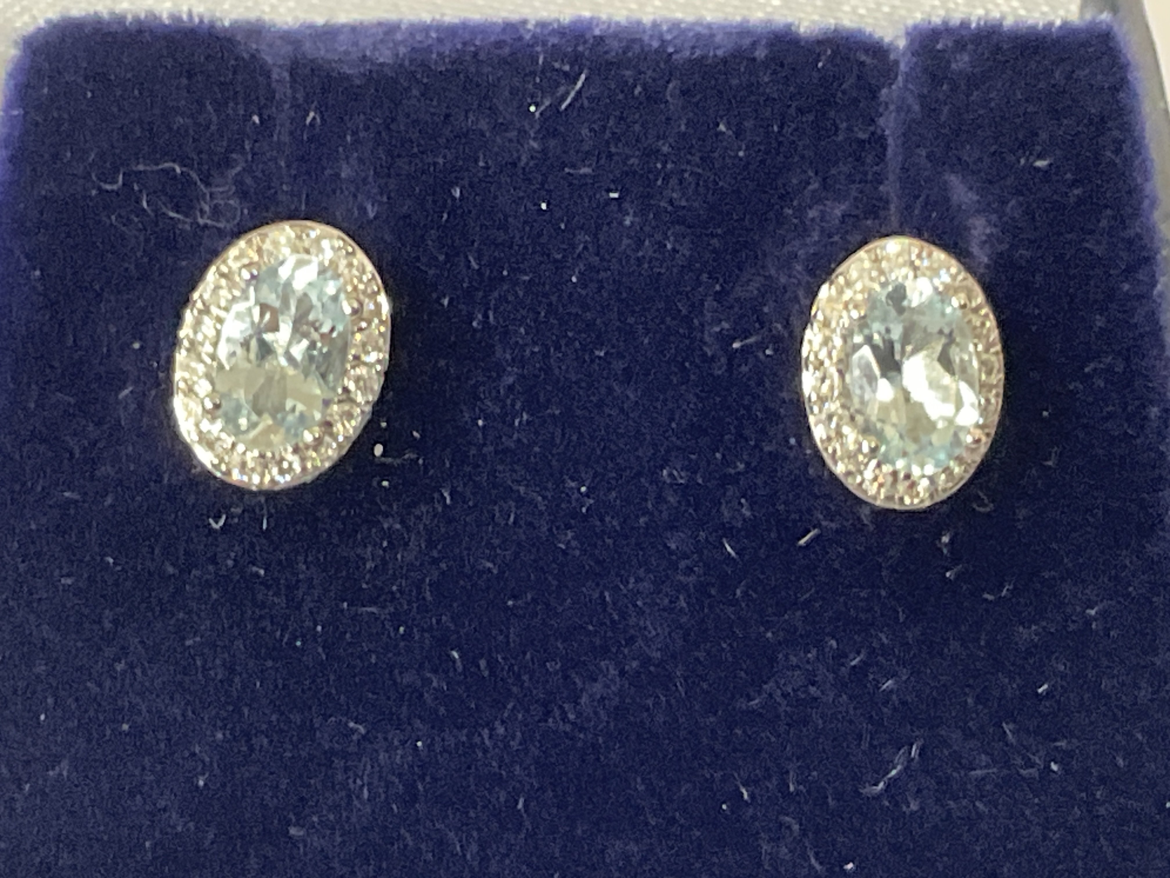 Pair of 9ct white gold oval aquamarine and RBC diamond cluster studs, boxed. Aquamarine 0.60ct. Diamonds 0.13ct. Postage category A.