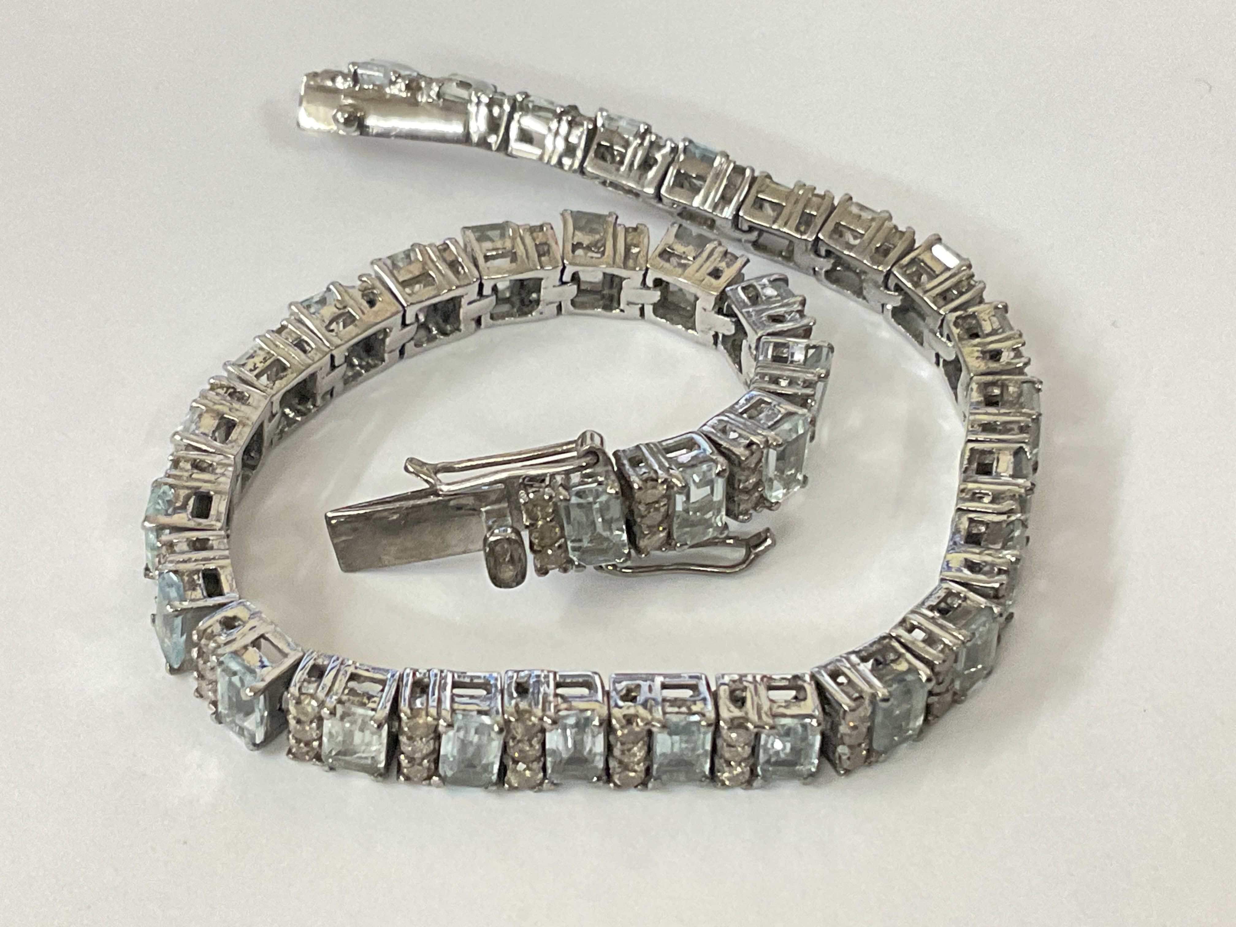 Art deco style articulated bracelet set with baguette cut aquamarines and R/C diamonds, boxed. Aquamarines 9.60ct. Diamonds 2.41ct. Postage category A.