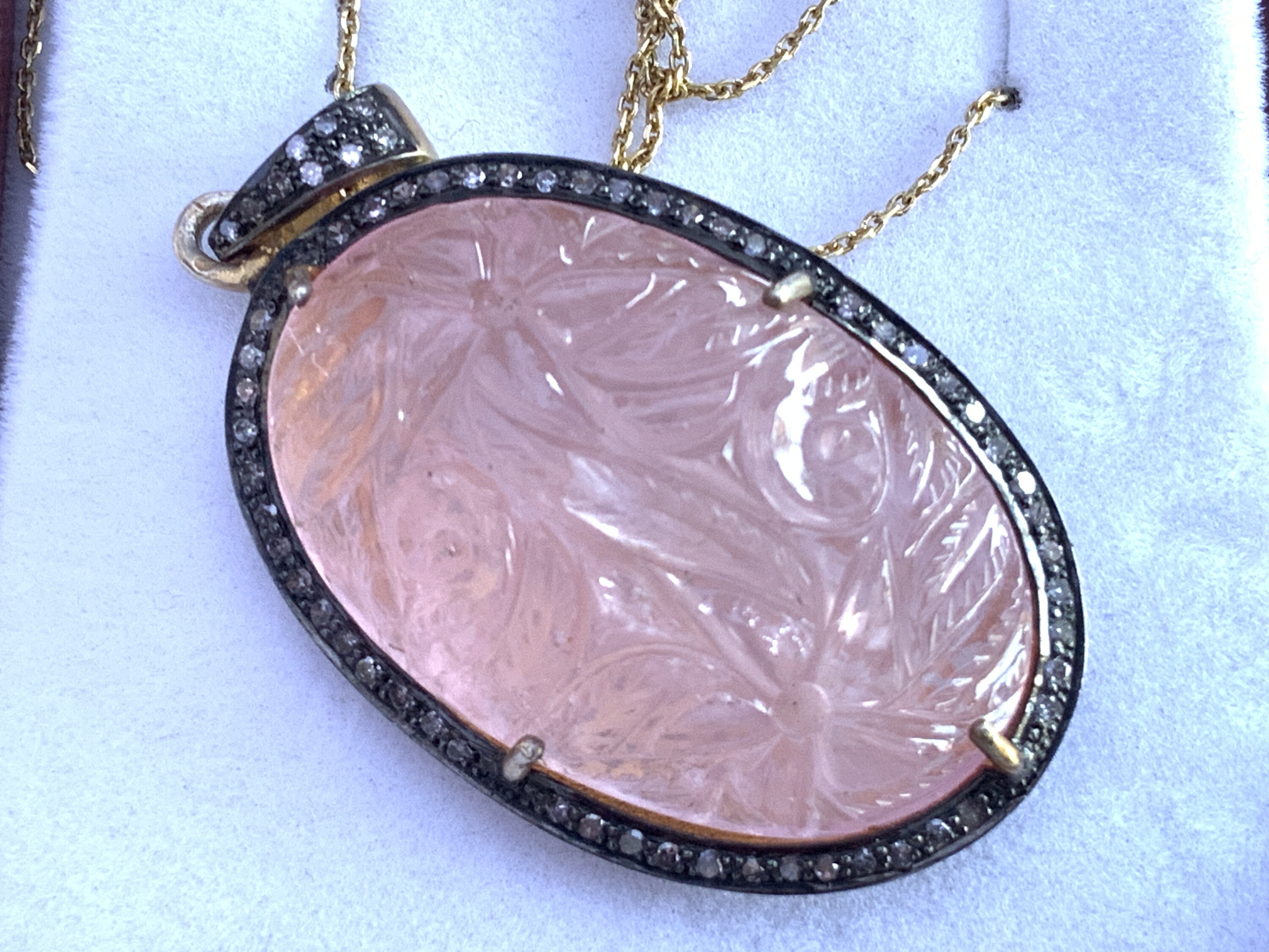 Large hand carved rose quartz pendant with diamond set halo and bale and diamond halo on gold plated silver chain, boxed. Postage category A.