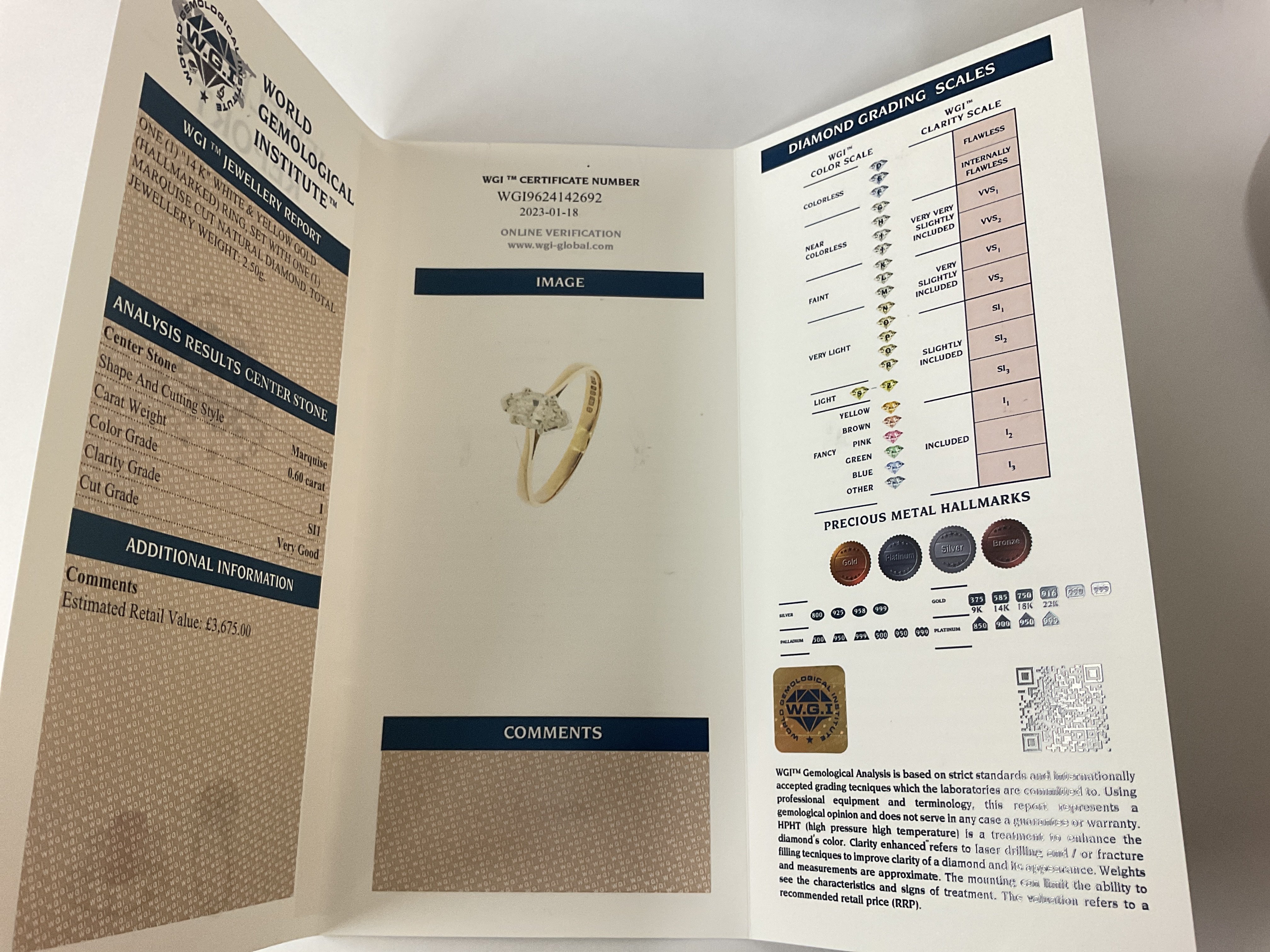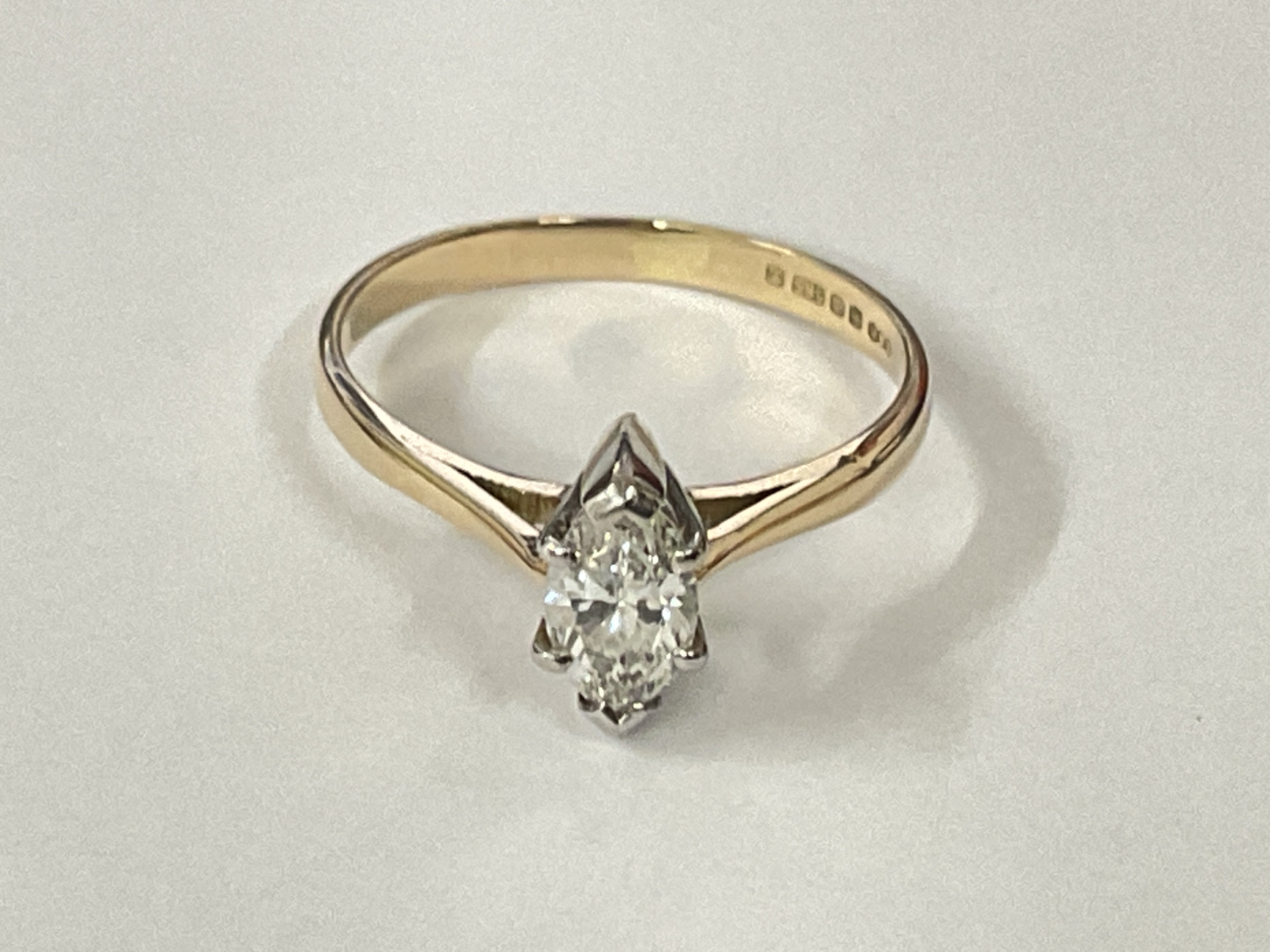 Certificated 14ct yellow and white gold marquise cut diamond solitaire ring. Diamond 0.60ct. Cert no. WGI9624142692. Postage category A.