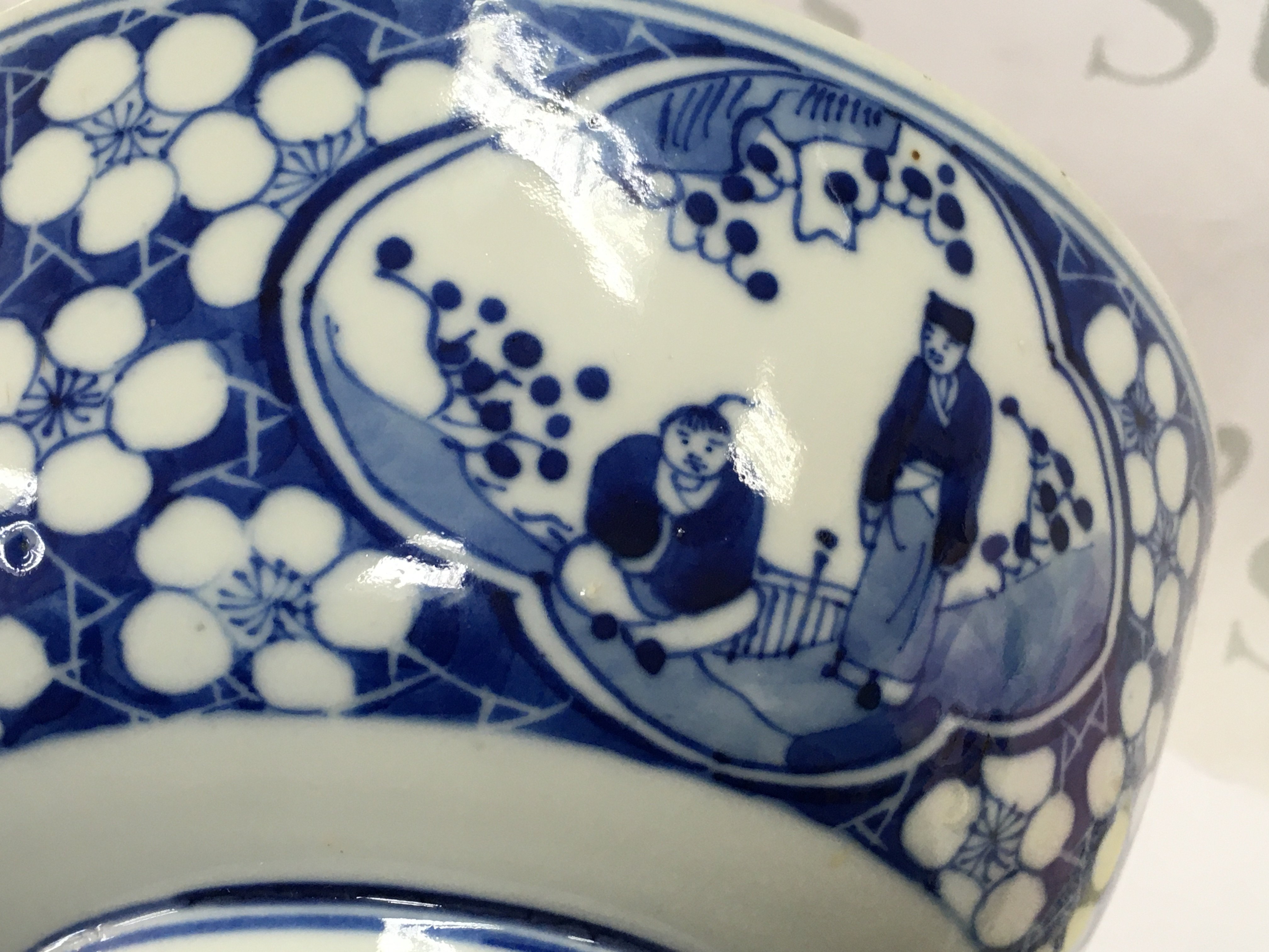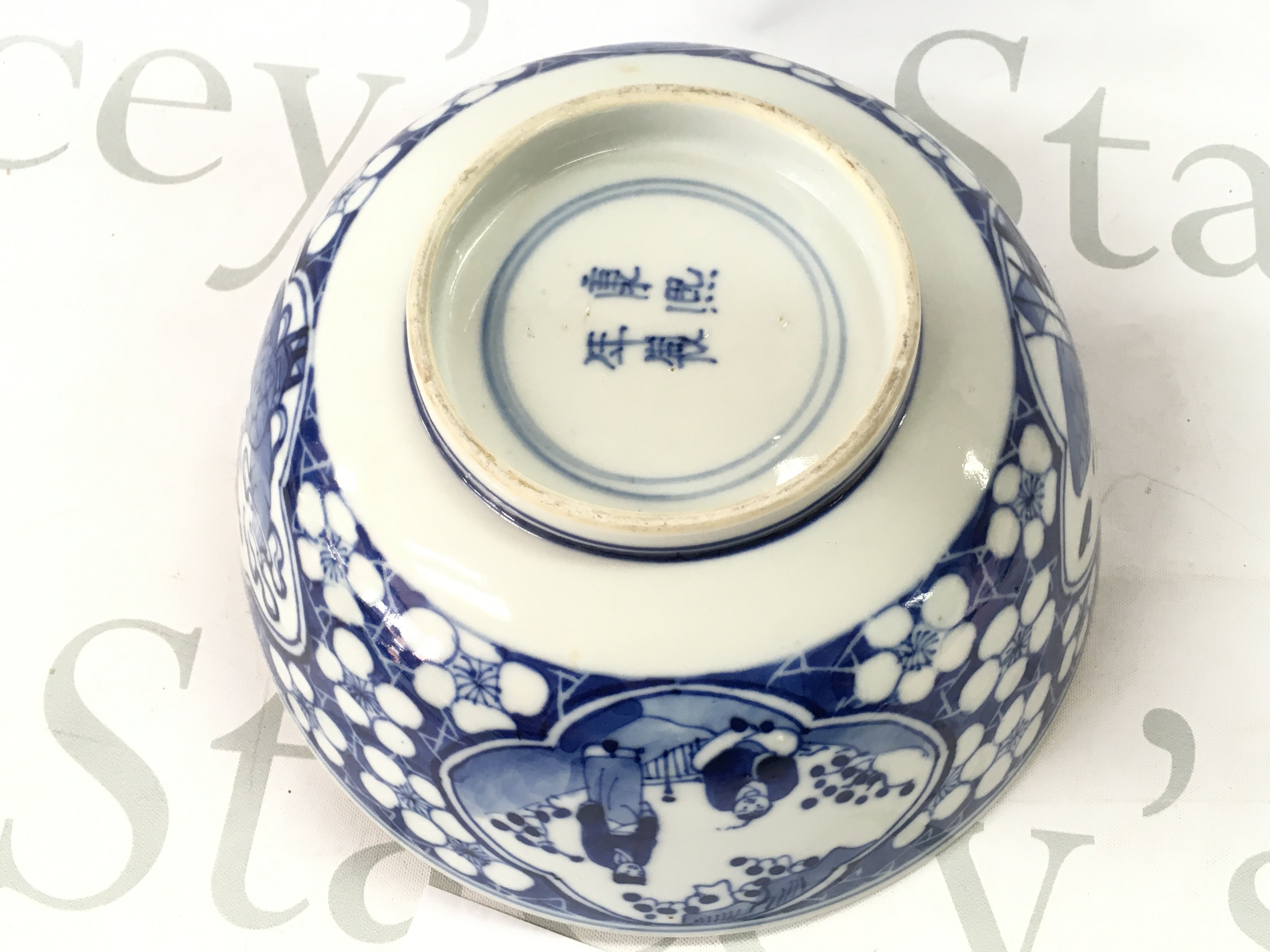 A 19th century Chinese blue and white bowl decorated with figures and cherry blossom. Four character mark at the base, 20.5cm wide. Small chips seen .This lot cannot be posted