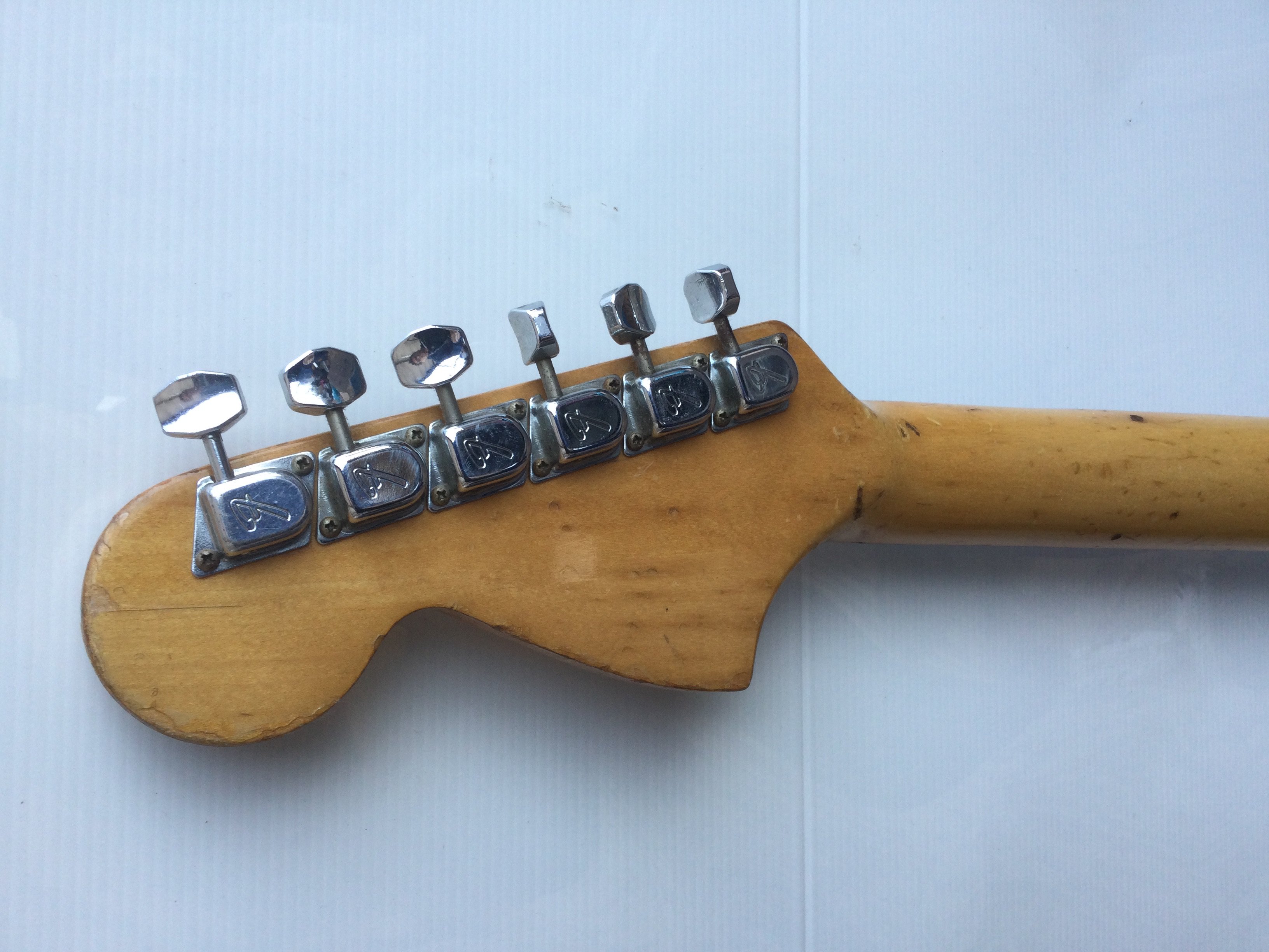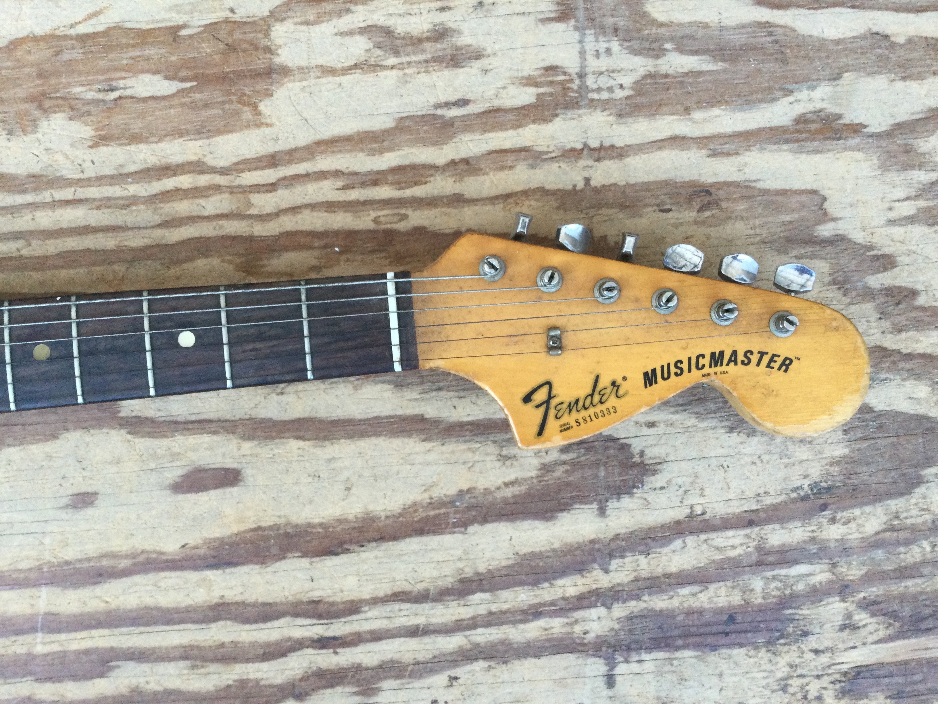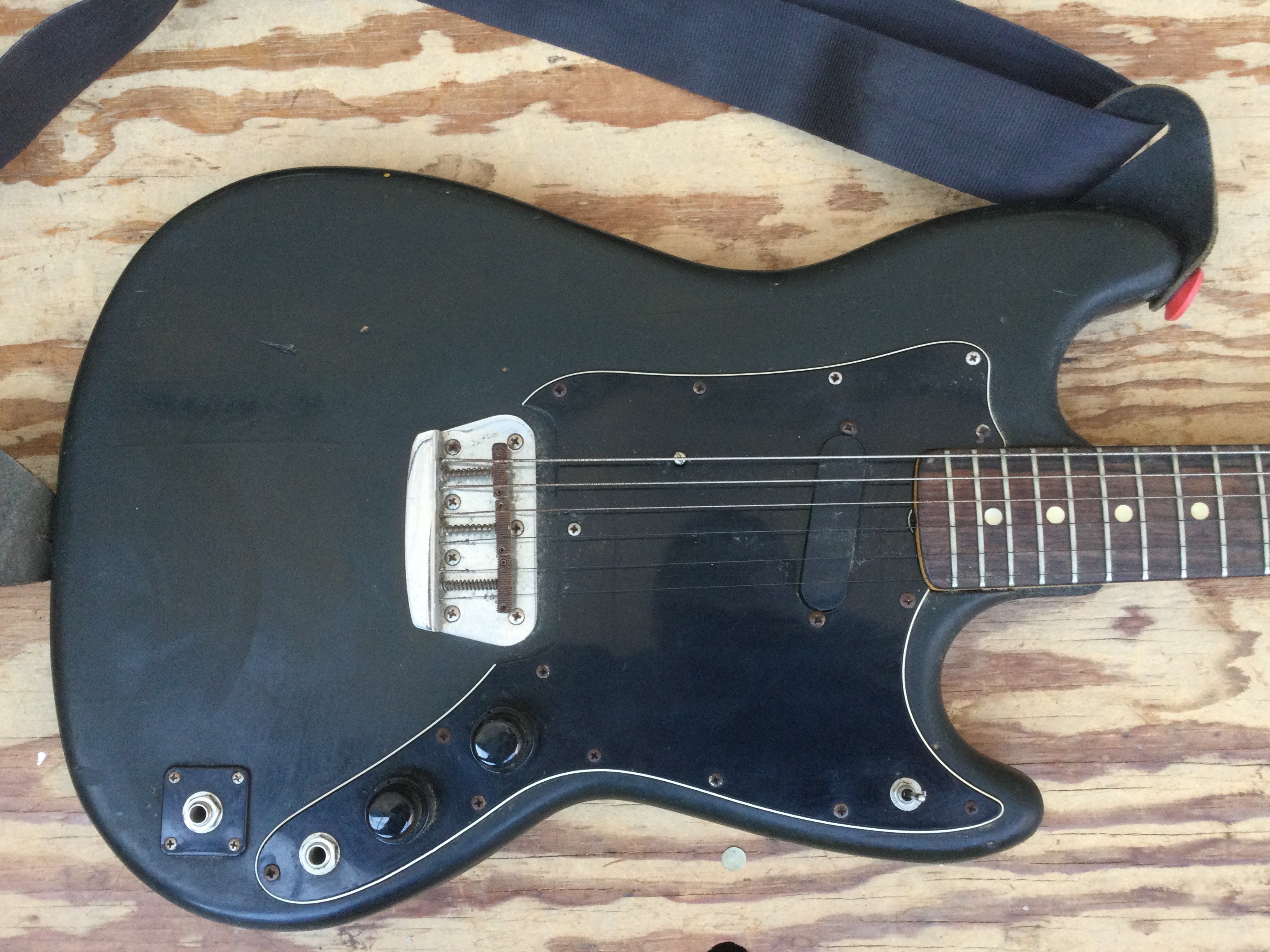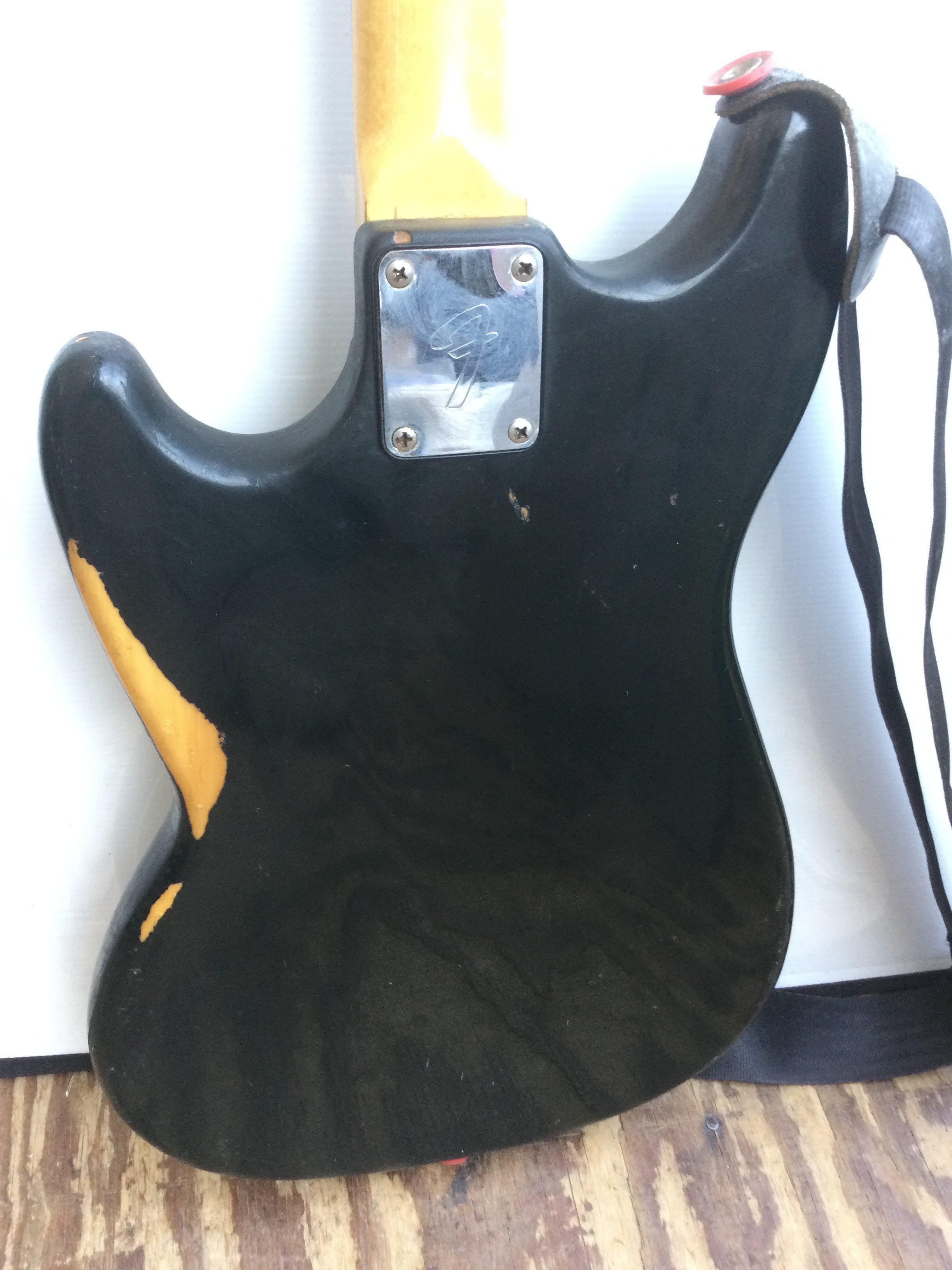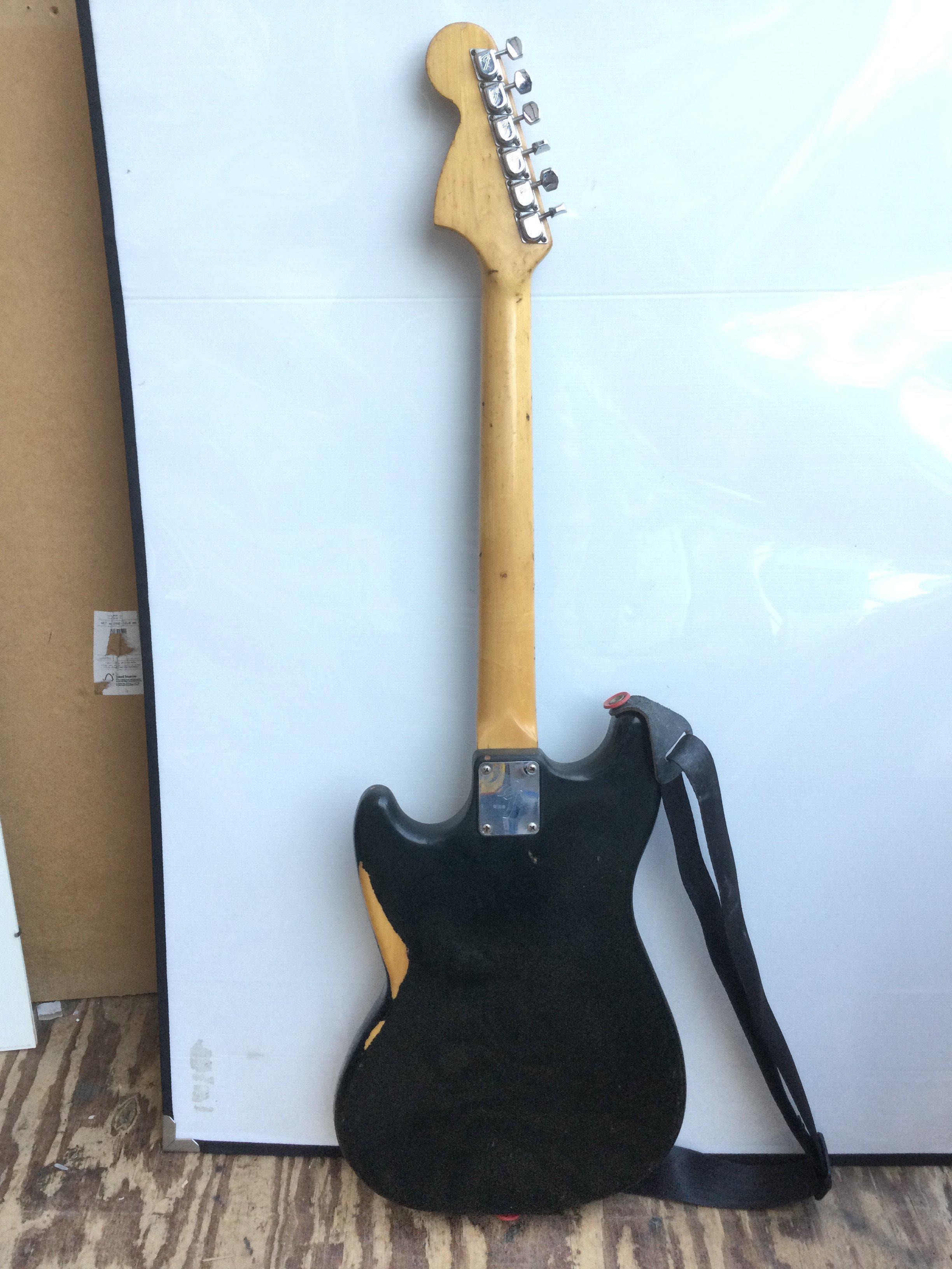 A 1978 Fender Musicmaster electric guitar modified with two jack plates and replacement tone and volume pots plus further modifications. Comes with a Fender branded soft carry case.