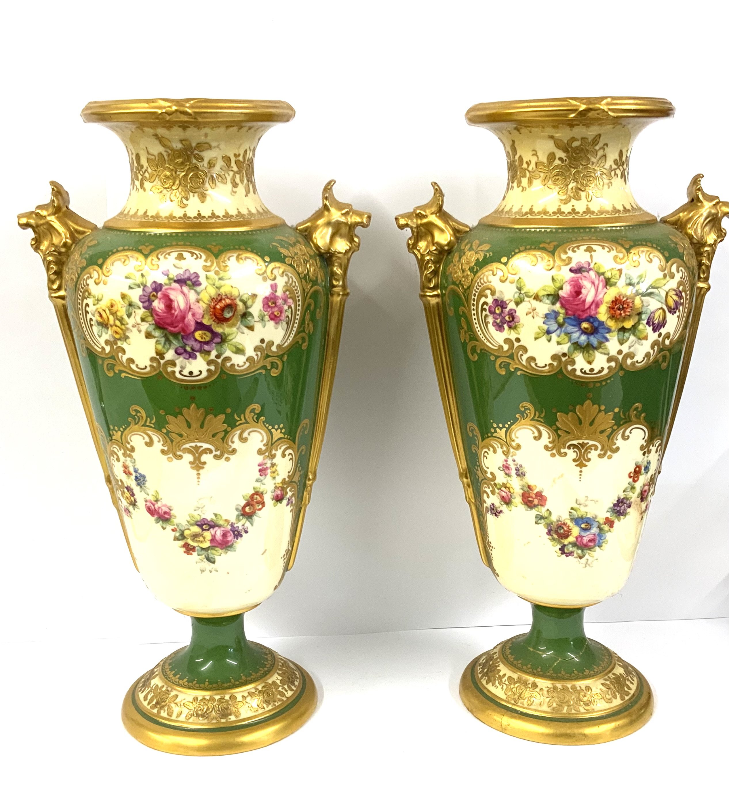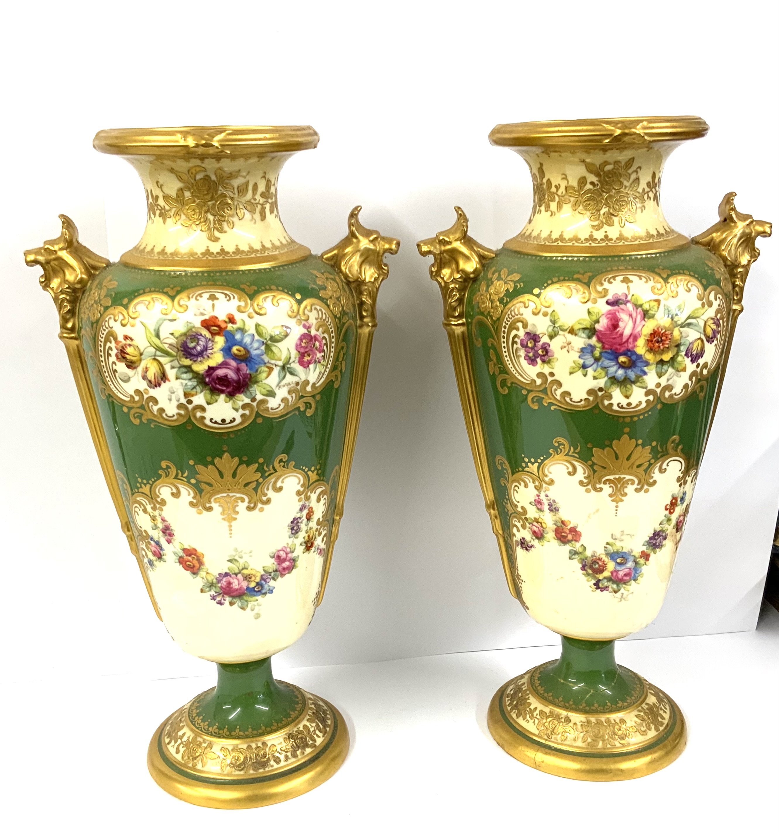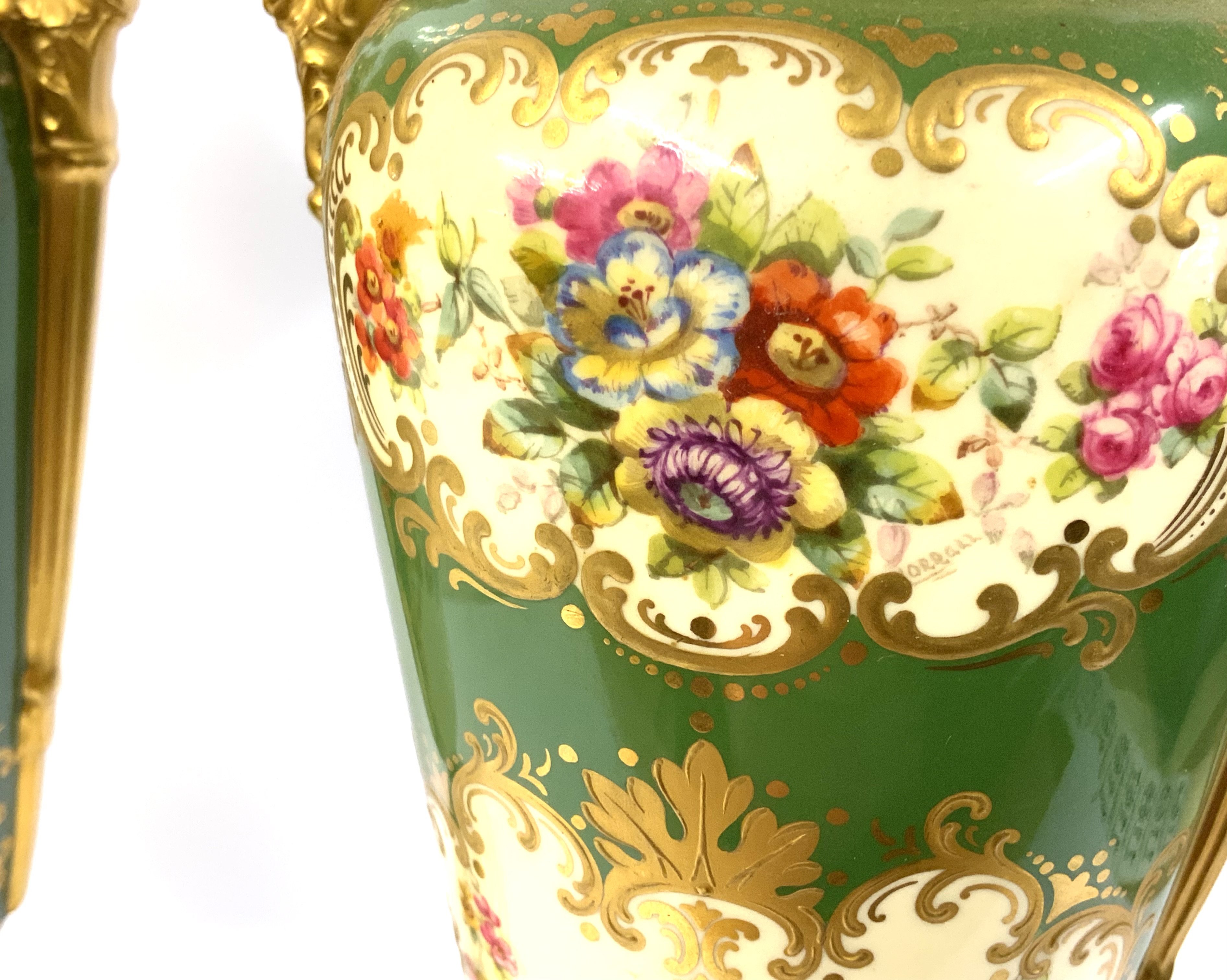 A pair of Copeland Spode porcelain vases signed J Worrall, 25cm (1 with significant damage)