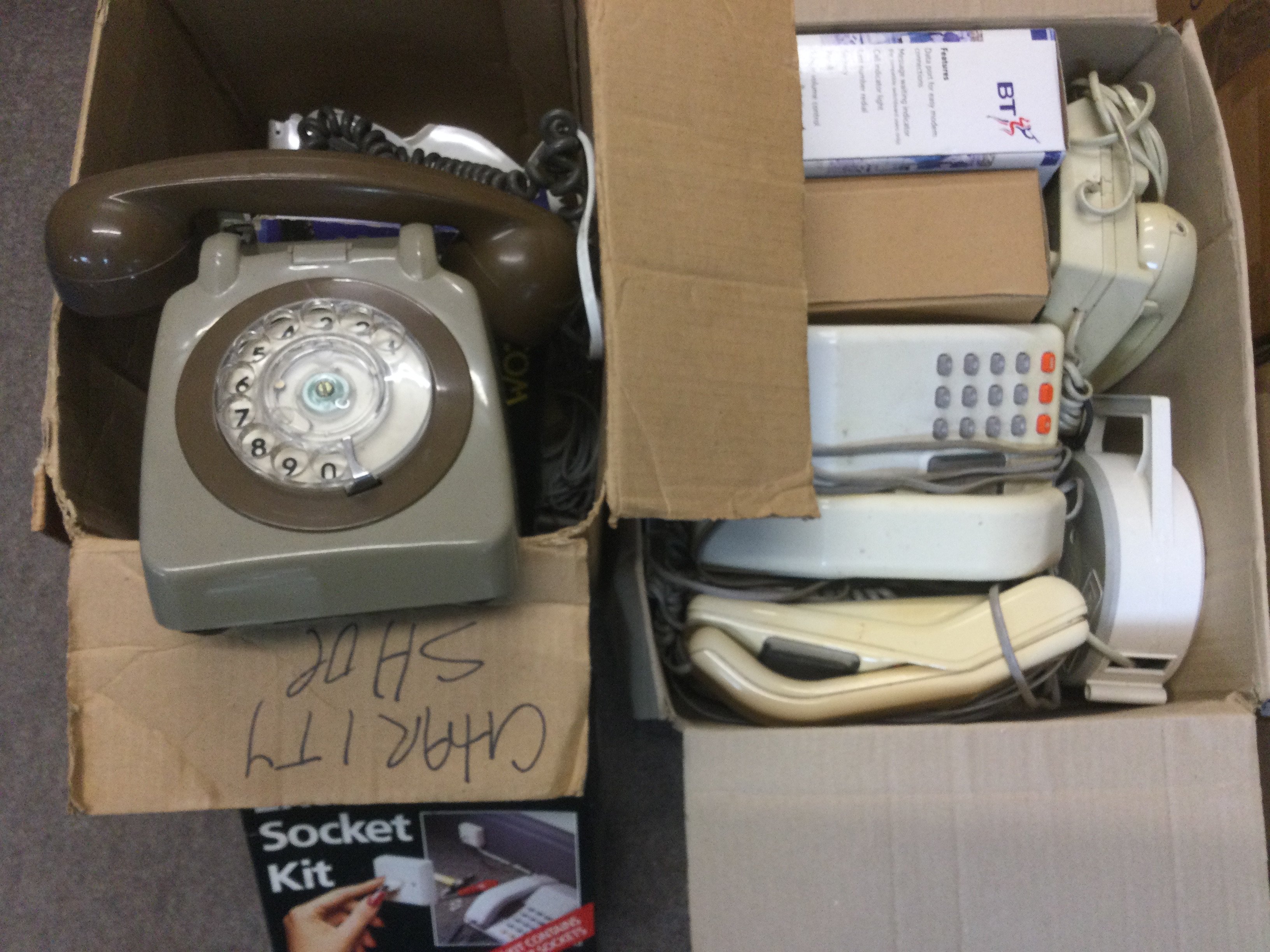 Two boxes of vintage telephones including a rotary dial example. Shipping category D. NO RESERVE