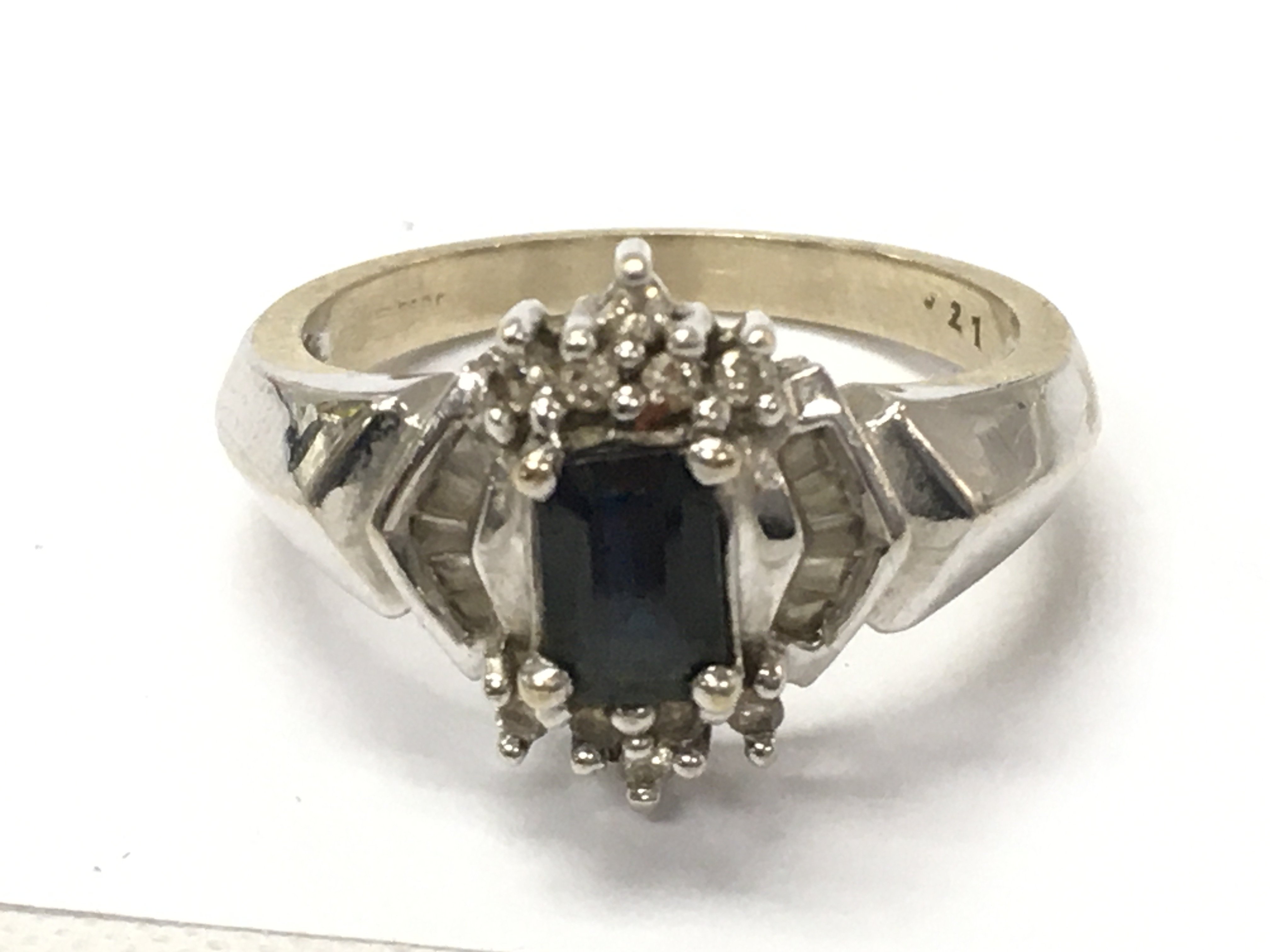 An 18ct white gold sapphire and diamond cluster ring, 5.7g total weight. Postage category A