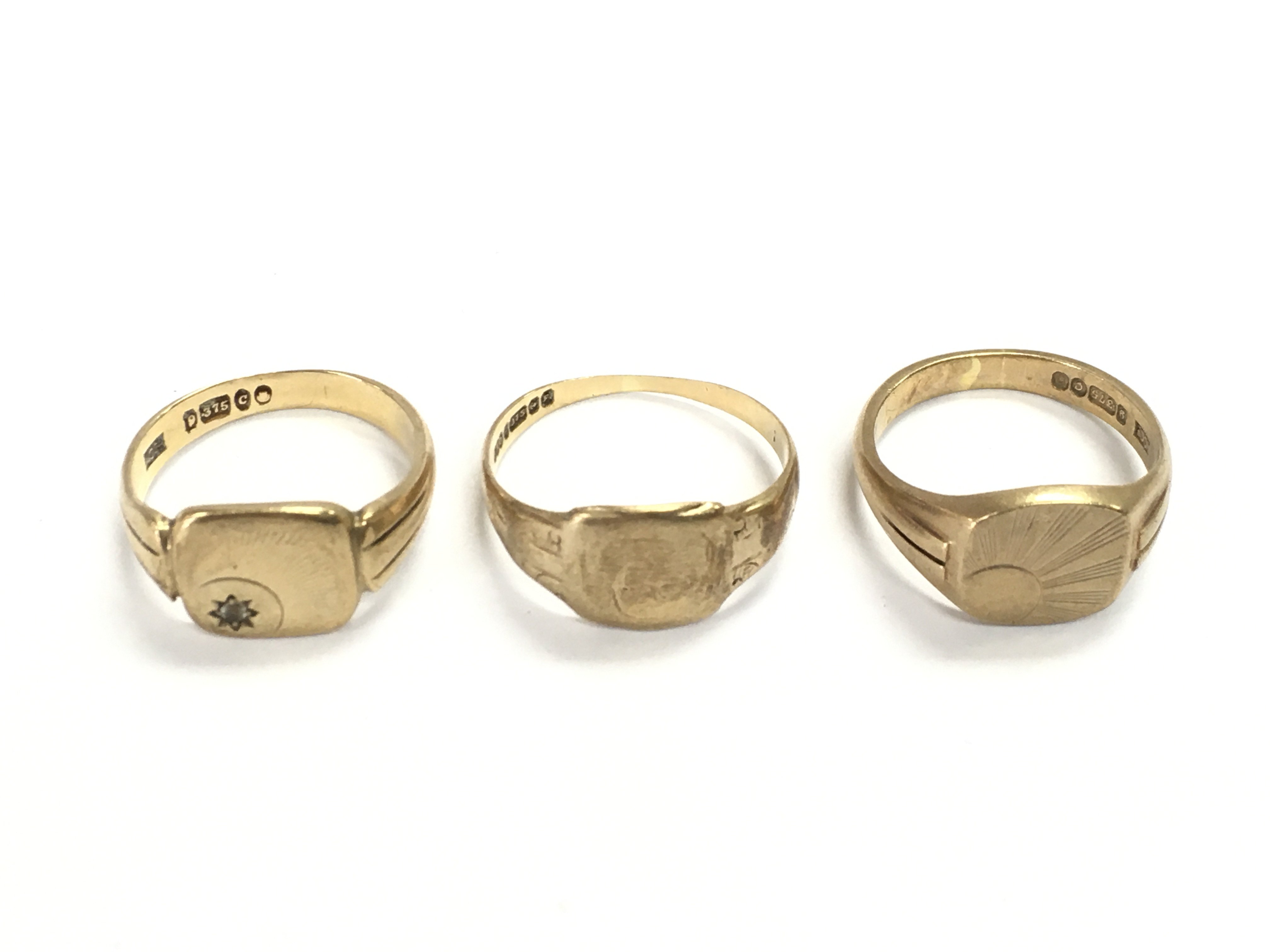 Three 9ct gold gents rings. 15.80g total. Postage A