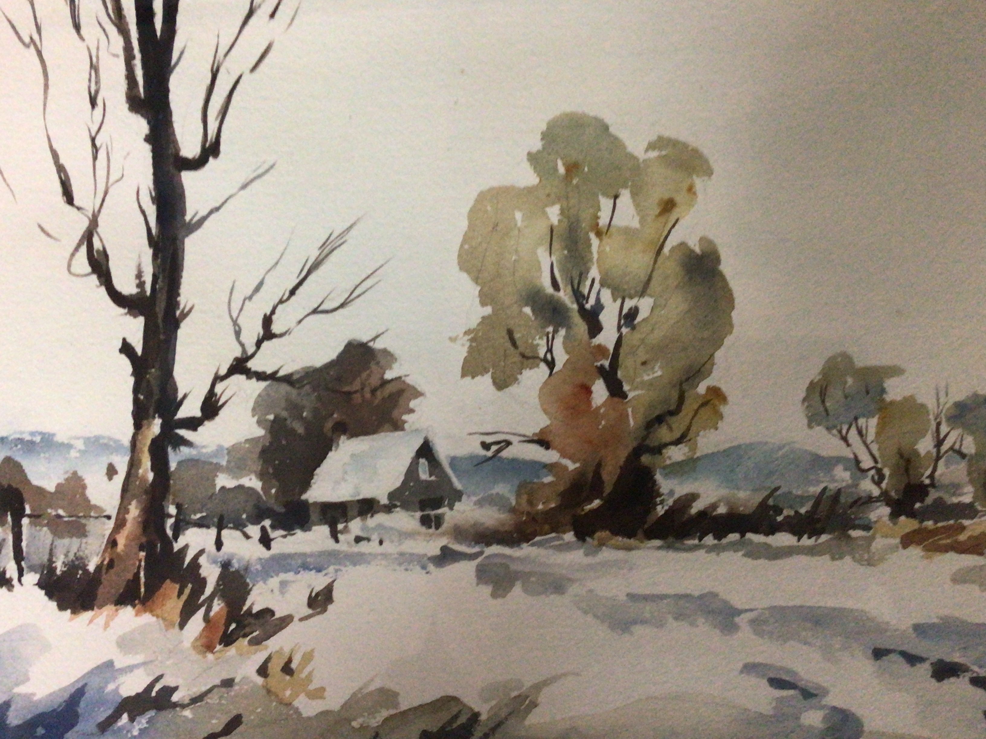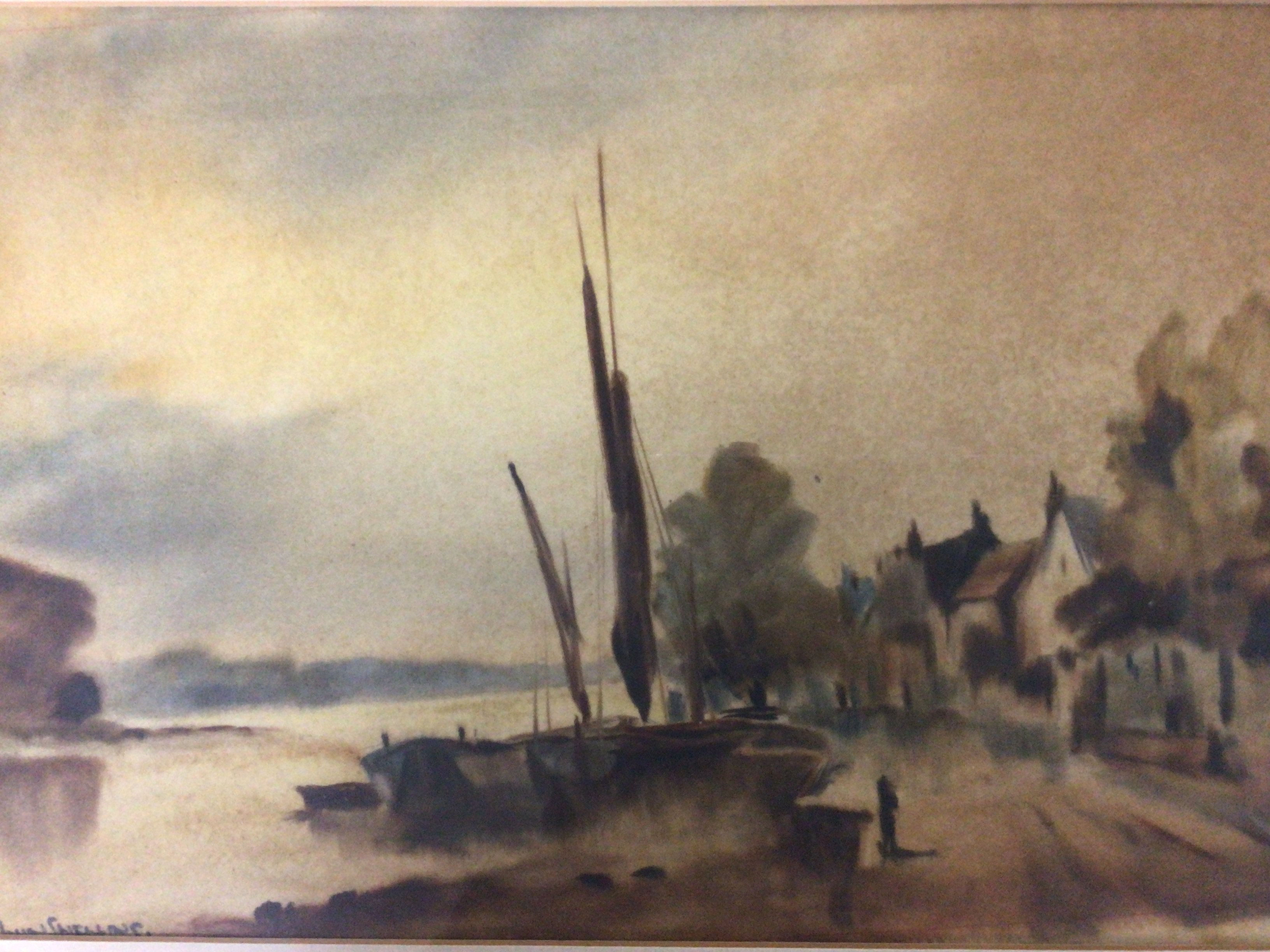 Two framed watercolours by John Snelling a winter landscape and moored sailing barges and one other watercolour a London street scene by G Roy Hammond. (3) NO RESERVE