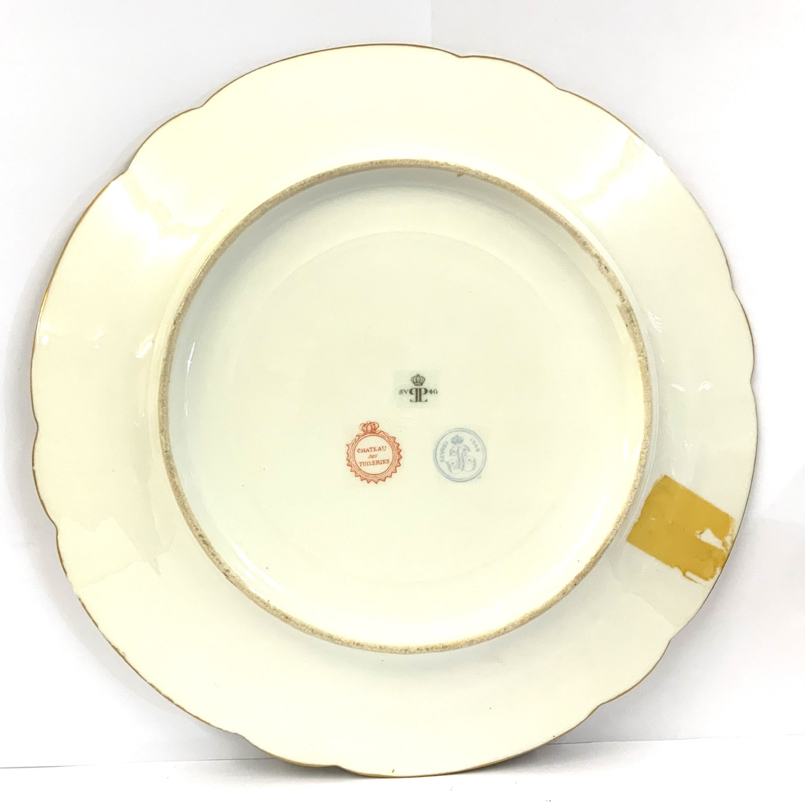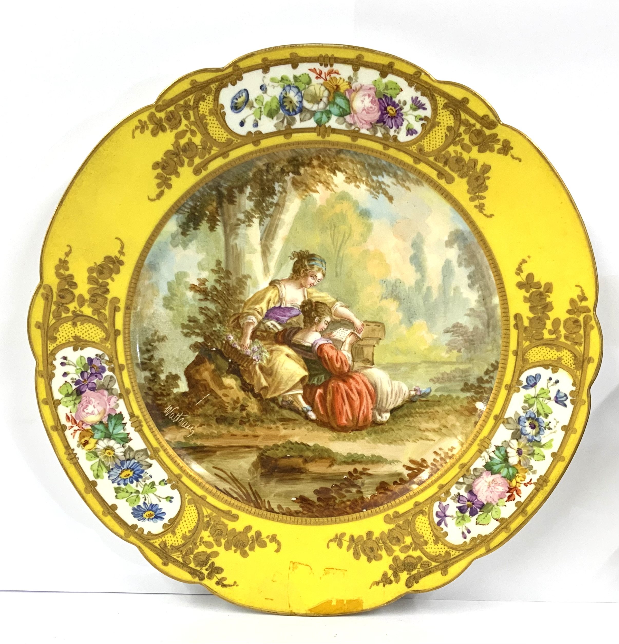 A 19th century Sevres Chateau des Tuileries porcelain cabinet plate, circa 1840s, with yellow border the centre hand decorated with 2 ladies reading, signed 'Watteau', with stamps to underside, 24cm diameter. (D) no viable damage or restoration.