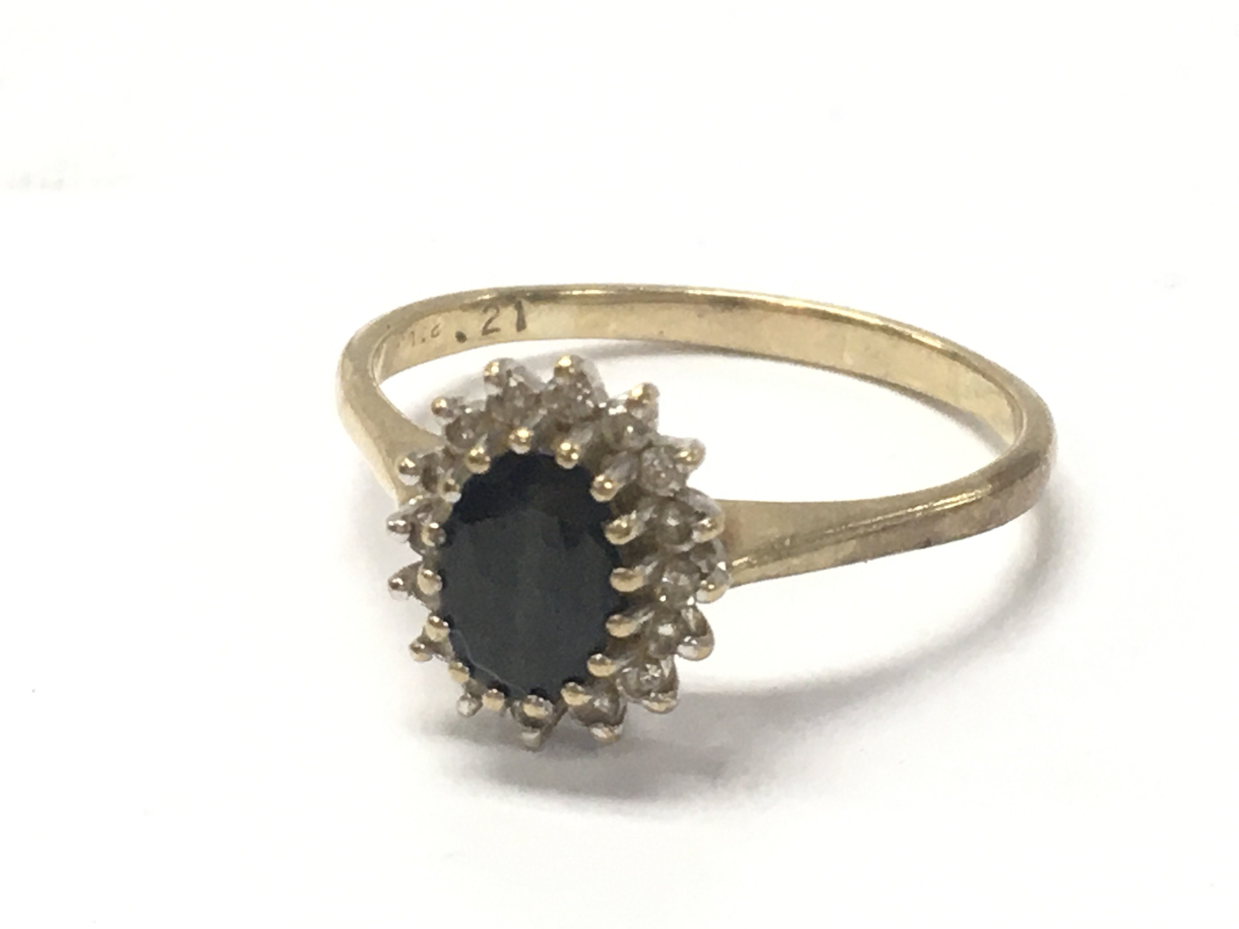 A 9ct gold sapphire and diamond cluster ring, 2.6g. Postage category A