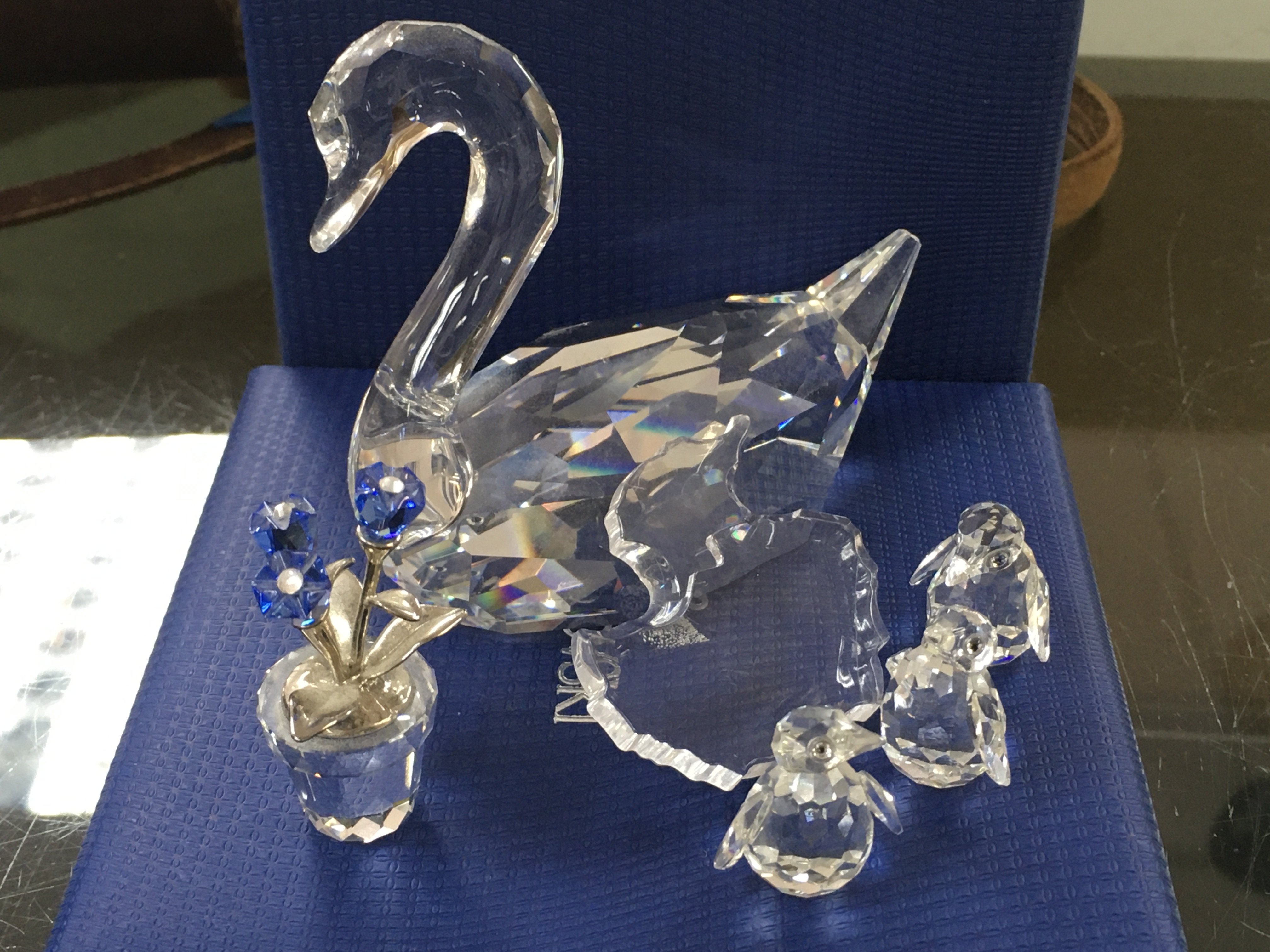 A Swarovski boxed swan, three miniature baby birds with slightly larger bird shaped base, together with a miniature Swarovski flower group