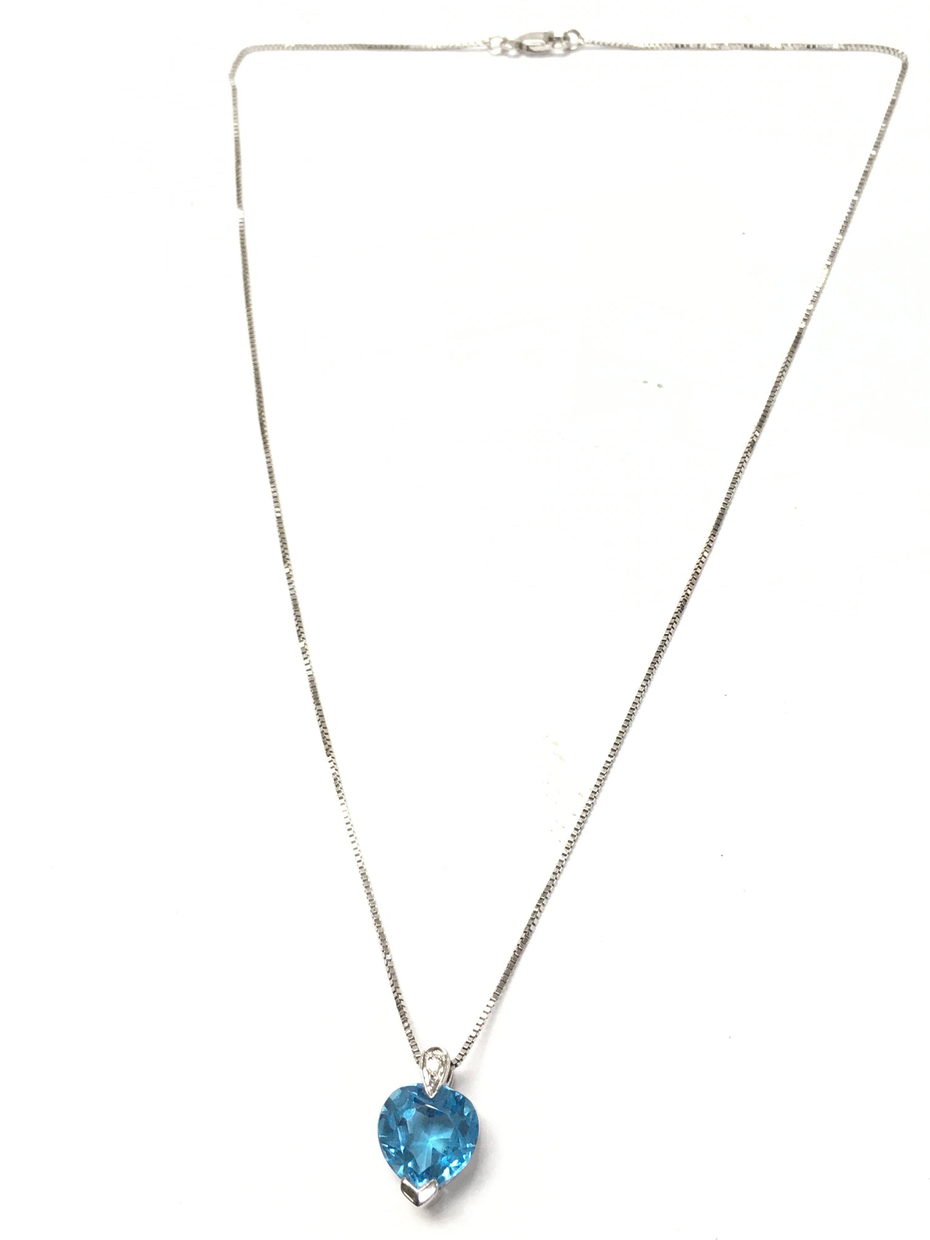 A 14ct white gold chain with a blue stone pendant On a 9ct white gold mount inset with a small diamond stone , 3.6g total weight . Postage catA