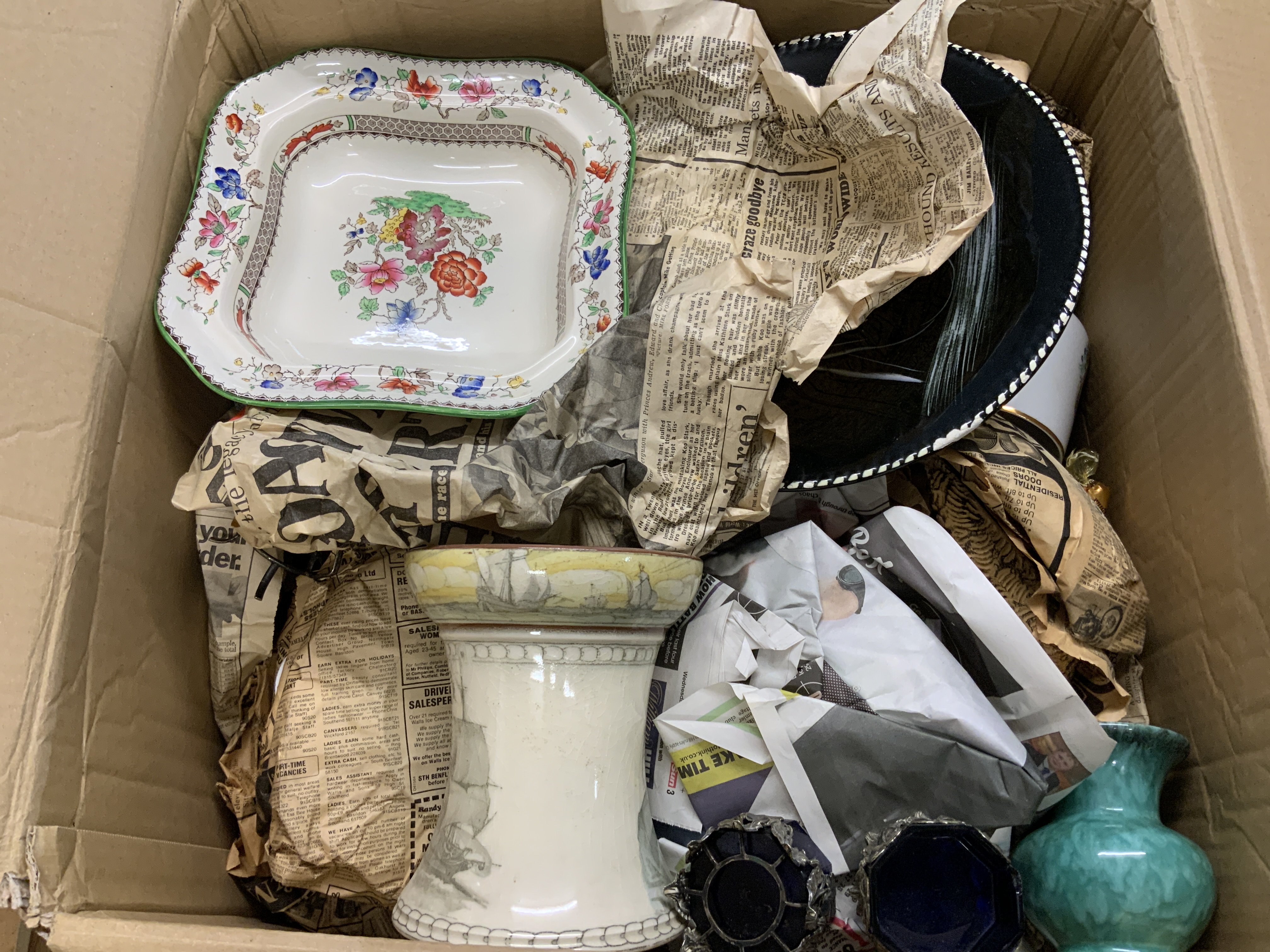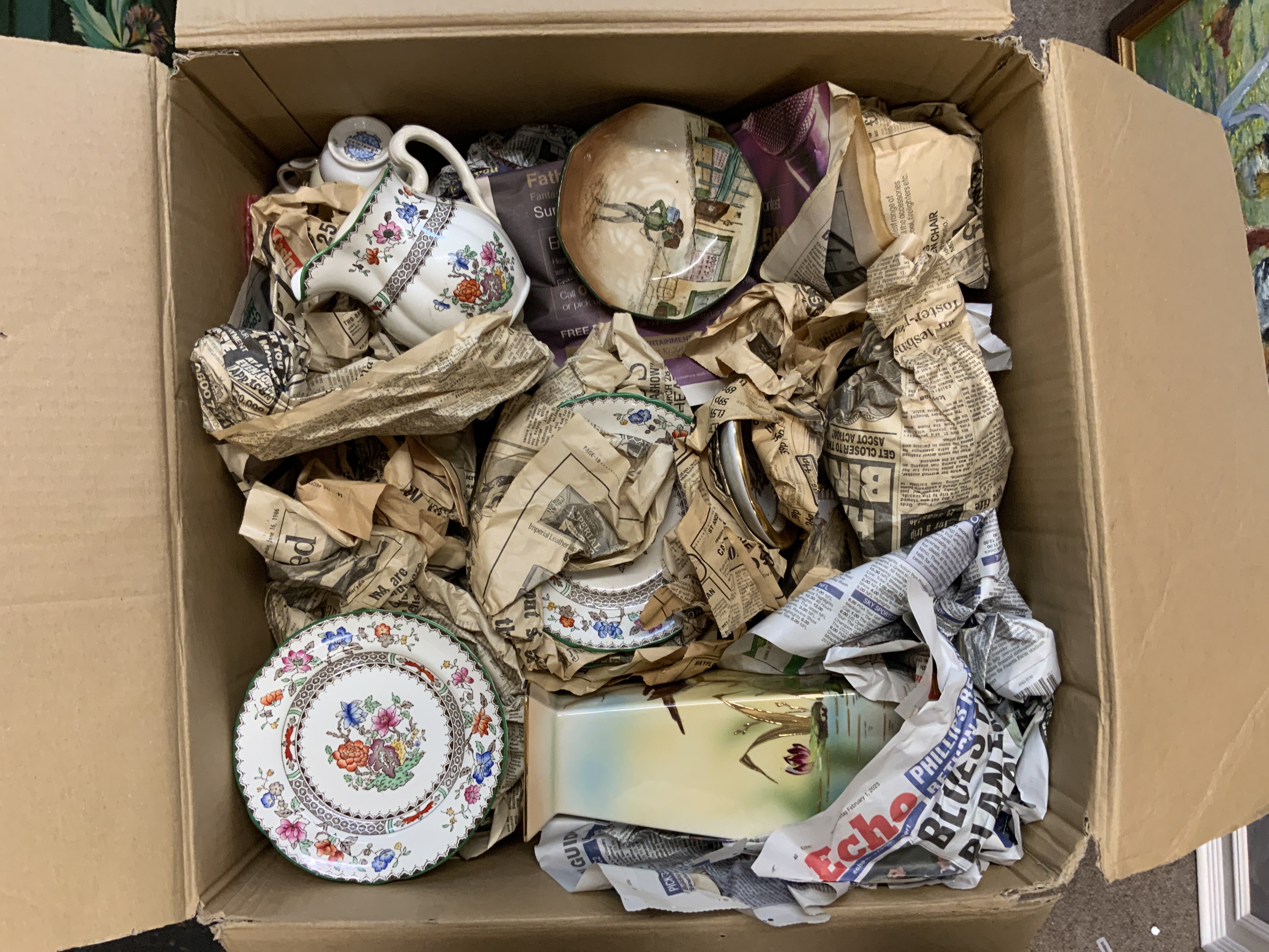 A large collection of various ceramics and glassware. (4 Boxes). (D) collection includes a selection of co[eland Spode Chinese Rose.
