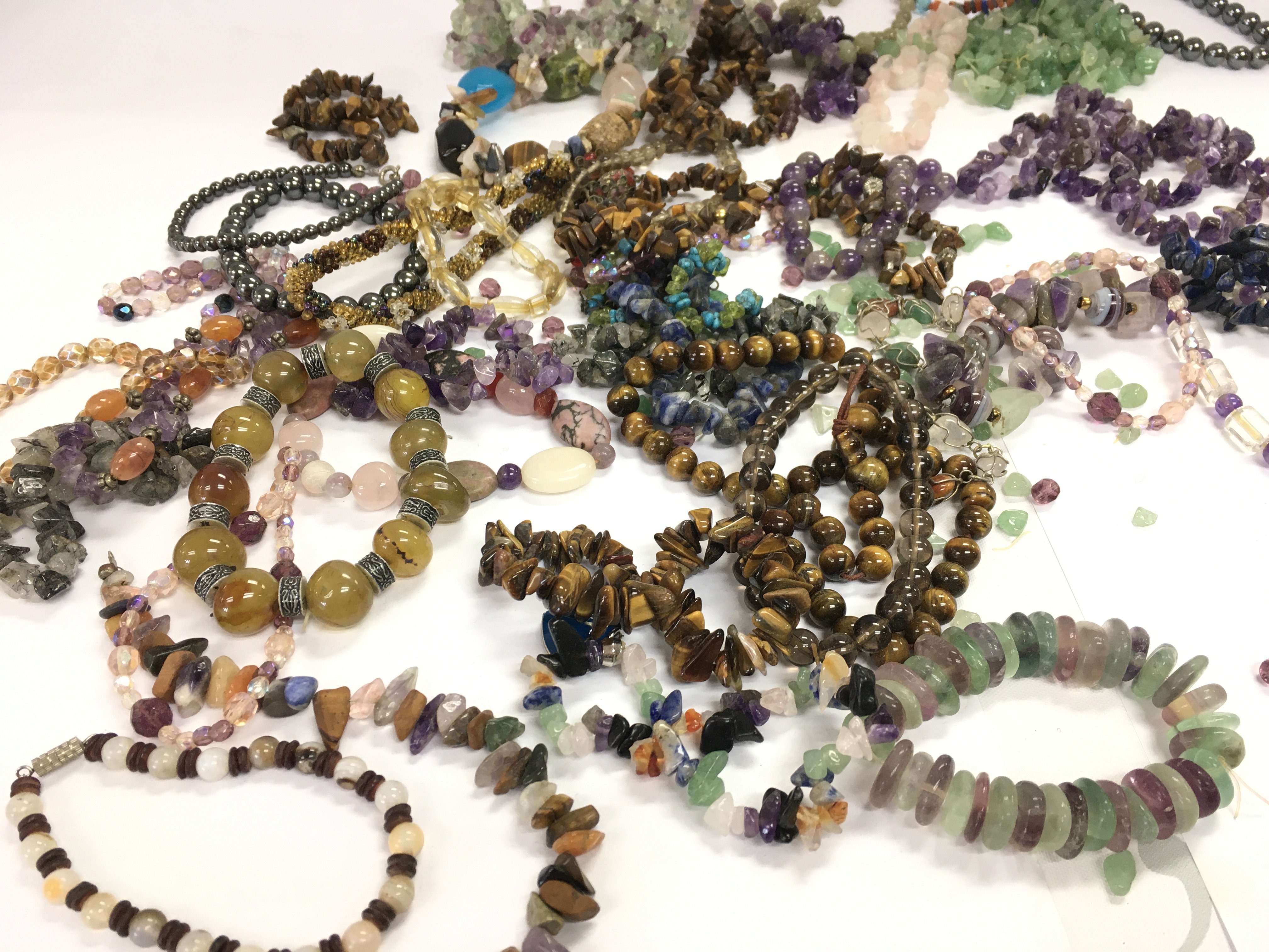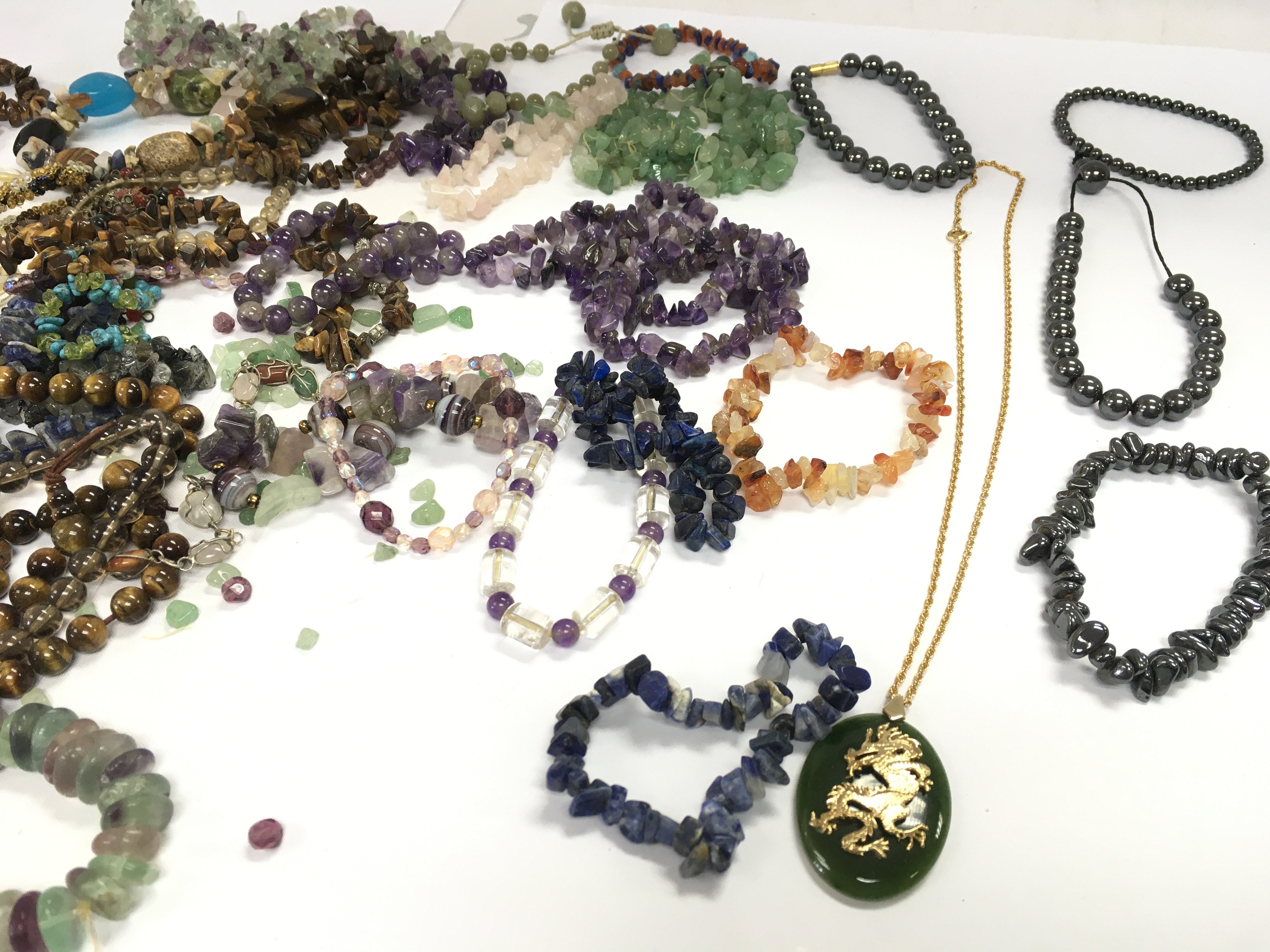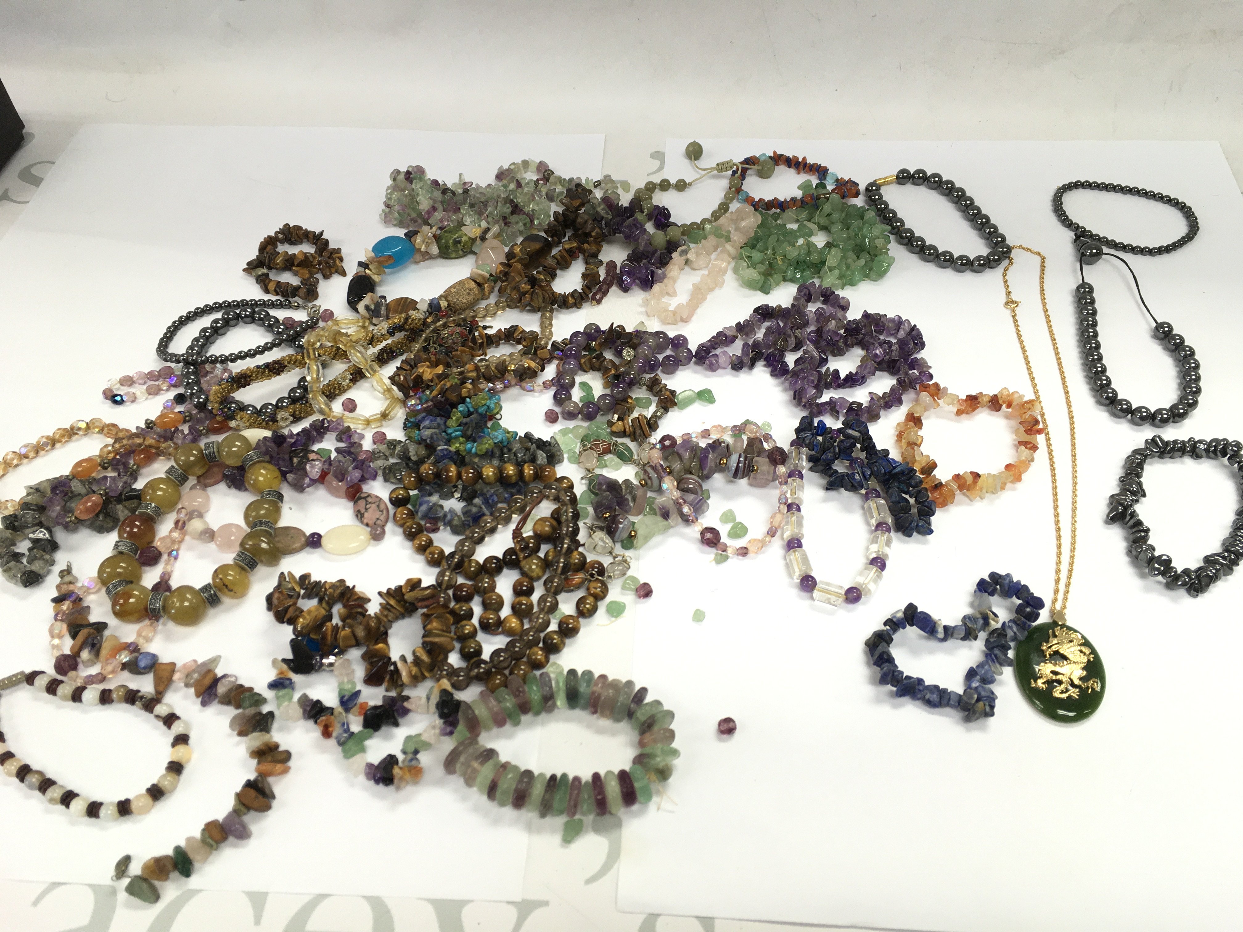 A collection of approx 40 semi precious stones and polish stone necklaces. Postage B