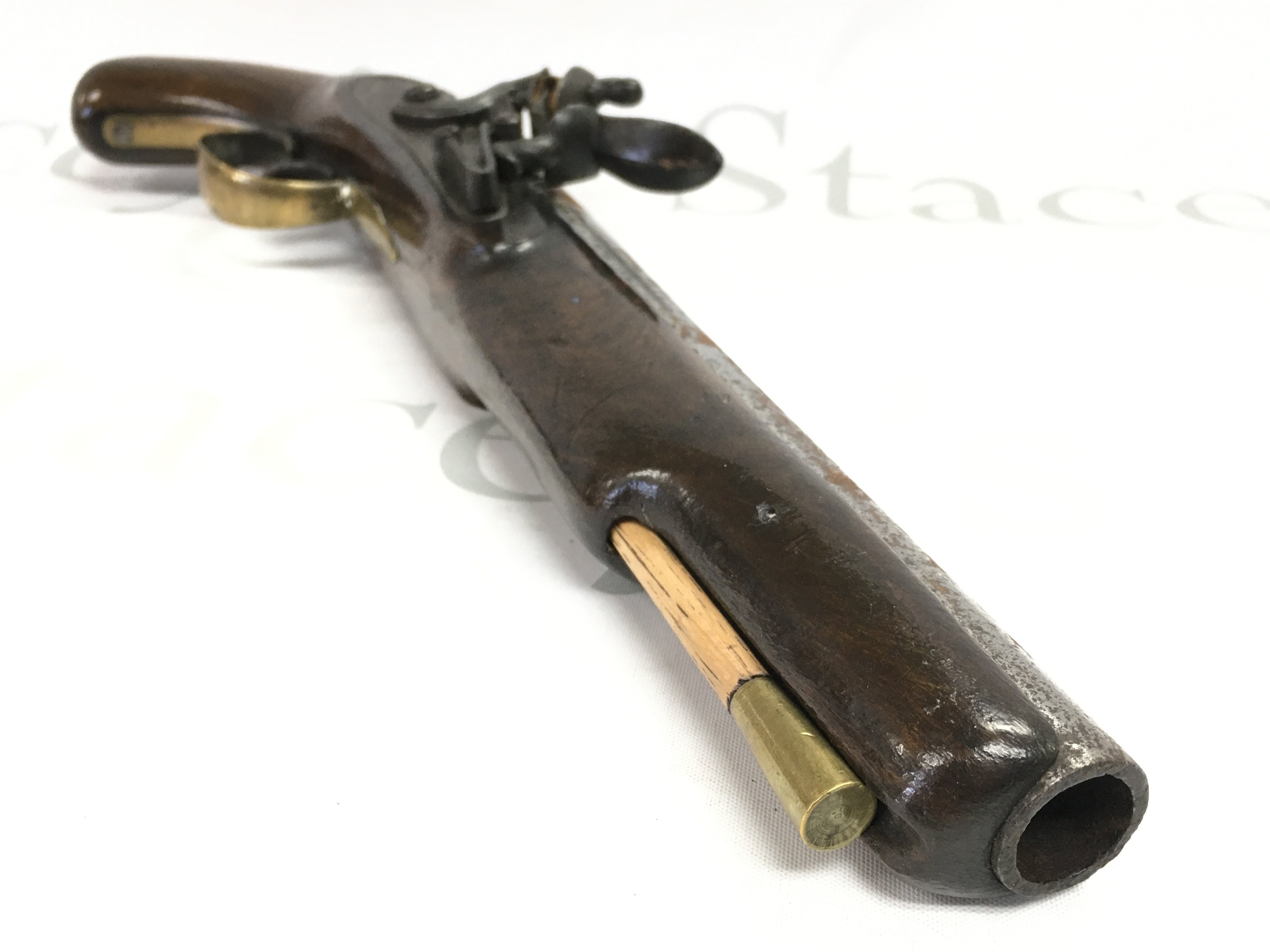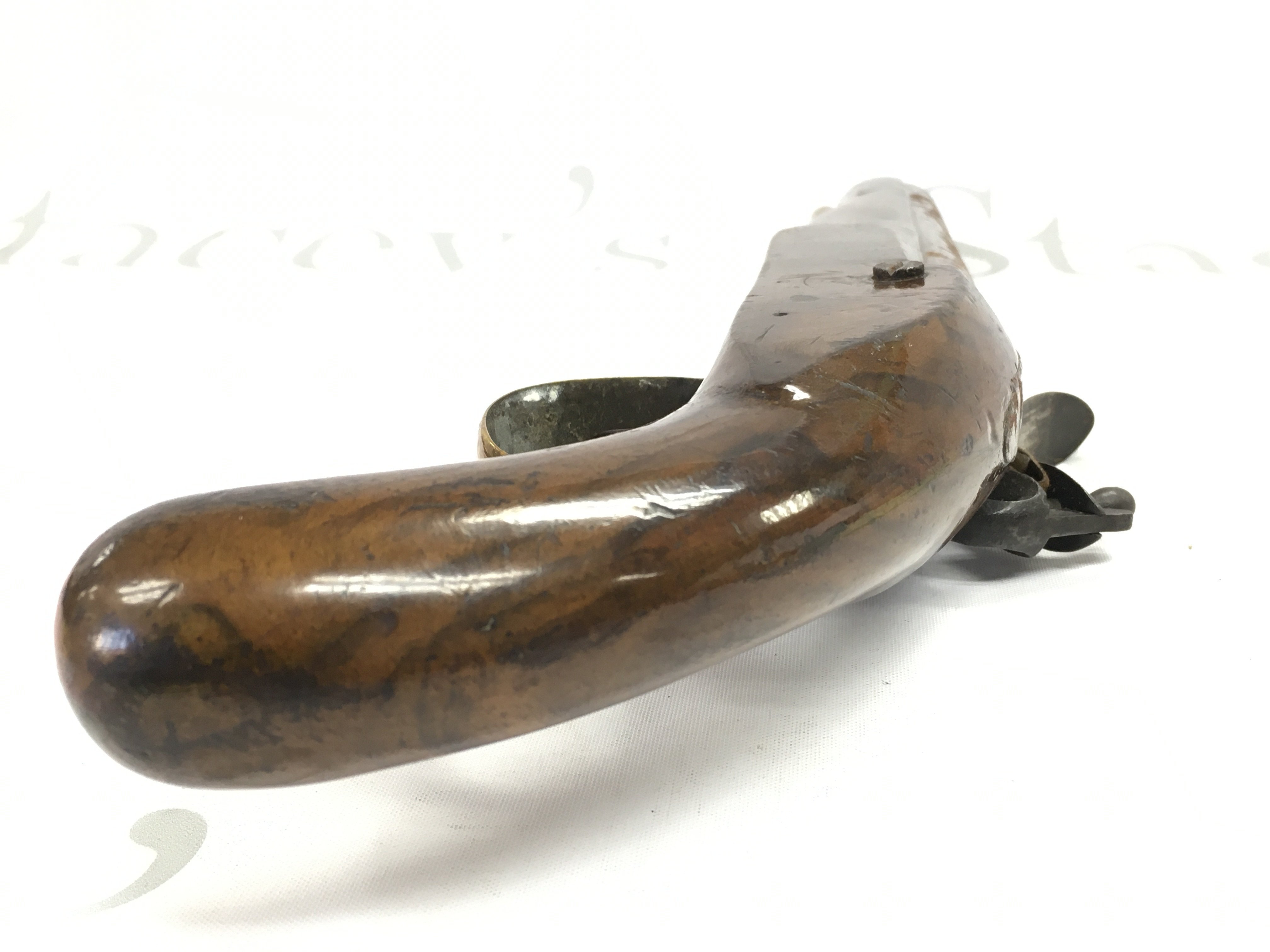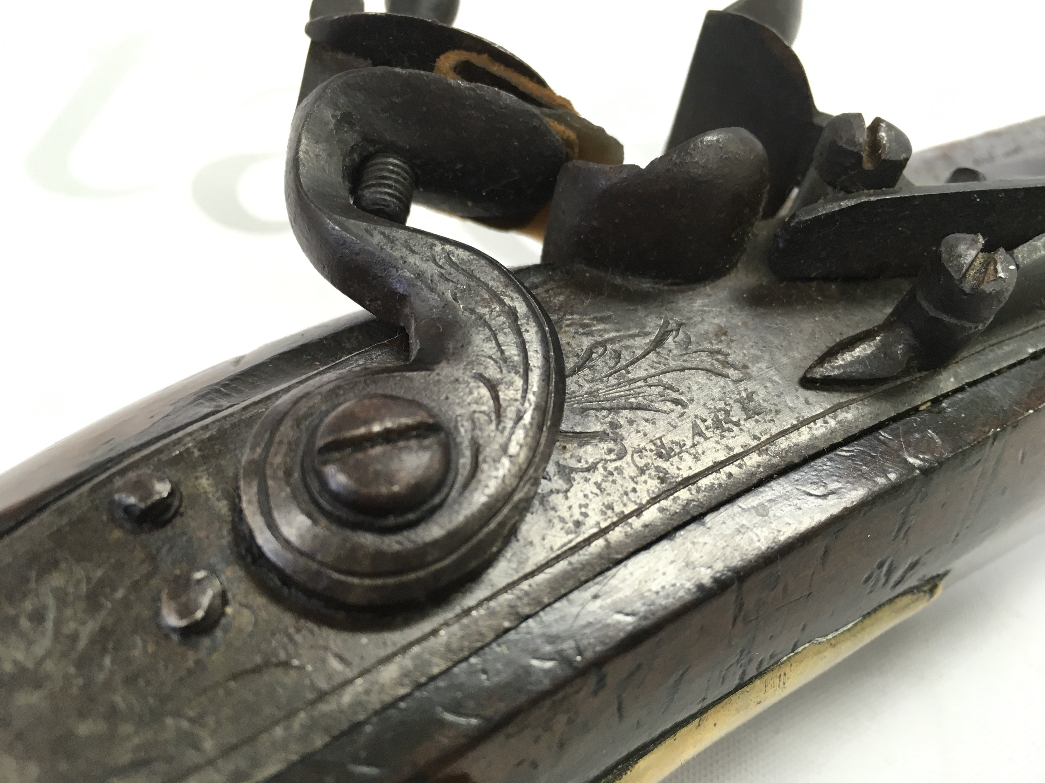 A flintlock pistol with a steel barrel by Clark of London , fair condition. Total length approximately 36.5cm, barrel approximately 23cm long.