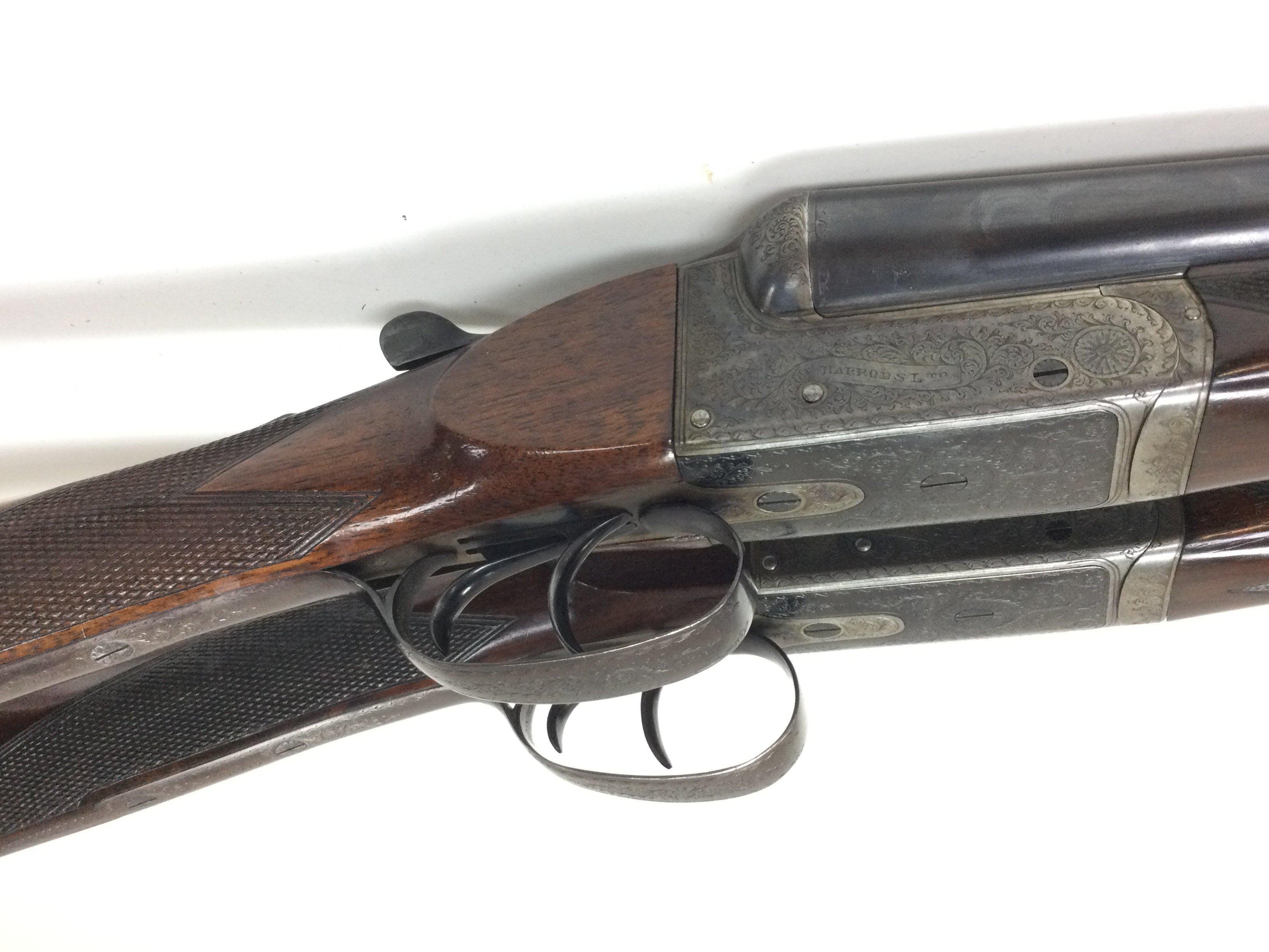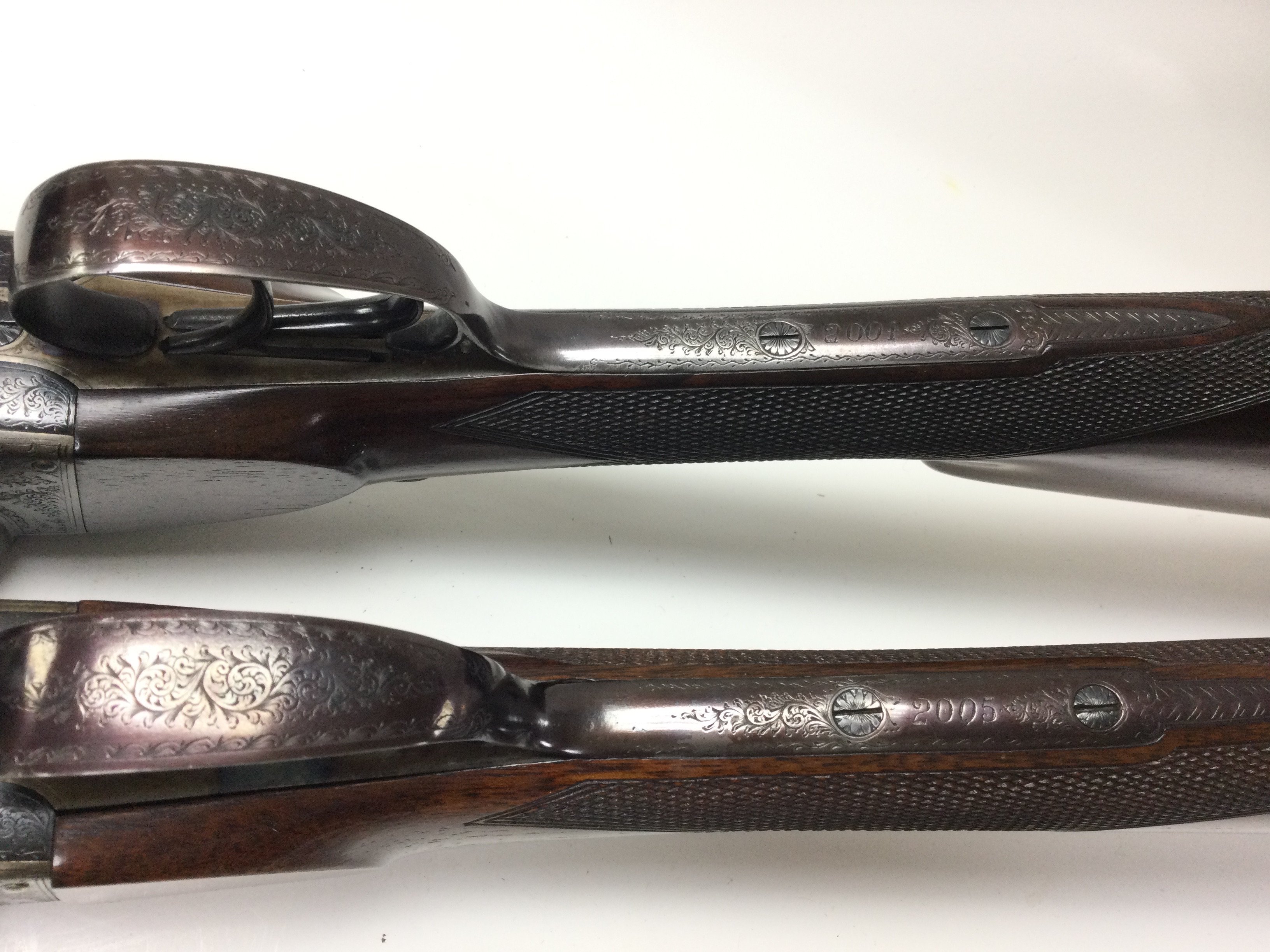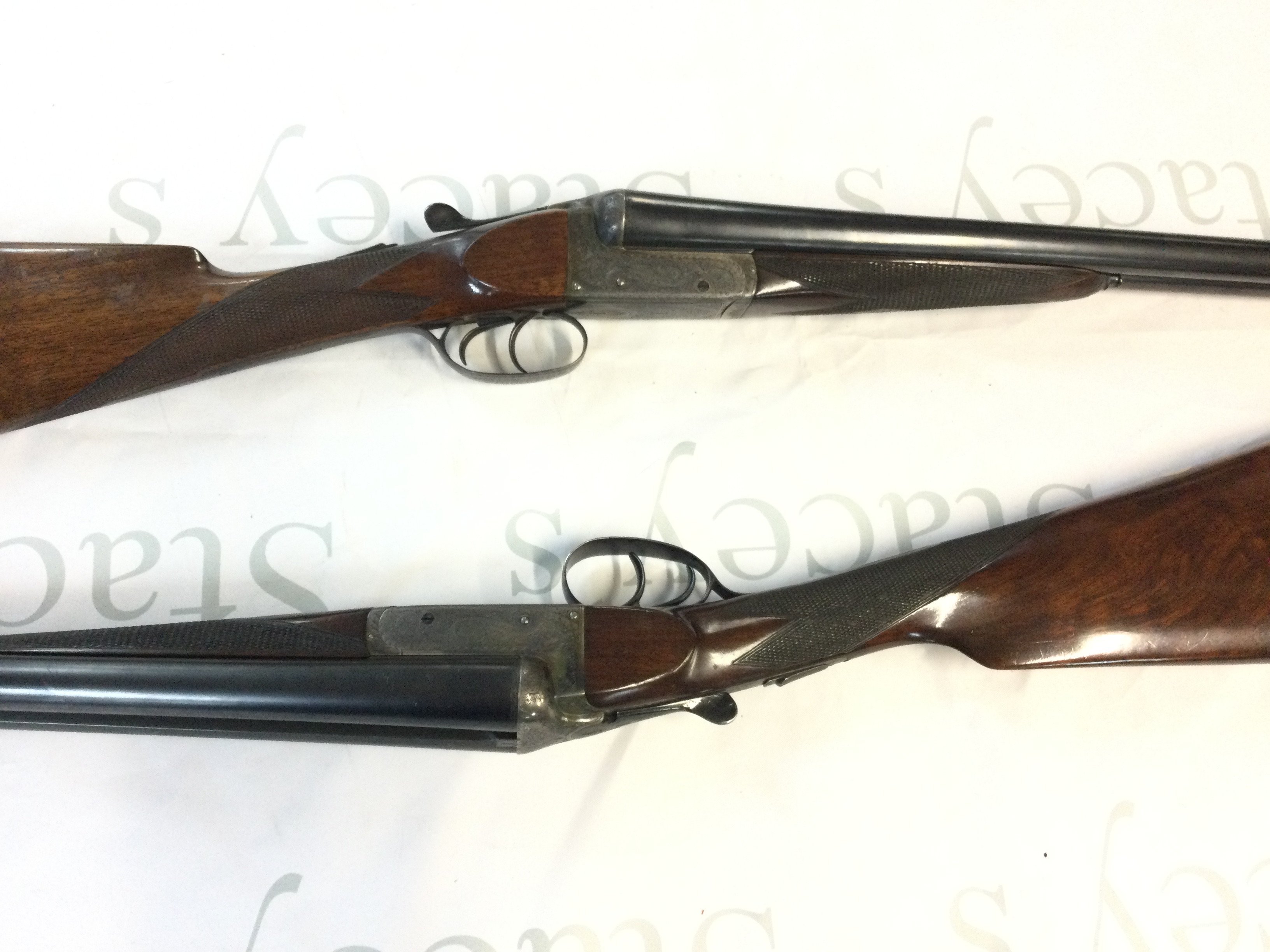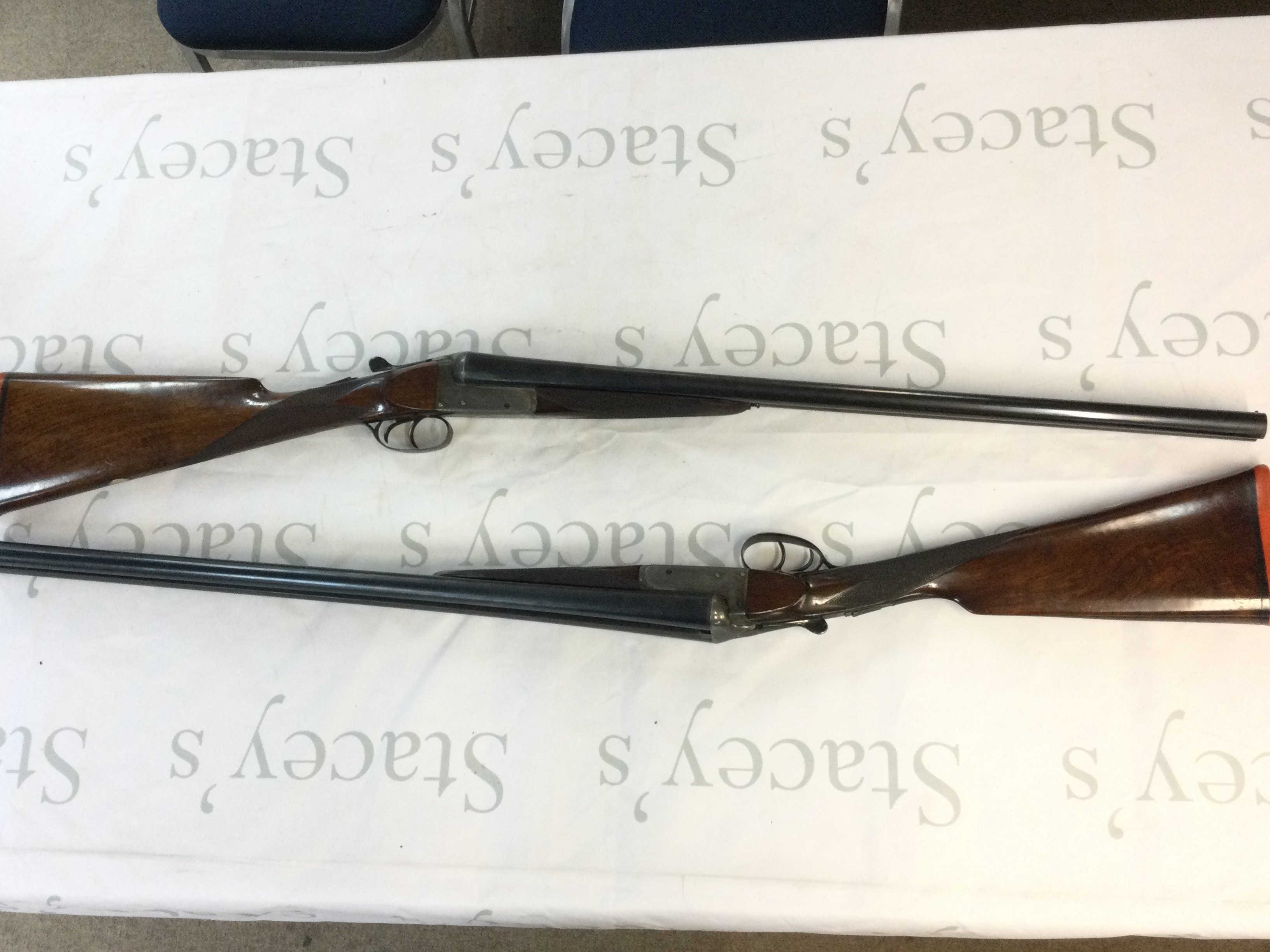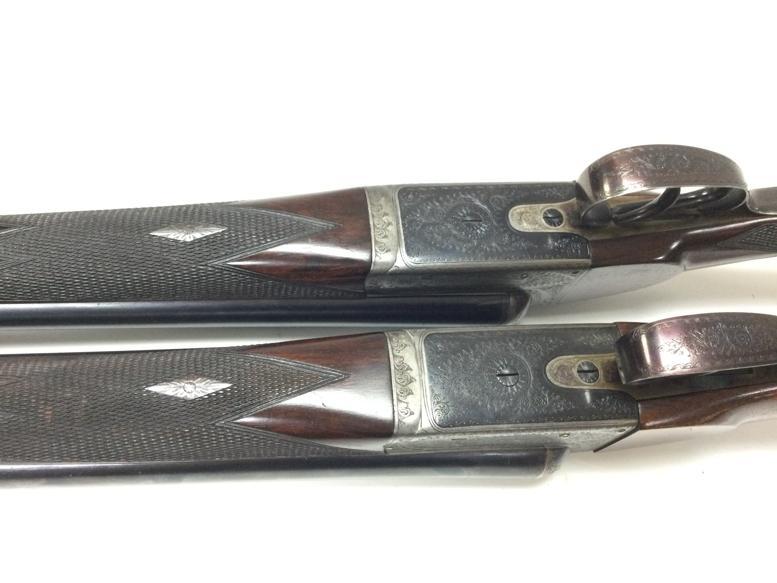 A pair of quality numbered 1 & 2 side by side shotguns attributed to churchill guns for Harrods Ltd in a fitted leather case. Walnut stock with chequered grip and twin triggers. 63cm barrels and 105cm overall length. PLEASE NOTE THAT A SHOGUN LICENSE IS REQUIRED TO PURCHASE THIS LOT. VIEWING AND COLLECTION IS BY APPOINTMENT ONLY.