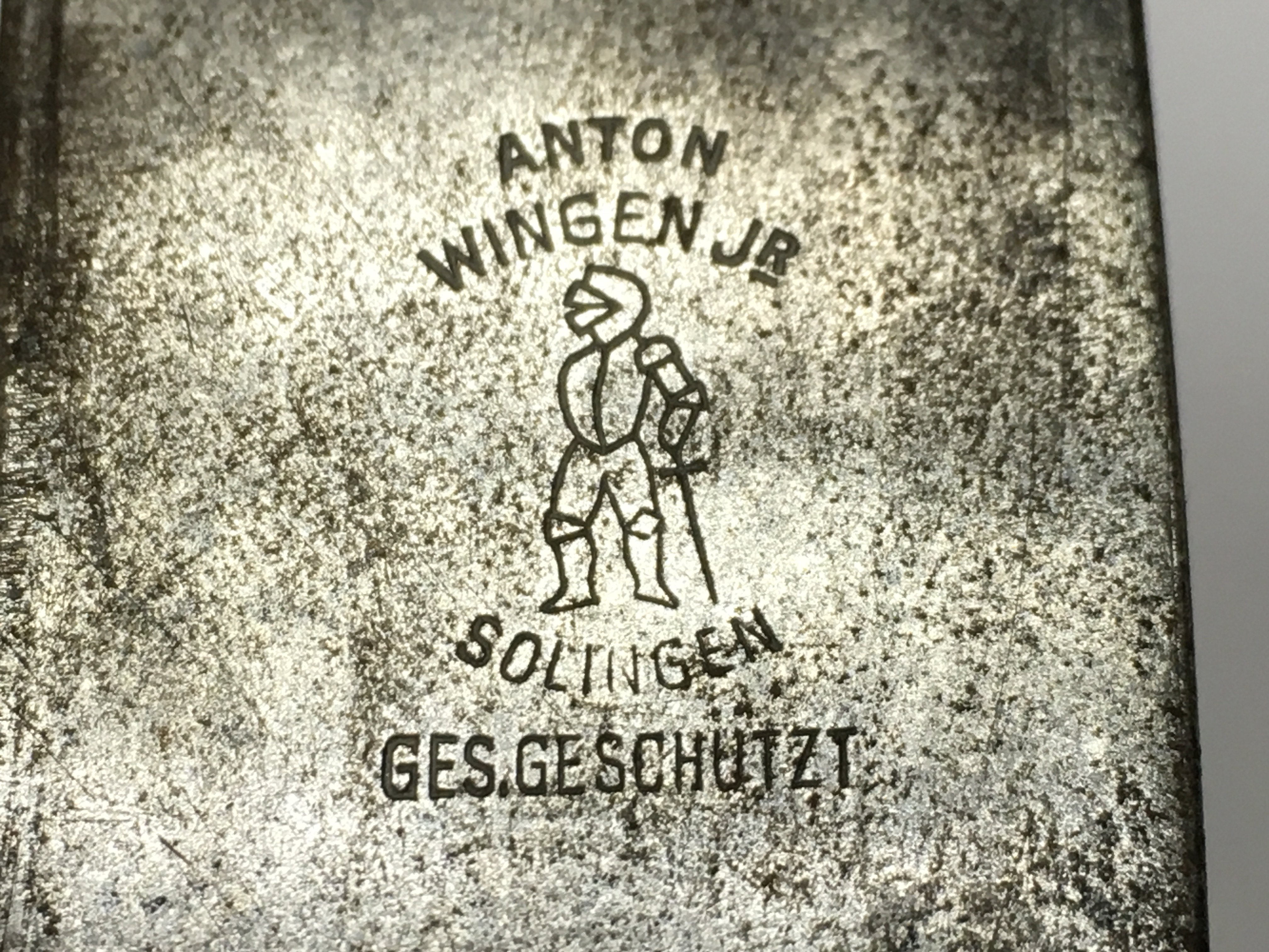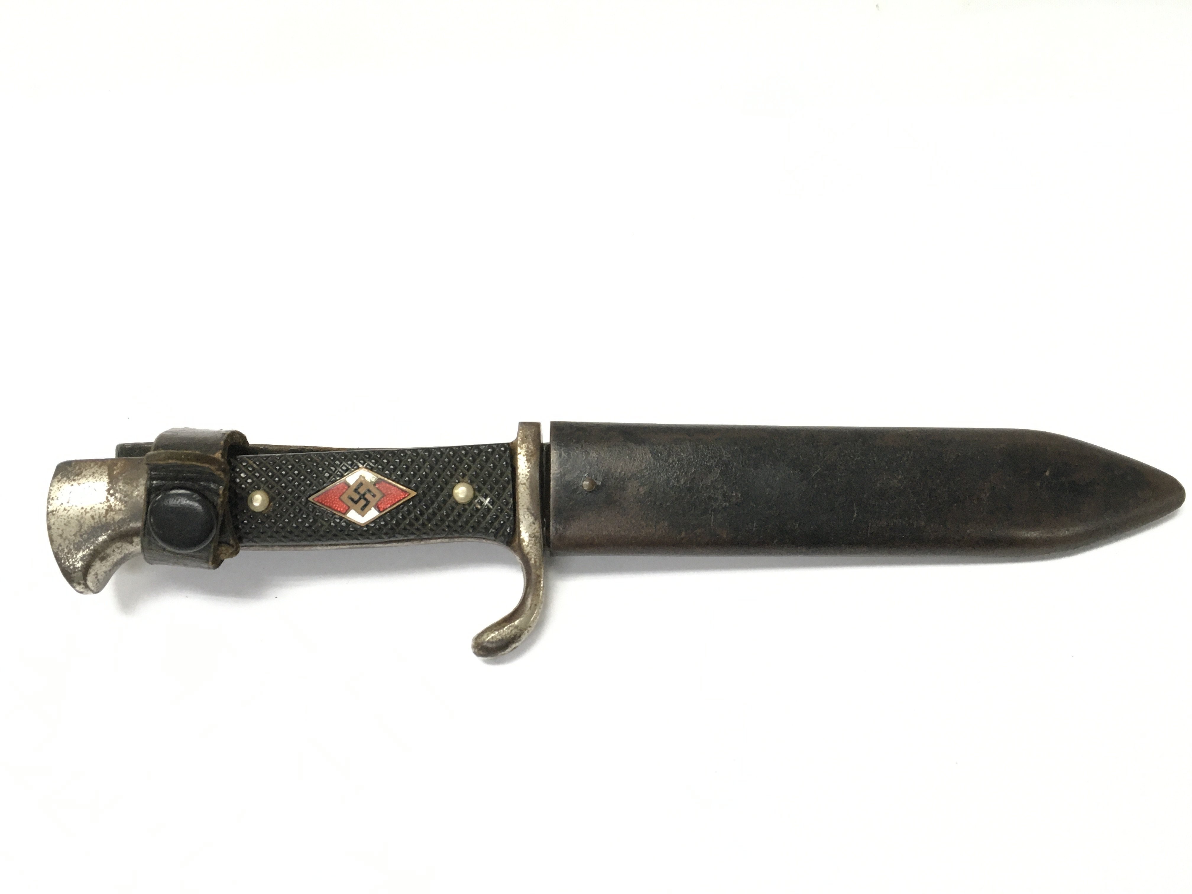 A Hitler Youth knife, by Anton Winger jr, Solingen. Blade etched with Blut und Ehre motto. With original scabbard. Blade 13cm long. Total length 24cm. This lot cannot be posted